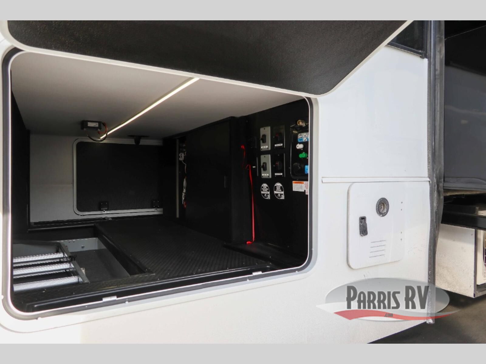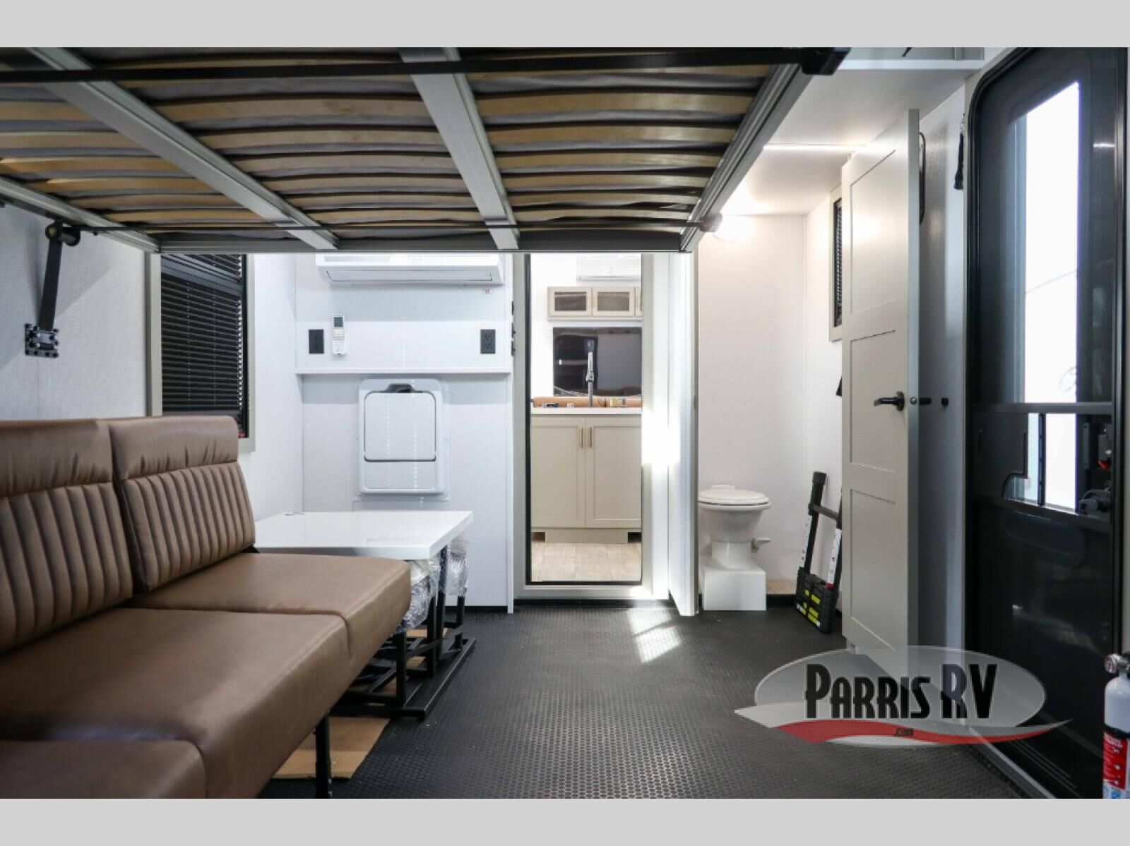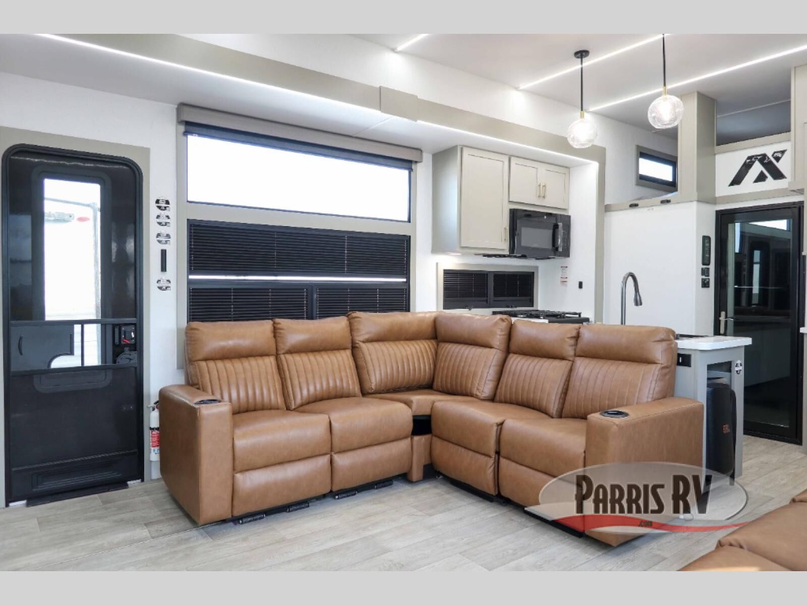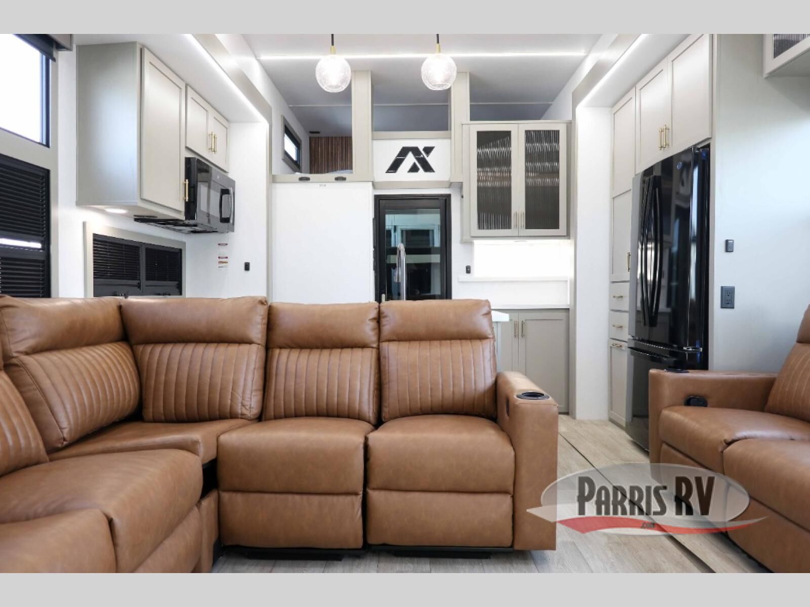 Load up your motorcycles or side-by-side for fun adventures at the campground! There is a 14' 6" garage with one of the dual entry doors to the unit, along with a 60" x 100" mega bed, half bath, fold-down garage sink, plus a loft for even more sleeping space. As you head into the kitchen and living room, you'll find an island peninsula for ample counter space, a large sofa within the slide out, plus an L-shaped sofa with a patent-pending AX ottoman/table. The full bath is right next to the front private bedroom, complete with a king bed tilt and large slide out with generous storage space!