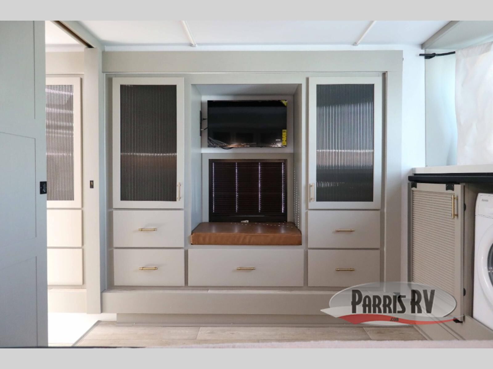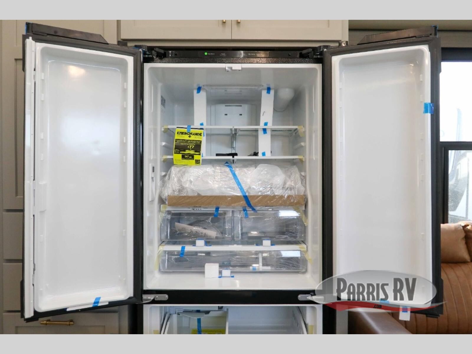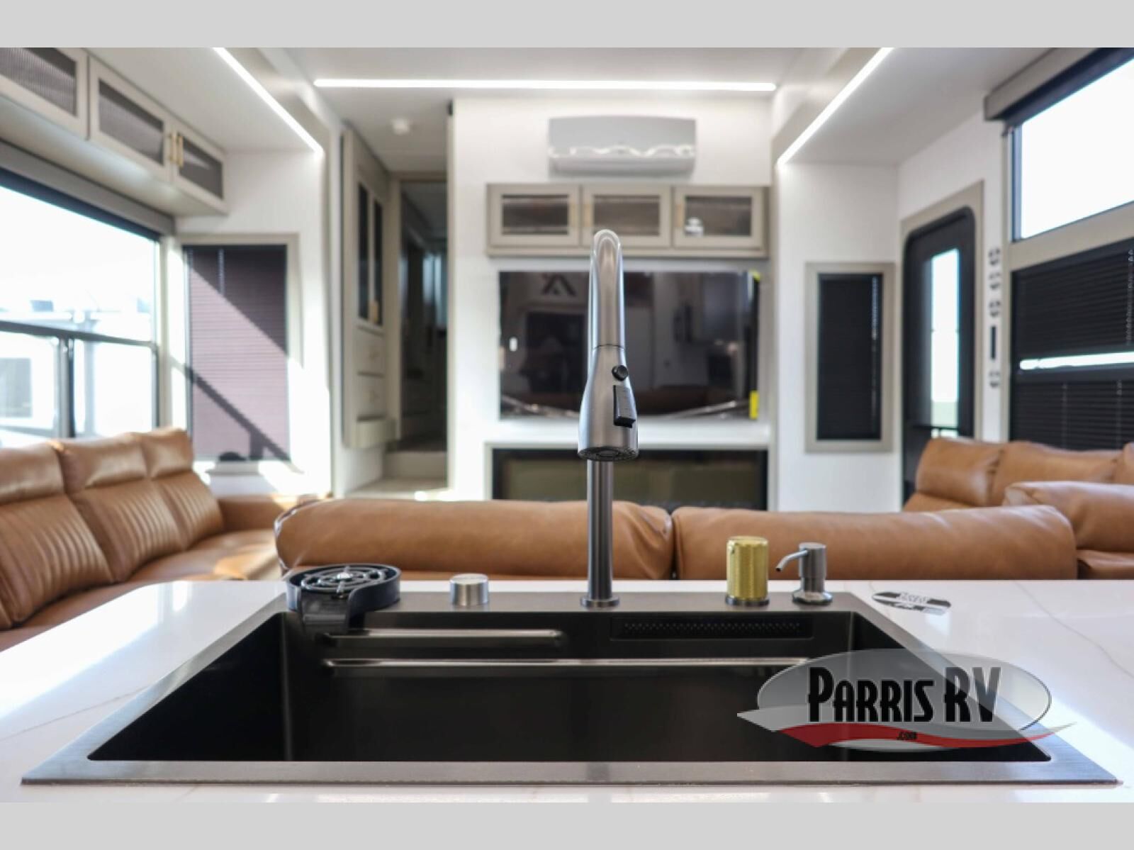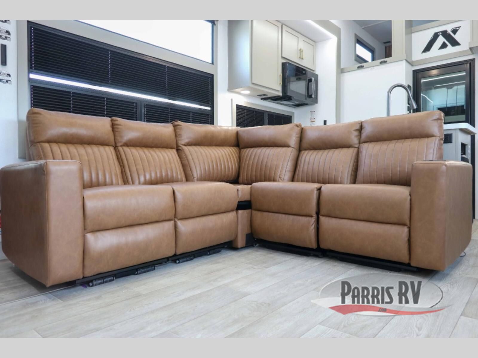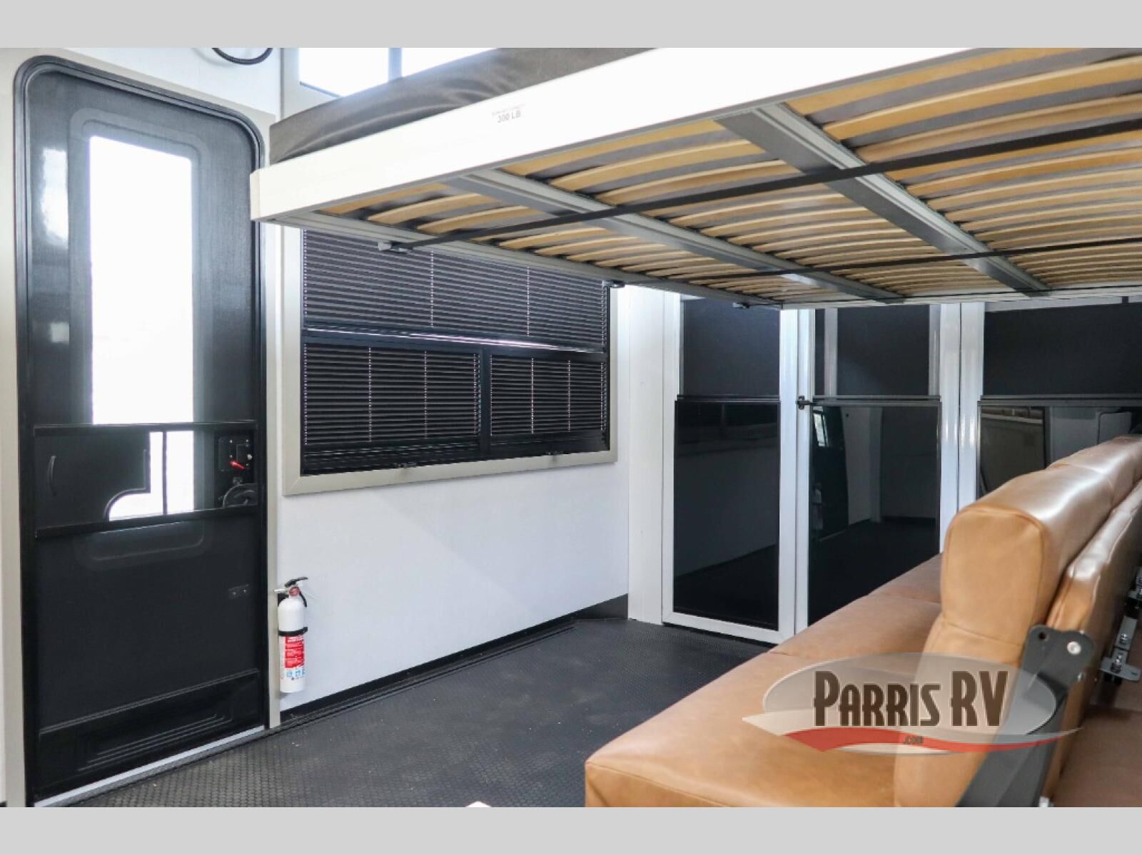 Load up your motorcycles or side-by-side for fun adventures at the campground! There is a 14' 6" garage with one of the dual entry doors to the unit, along with a 60" x 100" mega bed, half bath, fold-down garage sink, plus a loft for even more sleeping space. As you head into the kitchen and living room, you'll find an island peninsula for ample counter space, a large sofa within the slide out, plus an L-shaped sofa with a patent-pending AX ottoman/table. The full bath is right next to the front private bedroom, complete with a king bed tilt and large slide out with generous storage space!