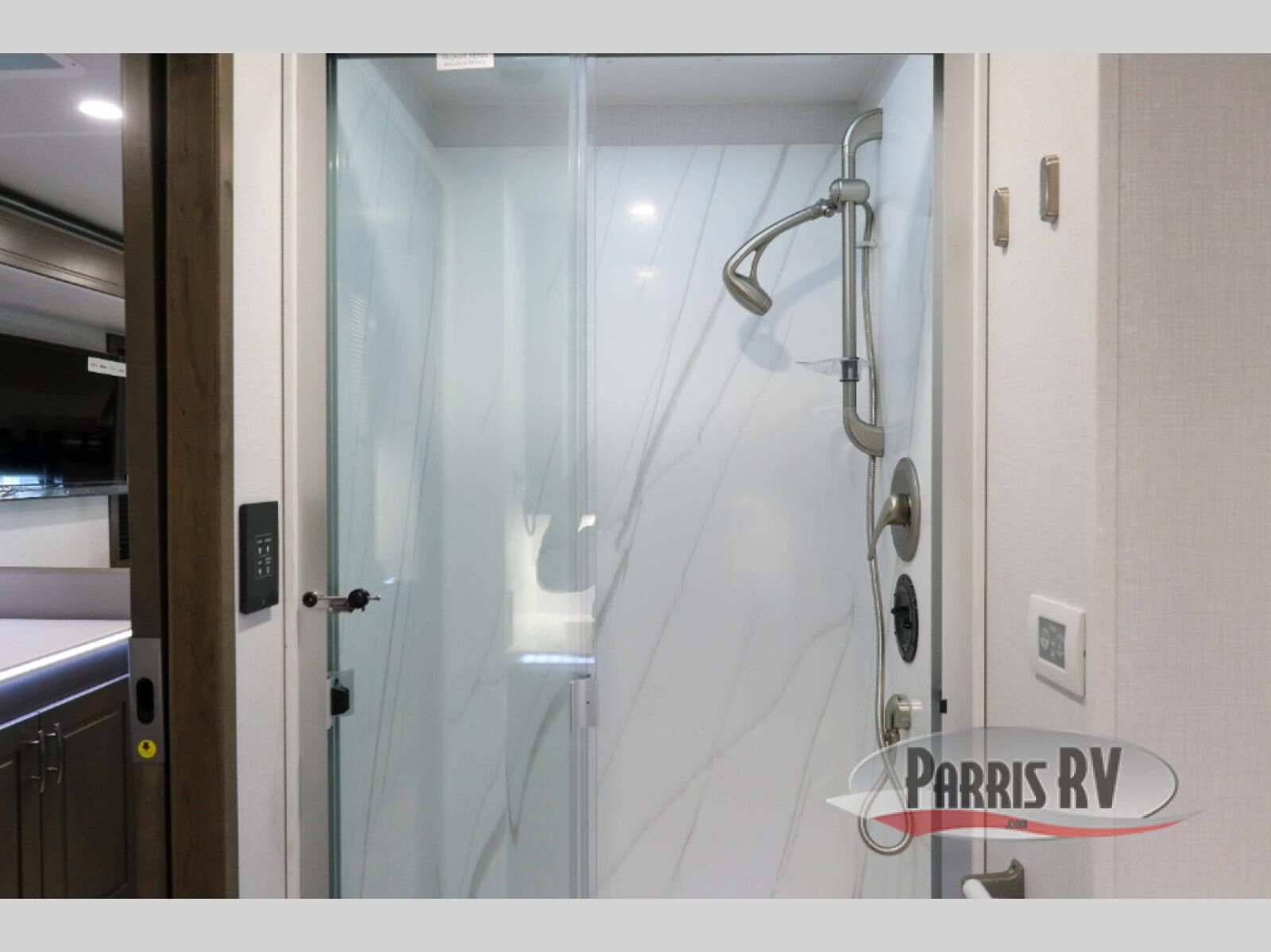 Check out the fabulous features found in this DX3 Super C diesel motorhome! As you spend your nights relaxing in the rear private bedroom with a king bed slide, you will appreciate having a 32" LED TV to watch before drifting off to sleep. The Solid Surface Shower surround with glass door and skylight will be wonderful to see in the morning, and the Oxygenics Body Spa shower head will deliver an enjoyable experience. Step foot into the kitchen and be amazed by the home-like conveniences that have been included, like the 16-cubic foot residential refrigerator with an ice maker, the convection microwave, the pantry, and the overhead cabinet accent and under-cabinet lighting.