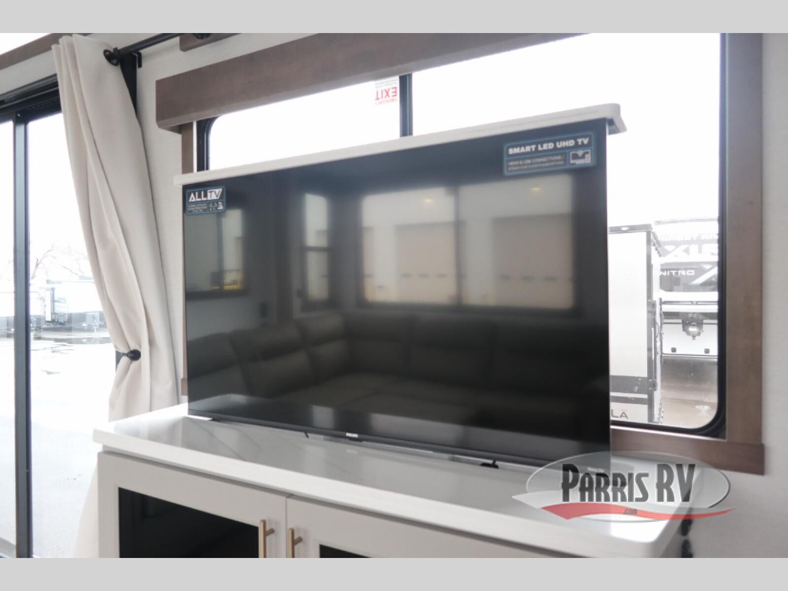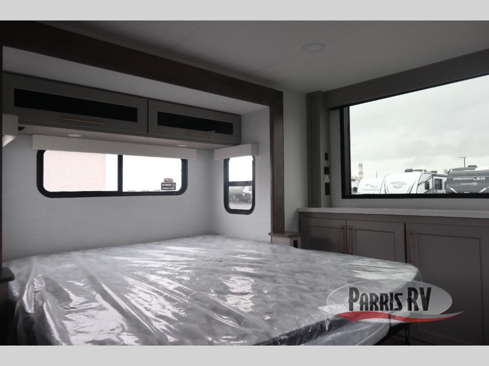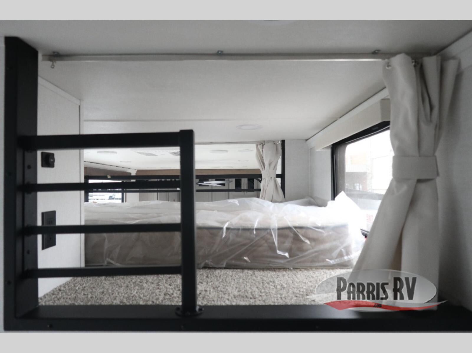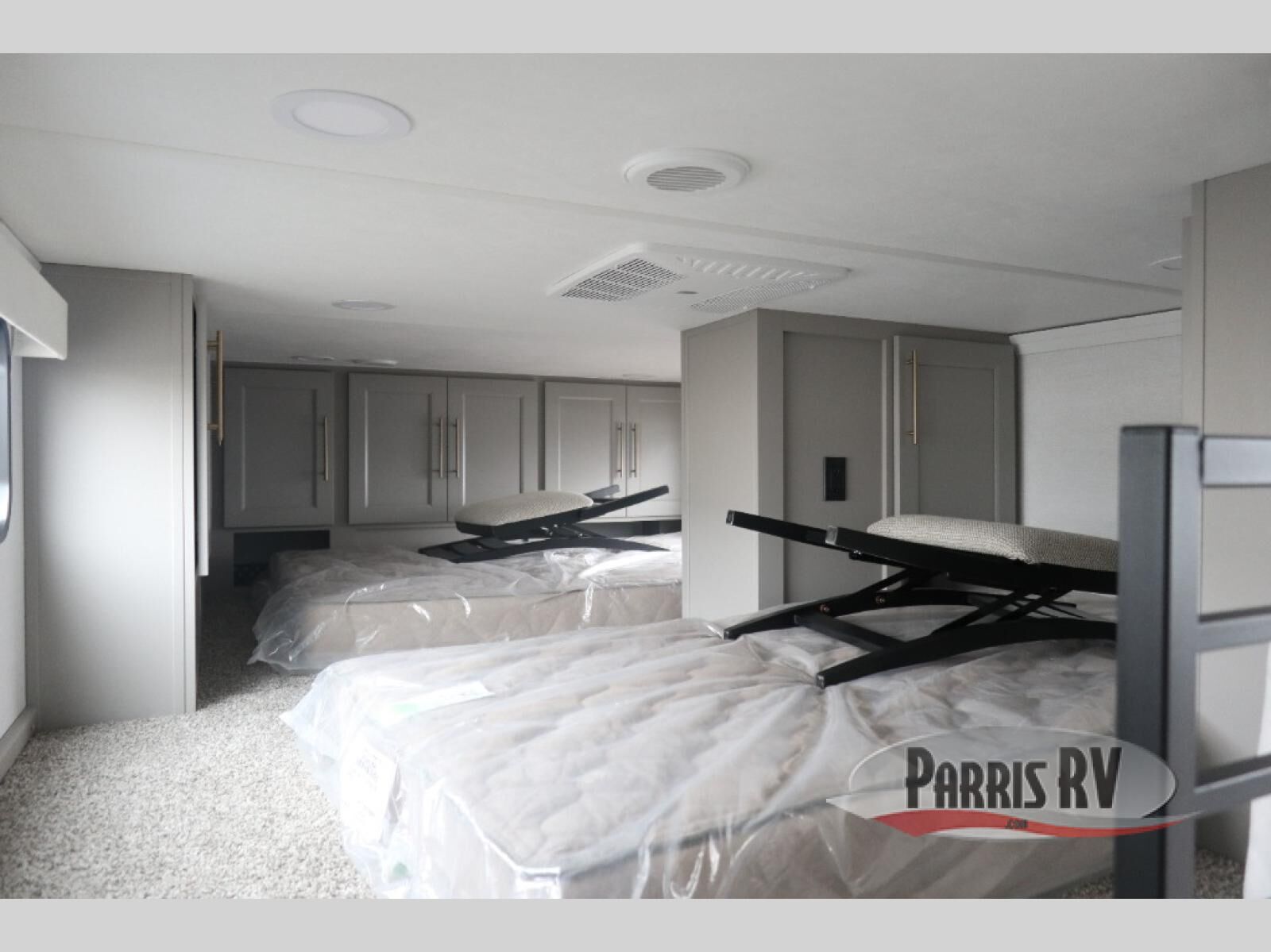 Plan to stay awhile in this spacious destination trailer! Once you enter the unit, you can kick your feet up on the L-shaped sofa and enjoy the 50" TV and fireplace. The chef of your group can make lunch in the rear kitchen with a U-shaped counter plus a bartop with stools. The swivel table and desk will give you a place to dine together and play a board game in the evening. A set of stairs leads to the front bedroom loft that includes a 38" x 74" bed and 54" x 74" bed on one side, plus a 44" x 62" bed on the other, along with storage space! You'll find a front private bedroom with a power tilting king bed slide out, a large front dresser plus a second dresser, and a washer and dryer to make life on the road easier than ever!