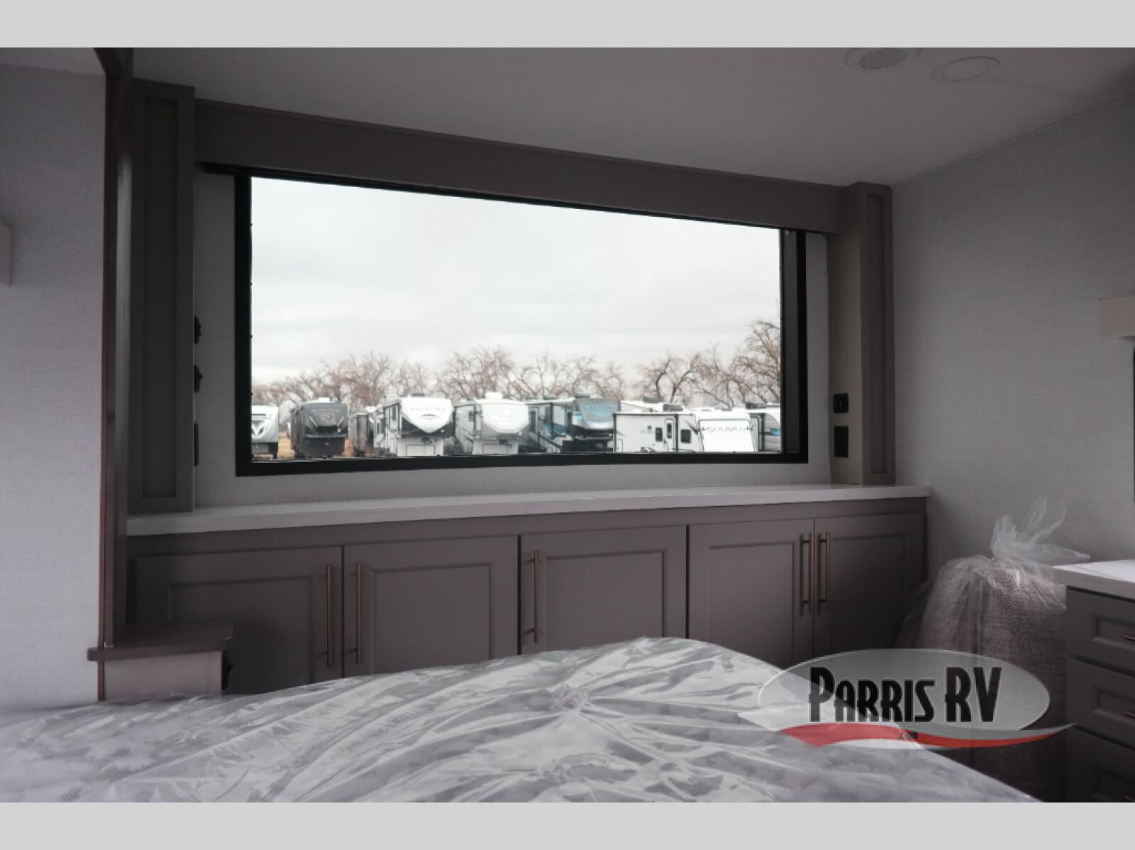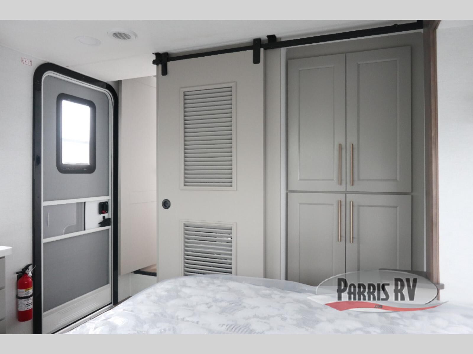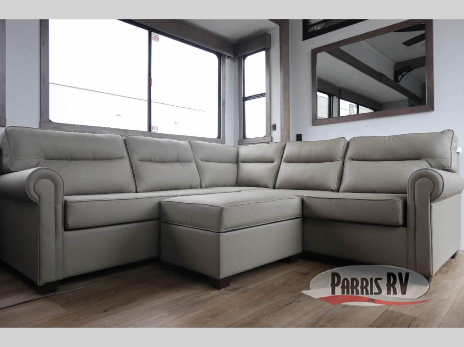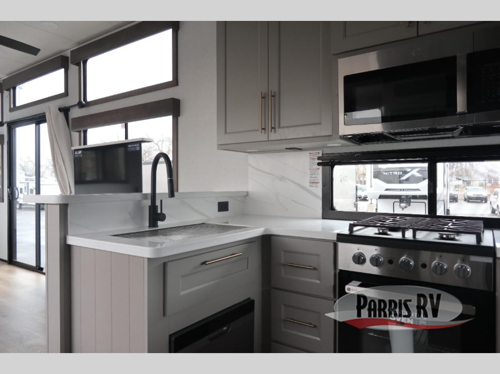 Plan to stay awhile in this spacious destination trailer! Once you enter the unit, you can kick your feet up on the L-shaped sofa and enjoy the 50" TV and fireplace. The chef of your group can make lunch in the rear kitchen with a U-shaped counter plus a bartop with stools. The swivel table and desk will give you a place to dine together and play a board game in the evening. A set of stairs leads to the front bedroom loft that includes a 38" x 74" bed and 54" x 74" bed on one side, plus a 44" x 62" bed on the other, along with storage space! You'll find a front private bedroom with a power tilting king bed slide out, a large front dresser plus a second dresser, and a washer and dryer to make life on the road easier than ever!