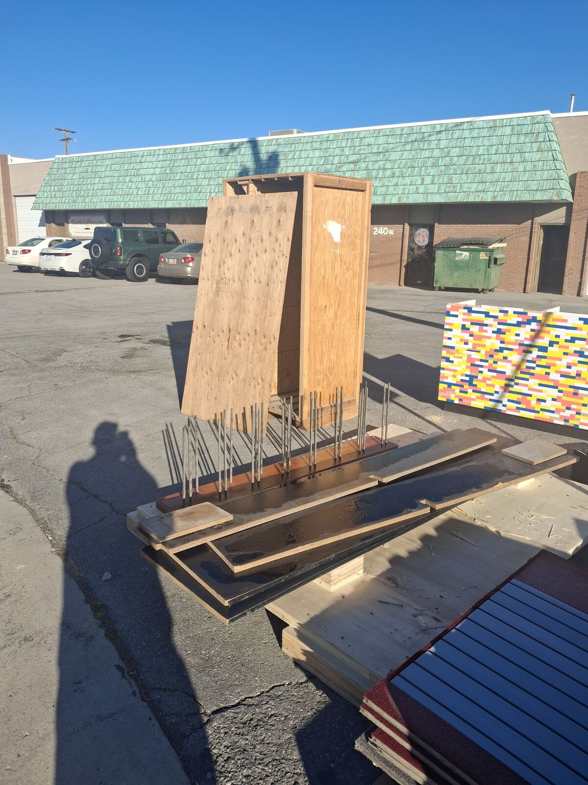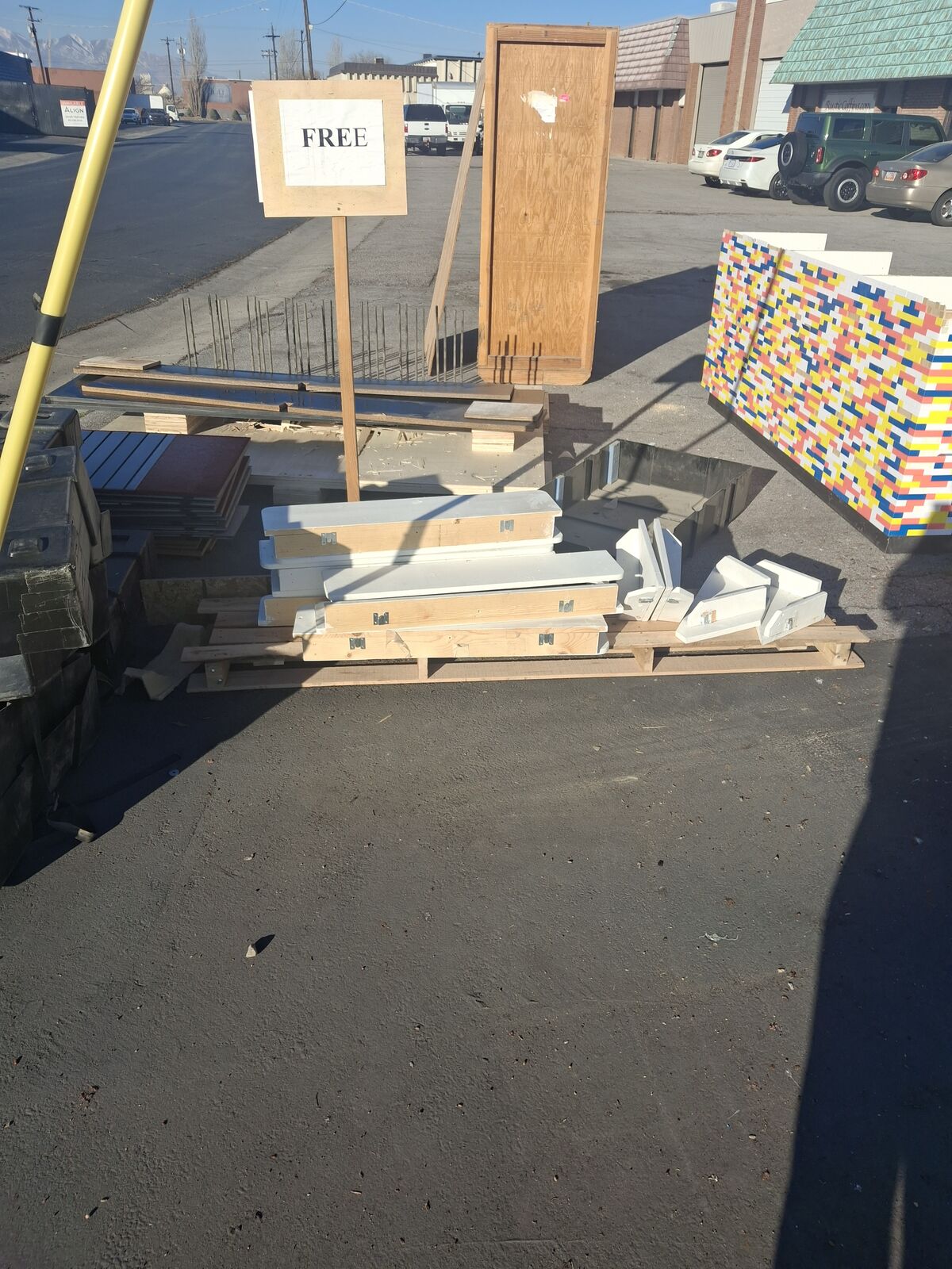 free crate, plastic storage boxes, shelves, slat wall, pallets, lego type counter.