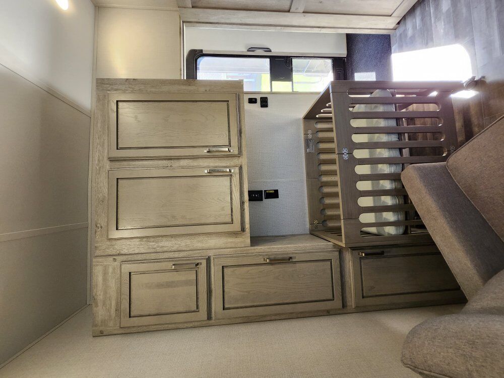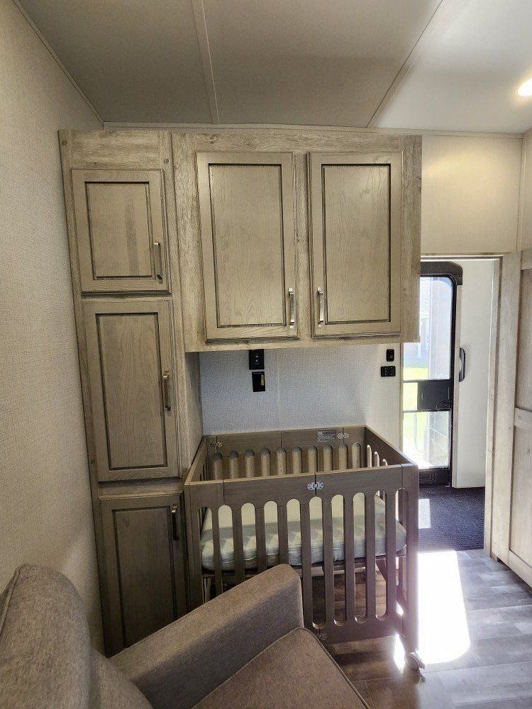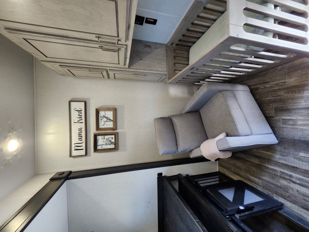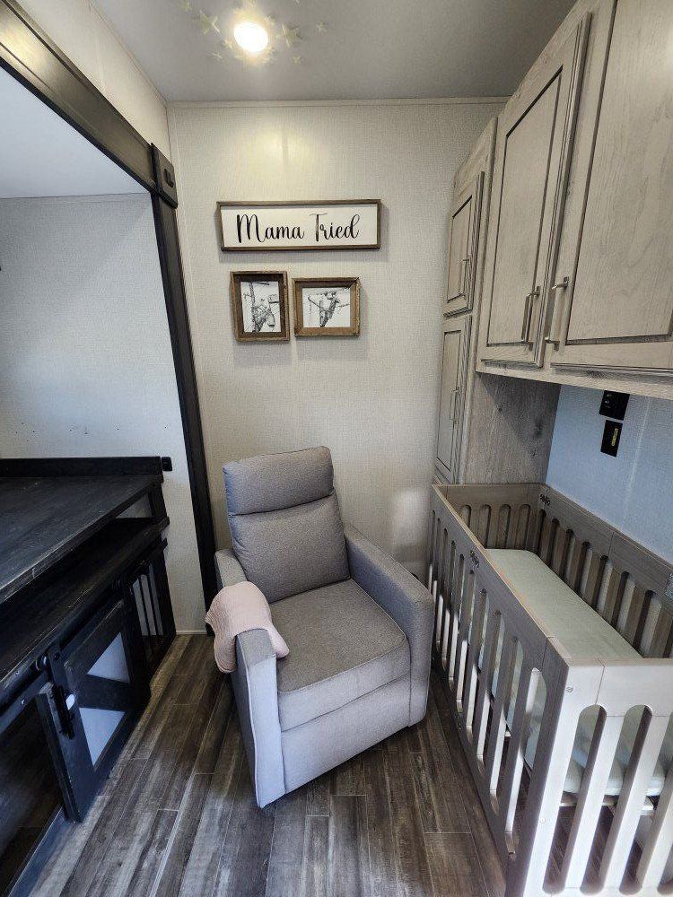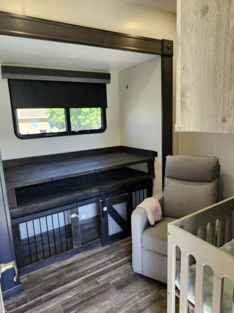 There is a custom drawer under the fridge for added storage, the dog kennel in the mid bunk, and the shelves in the closet which were all built by my husband, and are very sturdy. The crib and rocking chair in the bunkroom are not there, so that room can be used for anything you need, and the top of the kennel is solid for someone to sleep on with a twin mattress.