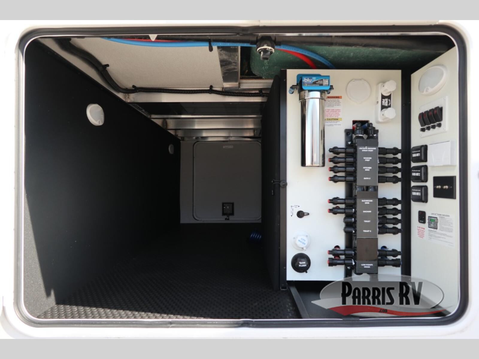 A spacious unit with sleeping for eight with plenty of choices to suit everyone! There is a front private bedroom with a king size bed that offers a large full front closet that has also been prepped for a washer and dryer if you choose that option. The front bath features a 40" x 30" shower and dual entry. Head down to the kitchen and living space at the bottom of the stairs to find a curbside slide that houses the 19 cu. ft. residential refrigerator, a pantry, and a swivel table and desk. As you continue on toward the rear of this coach, you will find a spacious living area along the roadside with a 50" Smart TV and a fireplace, a L-sofa sleeper slide, and a dual reclining loveseat. This makes a great gathering place for television watching, game playing, and even added sleeping space if needed at night. The rear private bedroom with its own private bath features a queen bed, two closets, and a Smart TV as well. The multipurpose loft area above can be accessed just before this rear bedroom entry by a ladder, and it is perfect for extra storage, or it can be used for added sleeping that the kiddos are sure to love.