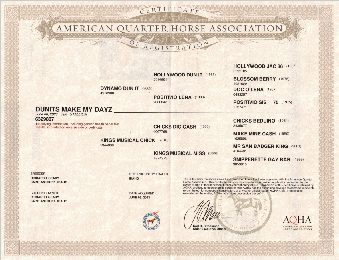 Maker comes from Dr. Geary’s favorite, personal, breeding stock. His sire, Dynamo Dun It, was well known locally as a color and quality producing stallion. Dynamo Dun It’s offspring made fantastic ranch and rope horses. Maker’s dam is a daughter of Chicks Dig Cash, another locally well known running bred stallion, owned by Dr. Geary. Chicks Dig Cash made fantastic cow run crosses loved by all in the roping box.