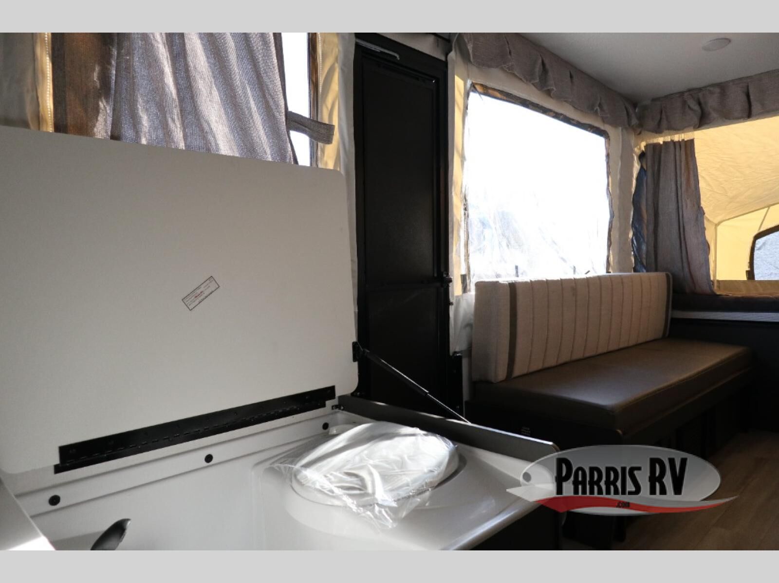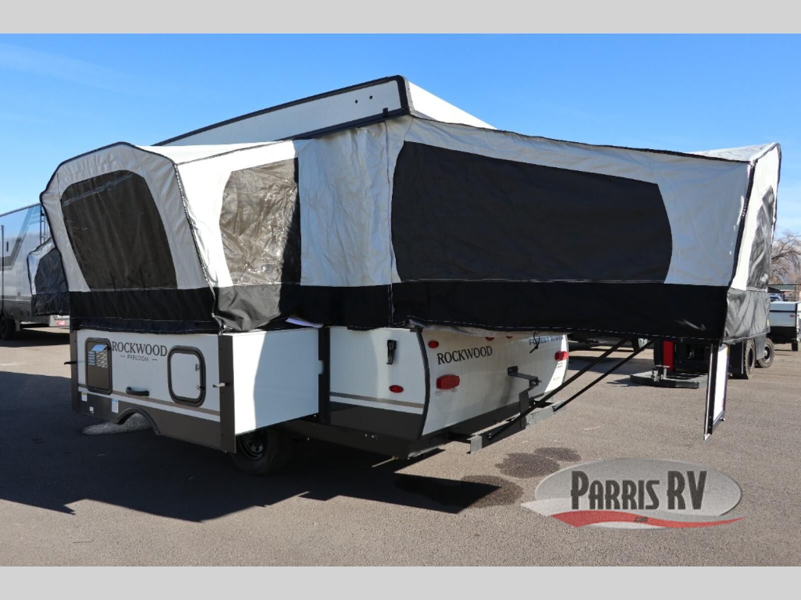 You won't have to worry about length restrictions or cumbersome towing because this Rockwood Freedom Series folding pop-up camper provides you with a lightweight and flexible alternative to heavy RVs! This camper has a single slide built into it which will deliver extra space to the interior without adding to the overall width while traveling, and the booth dinette is a functional piece of furniture that can serve as a dining table and a bed. The swing galley includes a two burner range with a cover to cook meals and a sink for easy cleaning. There is also a shower/toilet to make this unit even more convenient.
