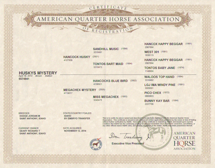 Huskys Mystery is out of Megachex Mystery by Hancock Husky. Born on 04/18/2013. Mystery has inherited his sires incredible temperament. The Hancock line is known for producing solid horses with good bone, intelligence, and cow sense. His offspring should excel in ranch and cow work as well as all-around performance.