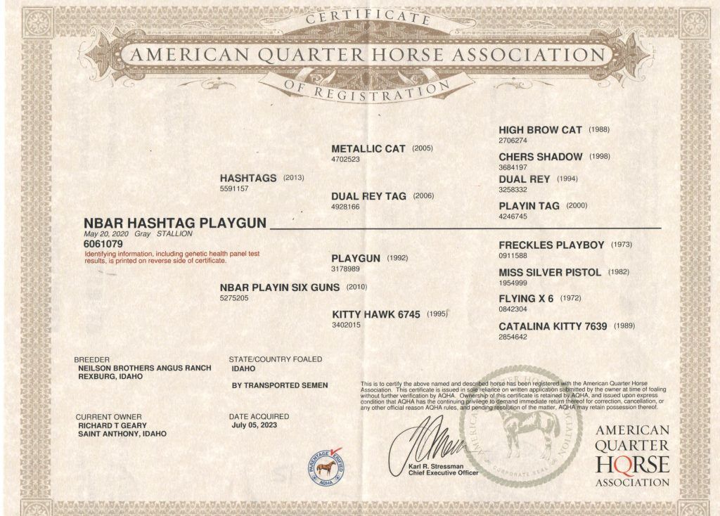 “Hashtag” aka NBAR Hashtag Playgun is the son of the famous cutting horse Hashtags, who was the 2018 National Cutting Horse Association Open World Champion and named NCHA Hall of Fame Stallion. Hashtags has over $485,000 in lifetime earnings and is a son of the legendary Metallic Cat who has lifetime earnings of over $630,000. NBAR Hashtag Playgun is also the grandson of Playgun, a very well known and loved stallion in the cutting and reined cowhorse industry.