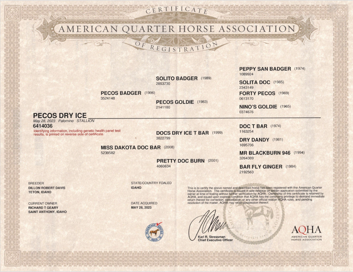 Ice comes from one of Dr. Geary’s favorite stallions Pecos Badger, who has been a breeding stallion for us for many years. His offspring make amazing all around horses that excel in just about anything you ask of them. They are always a favorite around here.