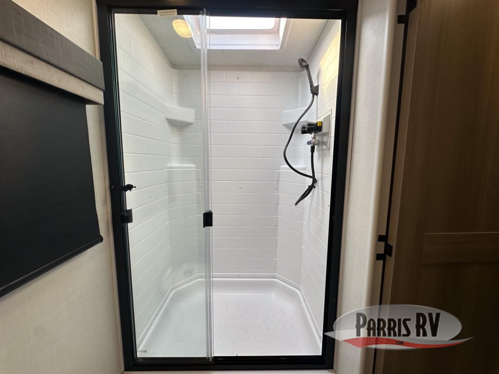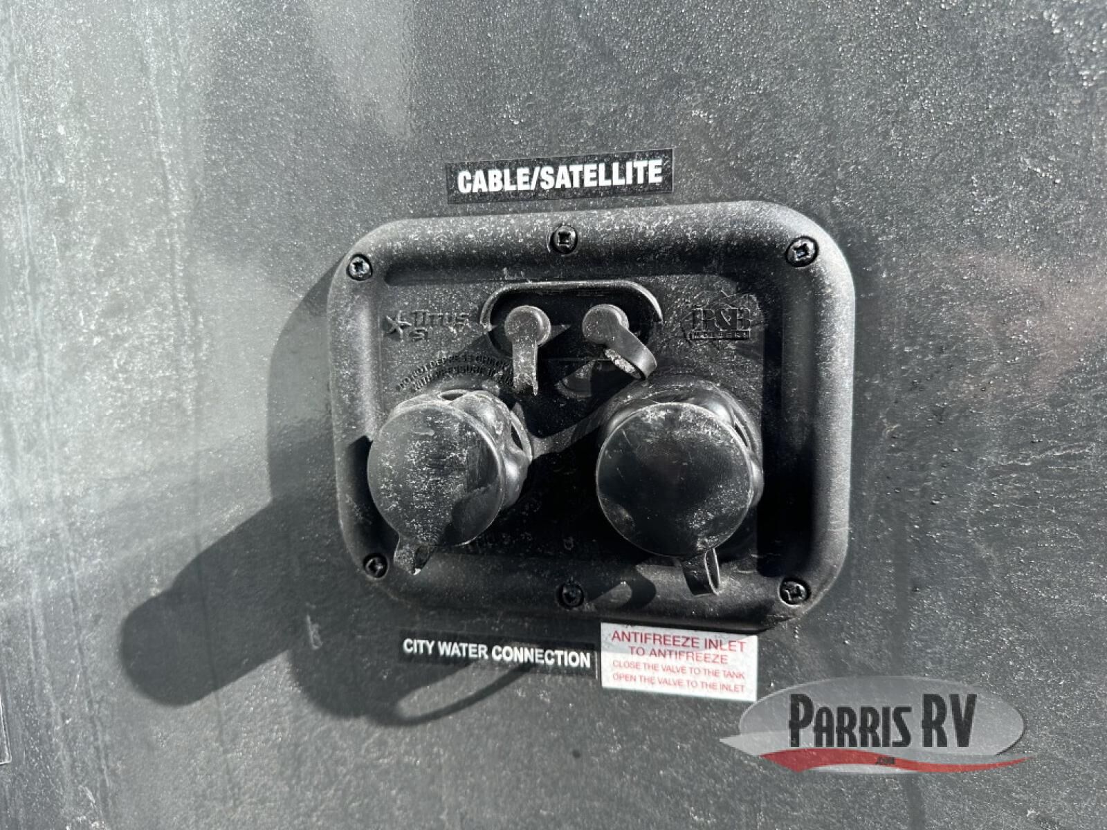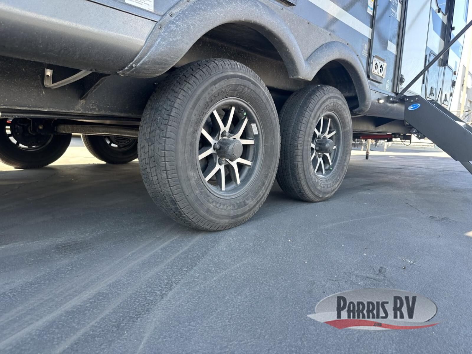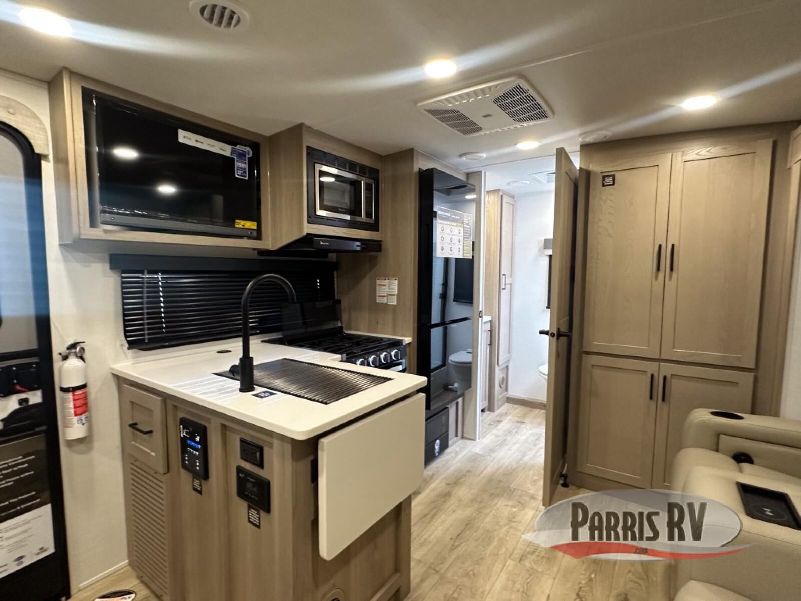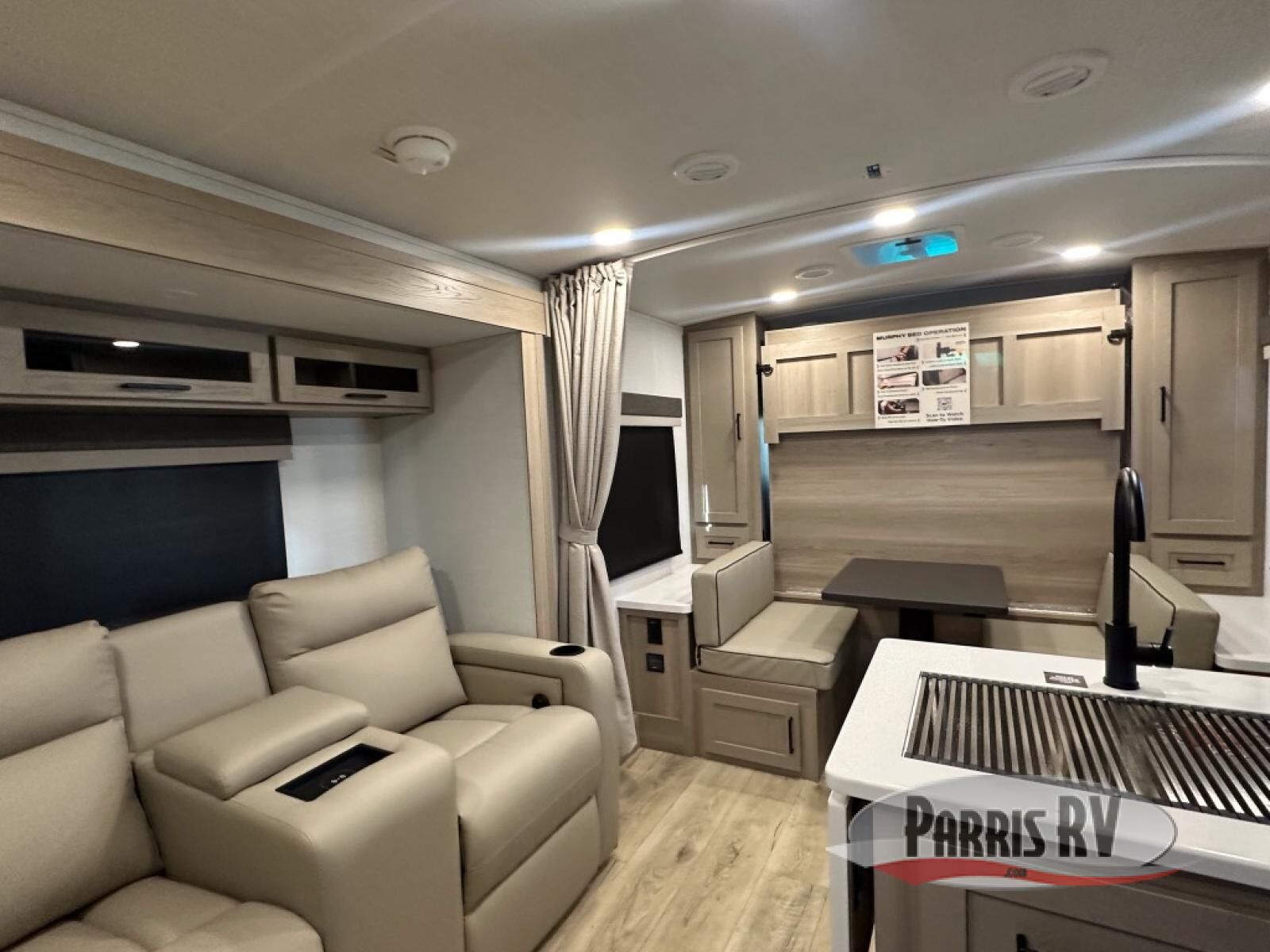 This versatile travel trailer is perfect for weekend camping trips to your favorite park! Once you arrive at your site, you can unload the pass-thru storage, then put out the 15' power awning and relax in your camp chairs. The cooktop and microwave inside will let you make lunch when you get hungry, and there is a theater seat slide out if you want a comfy place to relax. There is also a 30" x 80" booth dinette up front where you can dine together and play games in the evenings, and when you're ready for bed, the 60" x 74" Murphy bed can be folded down over the dinette. This unit includes plenty of storage spaces, including dual bedside wardrobes, a kitchen pantry, and a linen closet in the full rear bath!