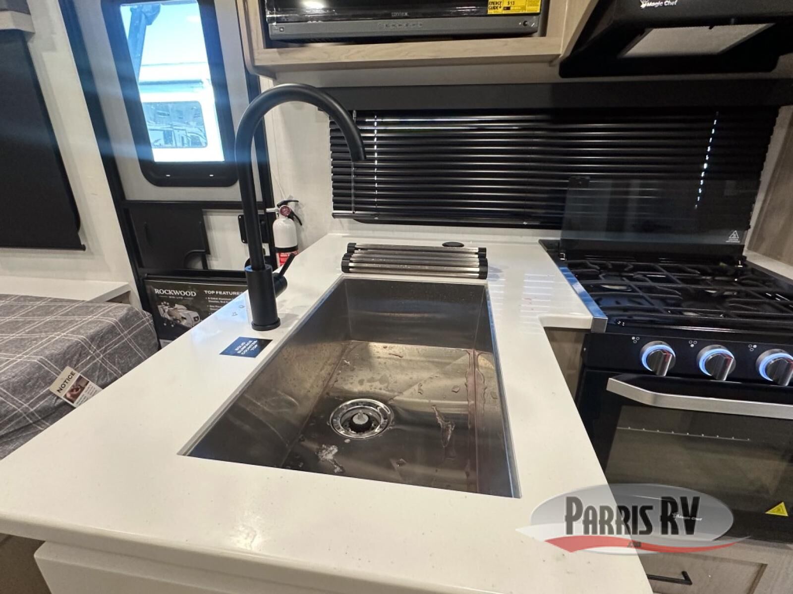 Each Rockwood Mini Lite travel trailer by Forest River is constructed with a fully laminated one-piece walkable roof, sleek frameless windows, and a six-sided full aluminum frame for strength and durability. The 12V thermostatically controlled heated tanks, plus radiant foil in the underbelly will allow you to camp well into the colder months, and the 200W roof solar panel will be perfect for a little off-gridding. Each model includes solid surface kitchen countertops, hidden hinge cabinet doors, roller shades, plus many more interior features. Having an AIR 360+ omnidirectional antenna with WiFi prep on board gives you the option to get some work done if it's needed, and the power tongue jack provides hassle-free set up, so you can enjoy more time relaxing!
