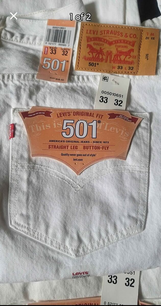 One pair left, white Levi's 501, brand new, never worn. 32 x 32. $40 each pair. ($120 for all four pairs, $30 each)