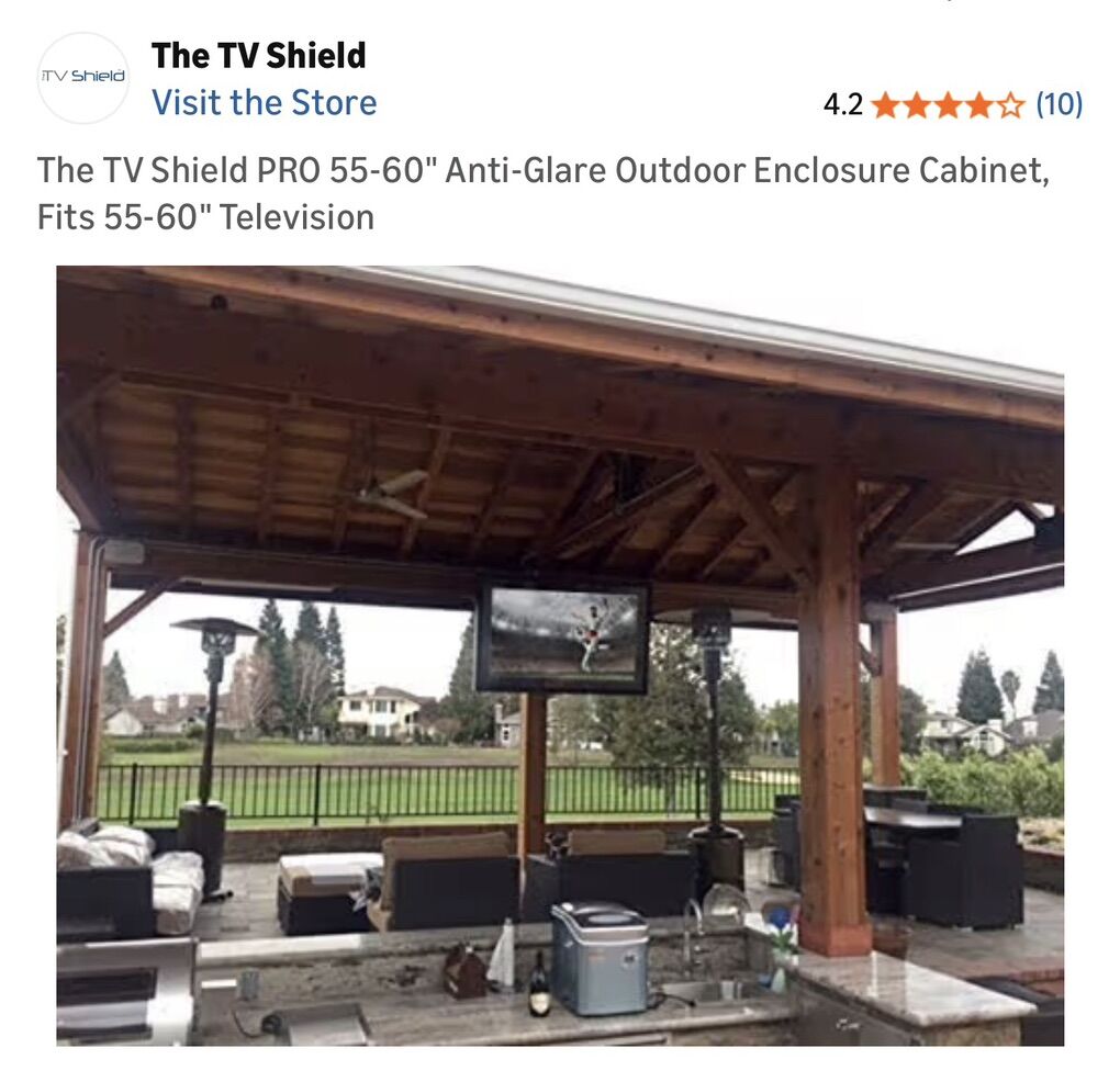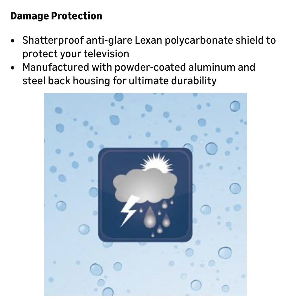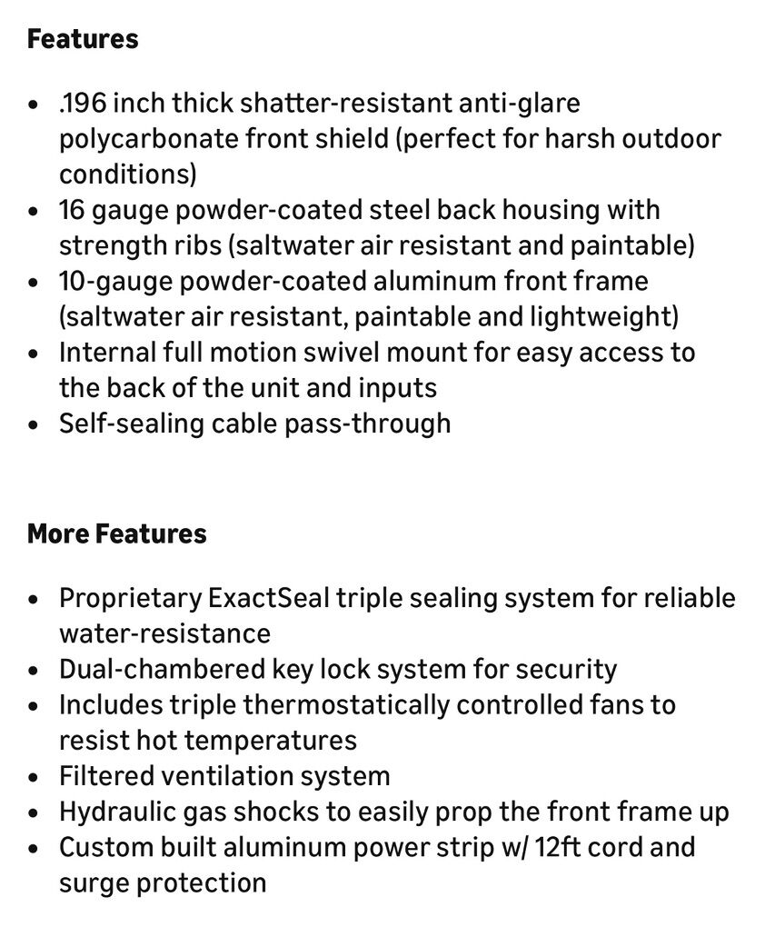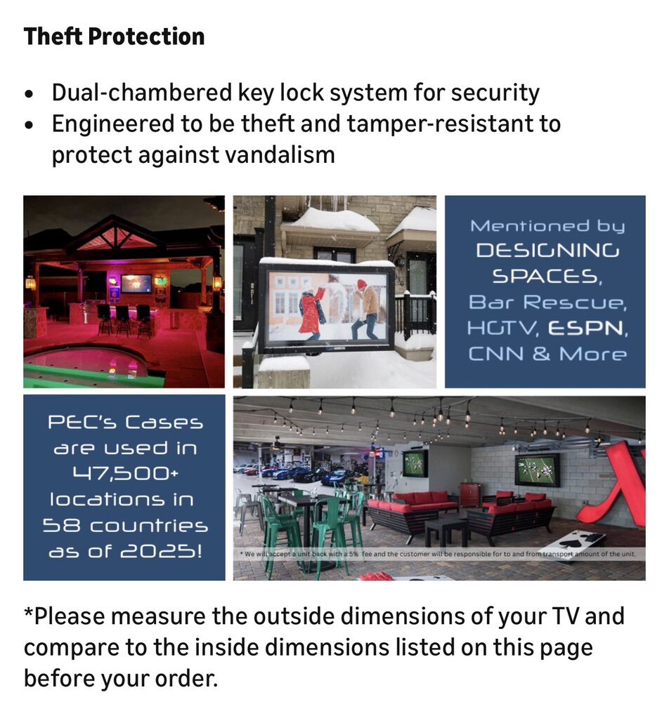 Description- Anti-glare, indoor/outdoor weatherproof, locking TV enclosure for 55-60” TVs. See photos for more product information and specifications.