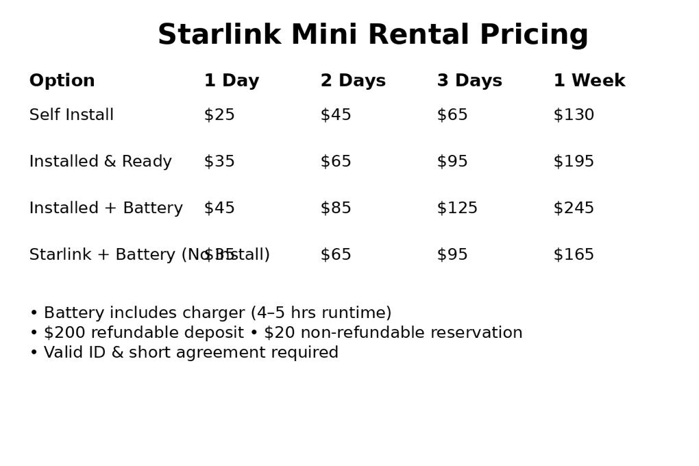 Rental options available: • Self-install • Installed & ready • Installed + battery • Starlink + battery (no install) Better pricing available for multi-day rentals (See price chart in photo)