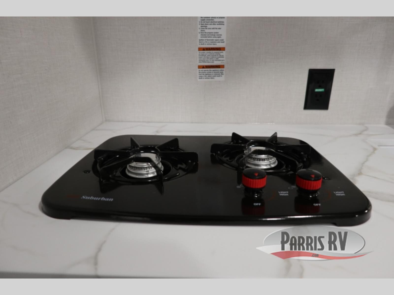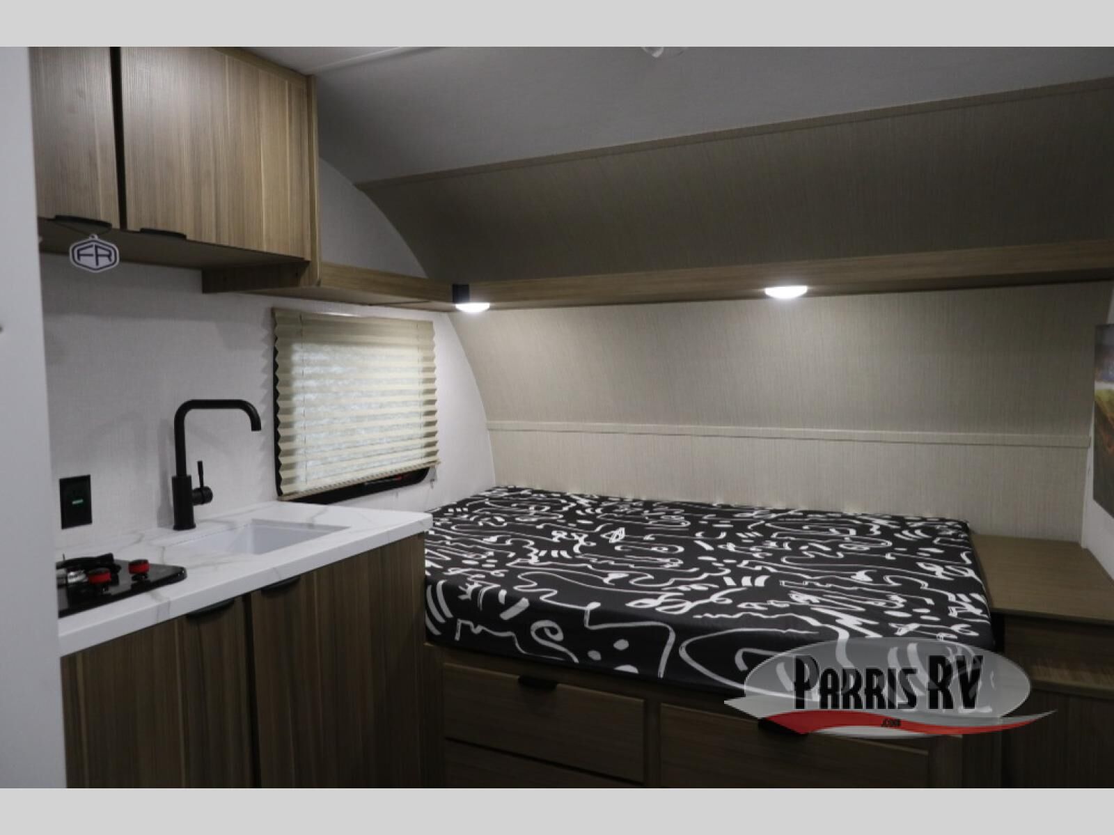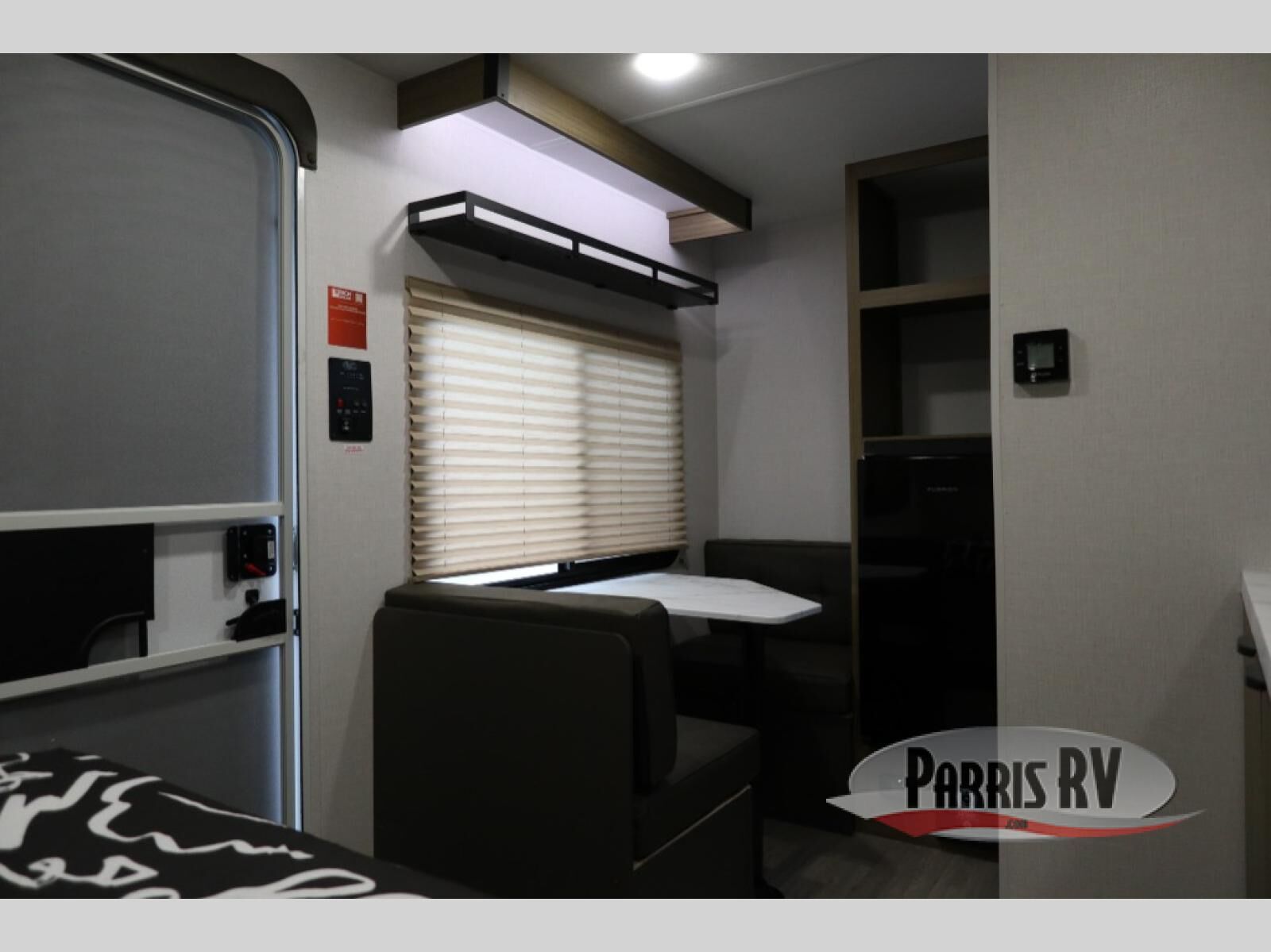 This lightweight travel trailer has everything you need to enjoy camping trips! There is a front east to west custom king bed with storage at the foot of the bed and overhead for your valuables. A private bath includes a toilet and walk-in shower so you can easily get ready each day, and you can prepare your meals on the two-burner cooktop when you get hungry. The booth dinette will provide dining space, along with sleeping space for one to two little ones. Don't let this trailer get away!