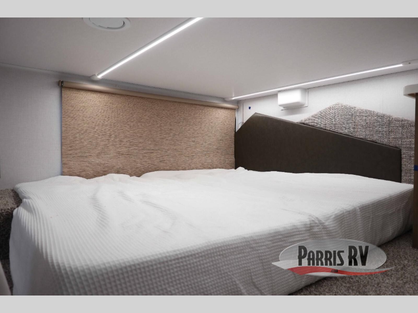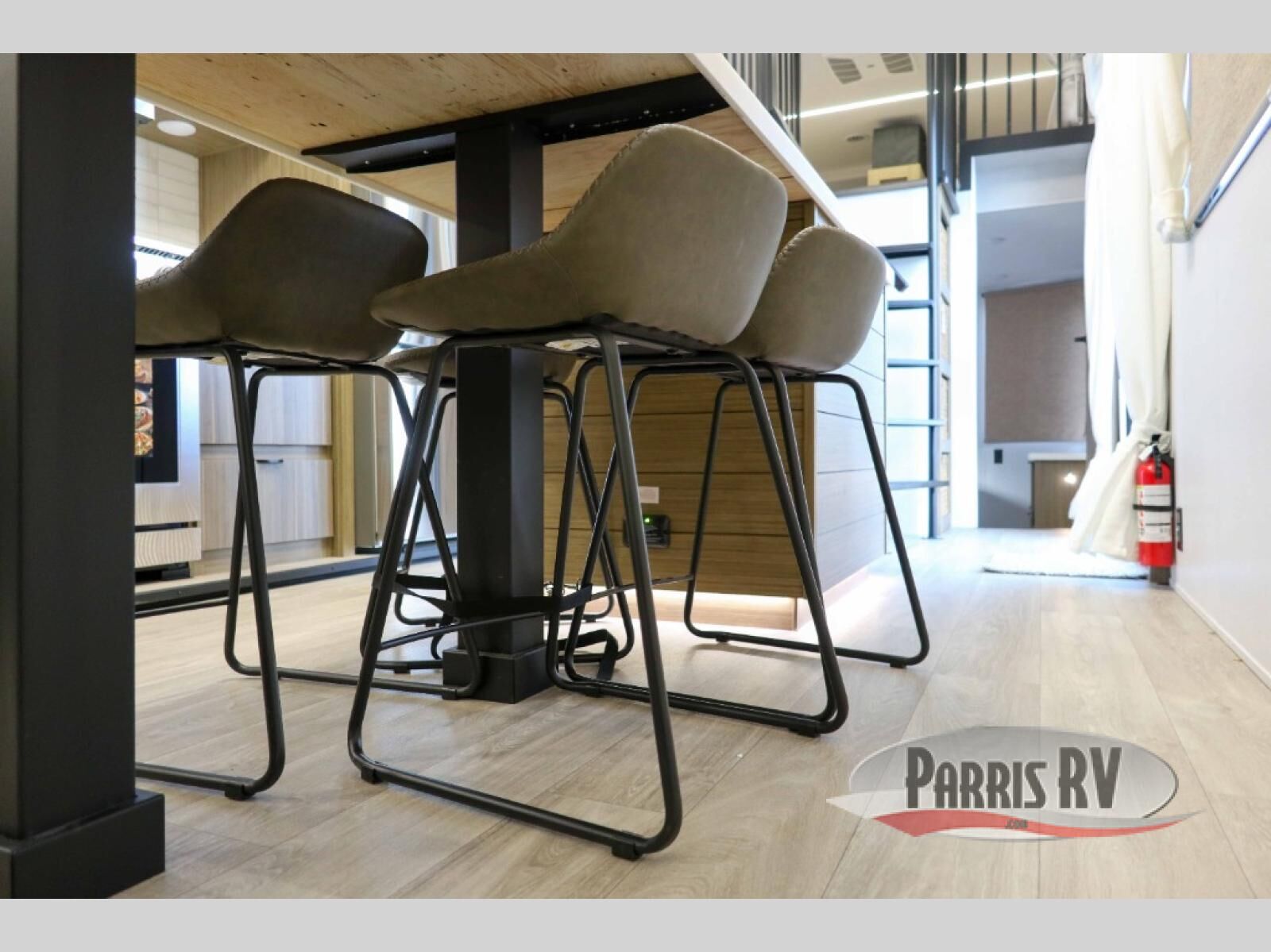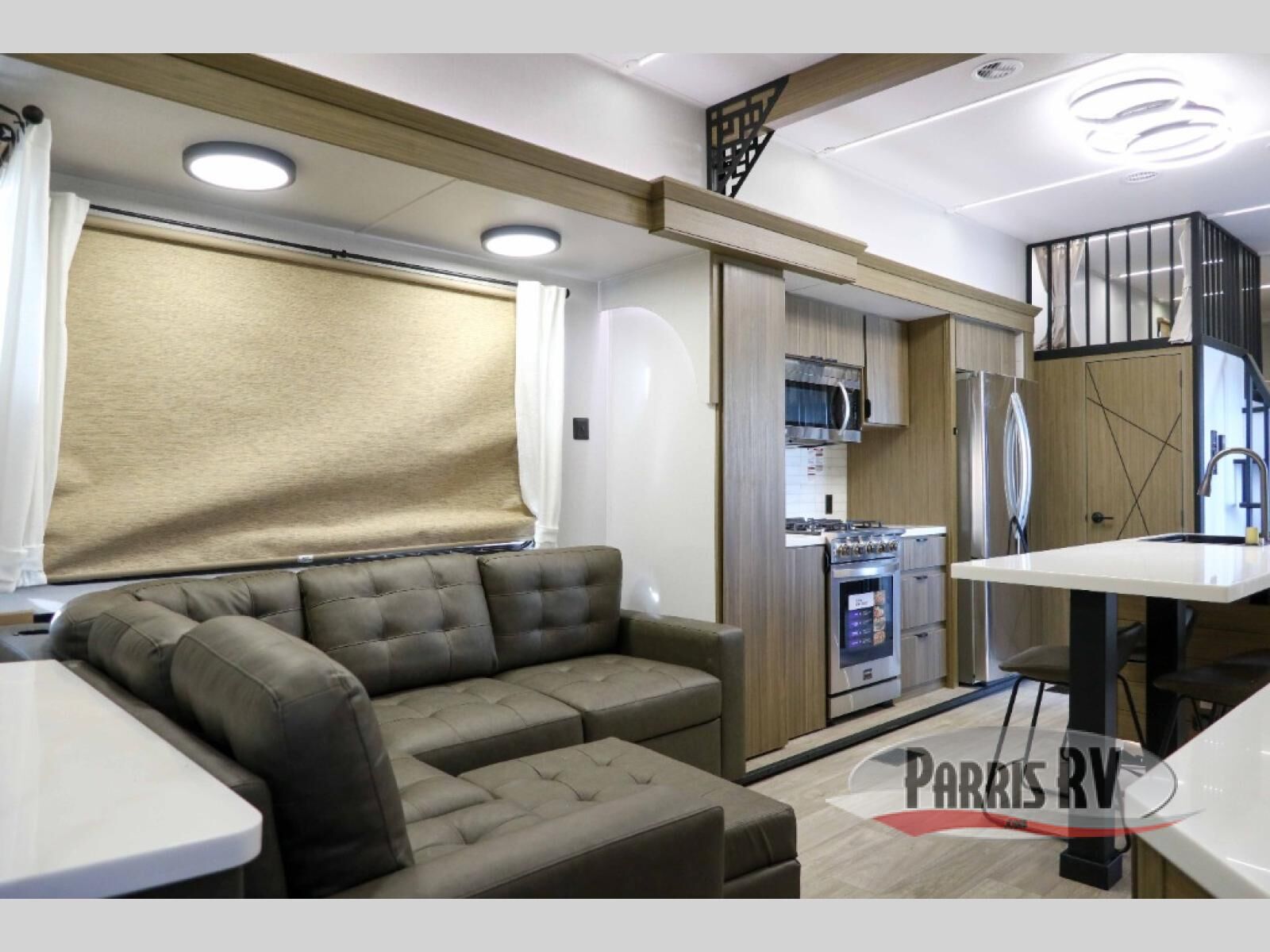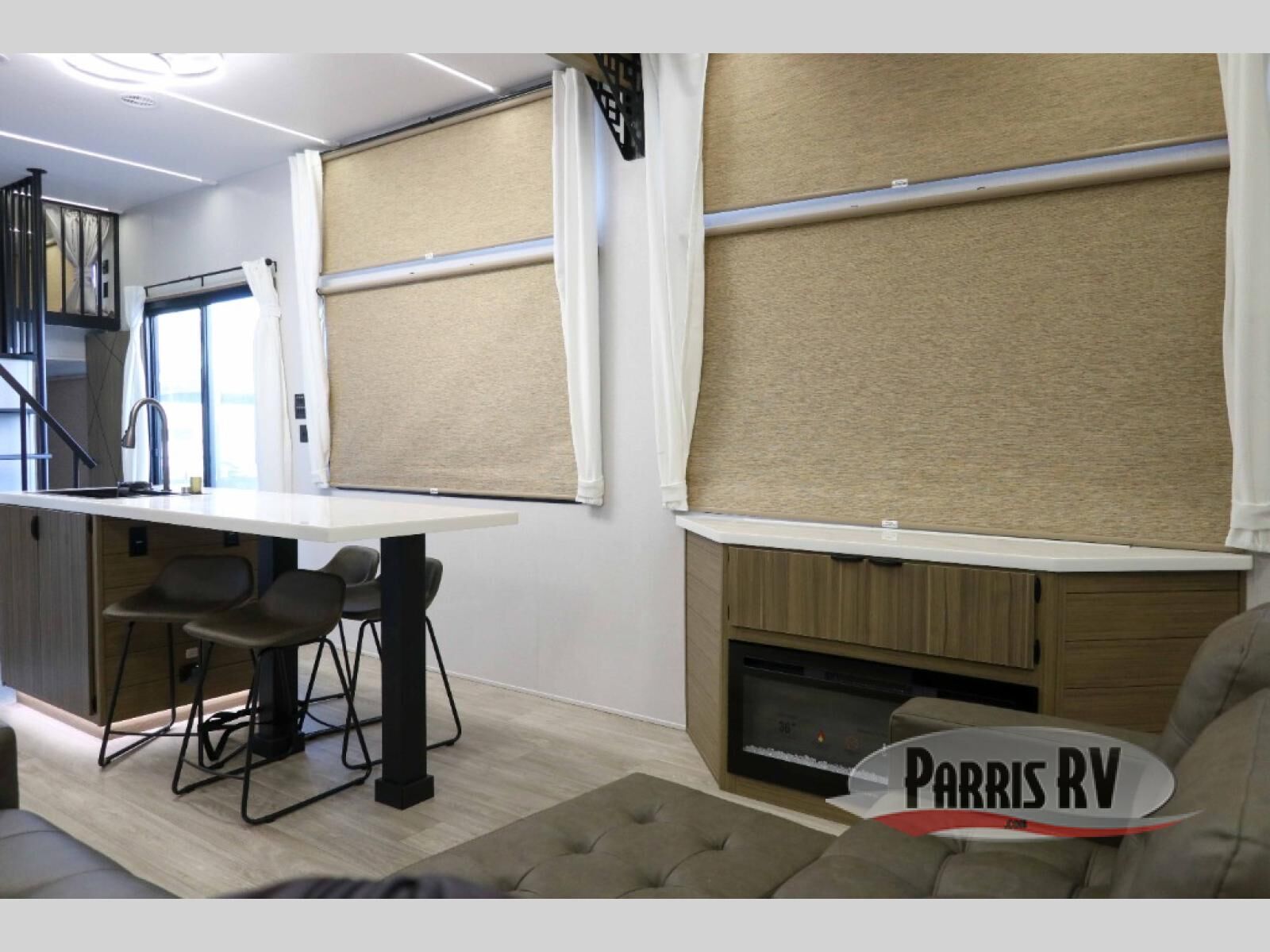 This 44ZEN trailer is designed to offer maximum comfort and space. It features two lofts that adds extra sleeping space, one includes a 62" x 74" Versa queen mattress and a dresser for personal items, while the second loft comes with a Versa queen bed, shelf and cabinet storage, and a table with recessed footing, perfect for remote work or study sessions. On the main floor, the rear full bathroom is fully equipped with a walk-in shower, linen closet, and washer/dryer prep. At the center we have a large sectional sofa invites everyone to gather, facing a fireplace and Televator TV, great for movie nights or relaxing. The kitchen island adds prep space but also doubles as a casual dining area with barstool seating. For added convenience, a half bath is tucked beside the second stairway, providing easy access if needed. Up front, the master bedroom offers a retreat with a king-size bed with Versa Tilt, a dresser for storage, and a wall of windows that provides a view of the scenery outside.