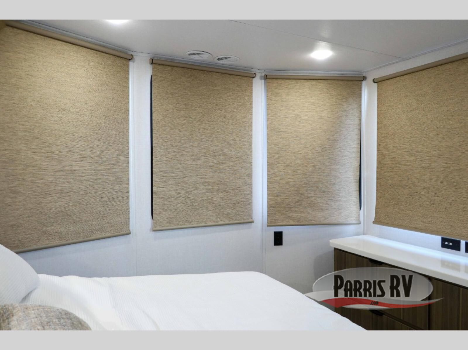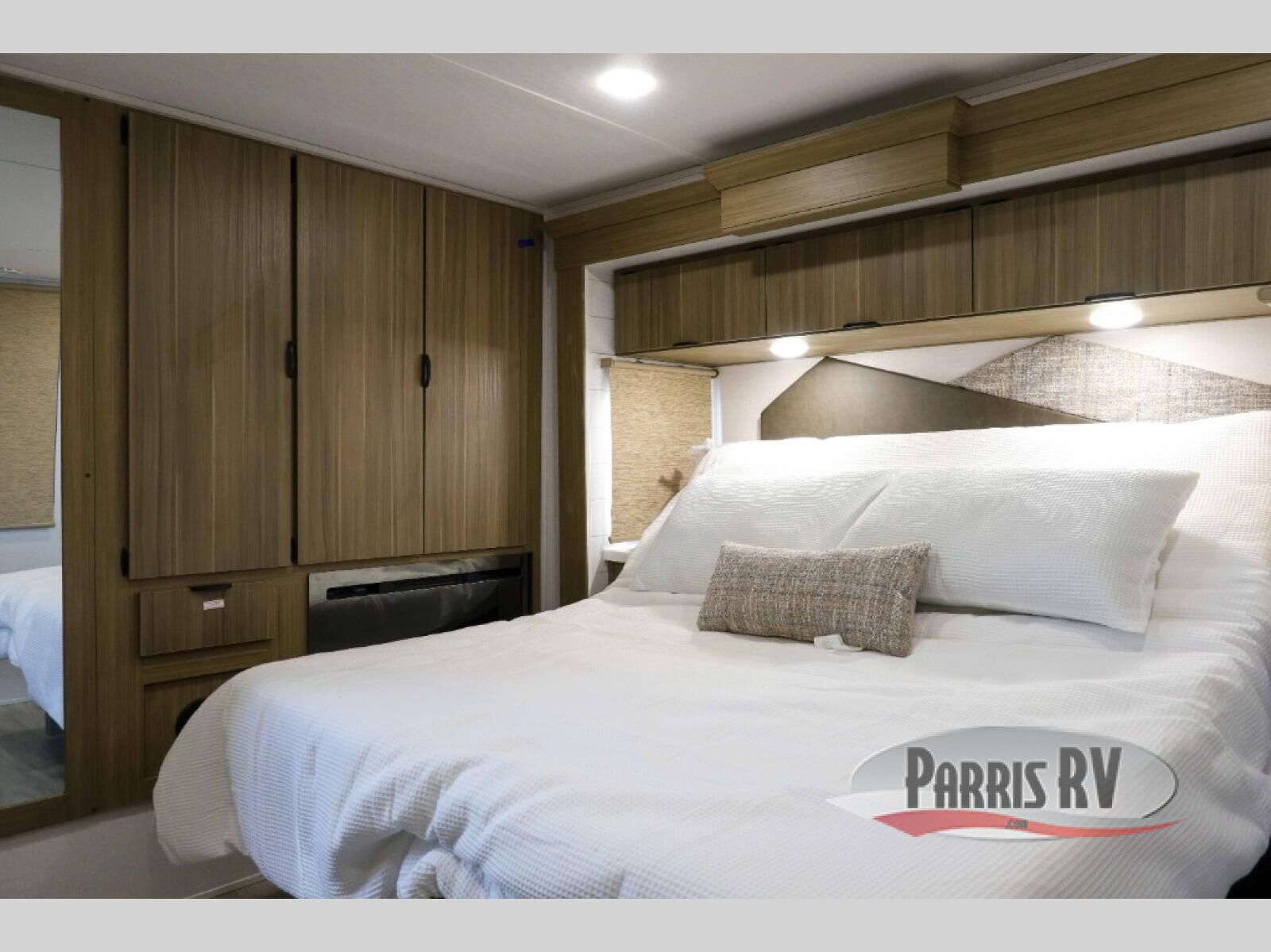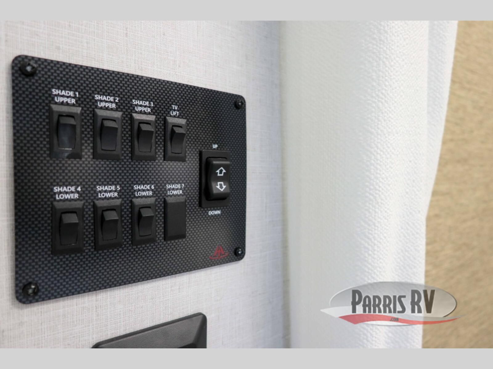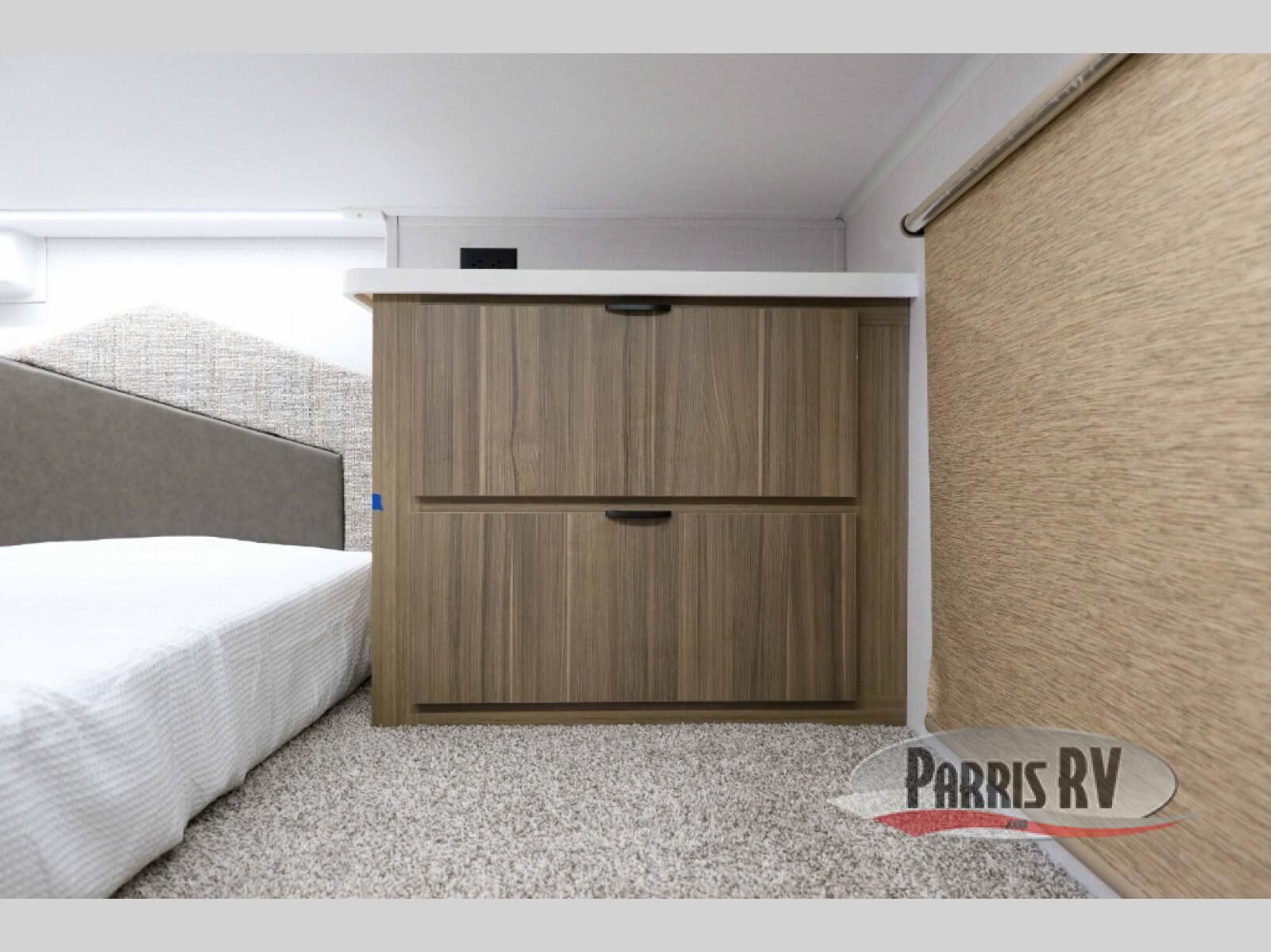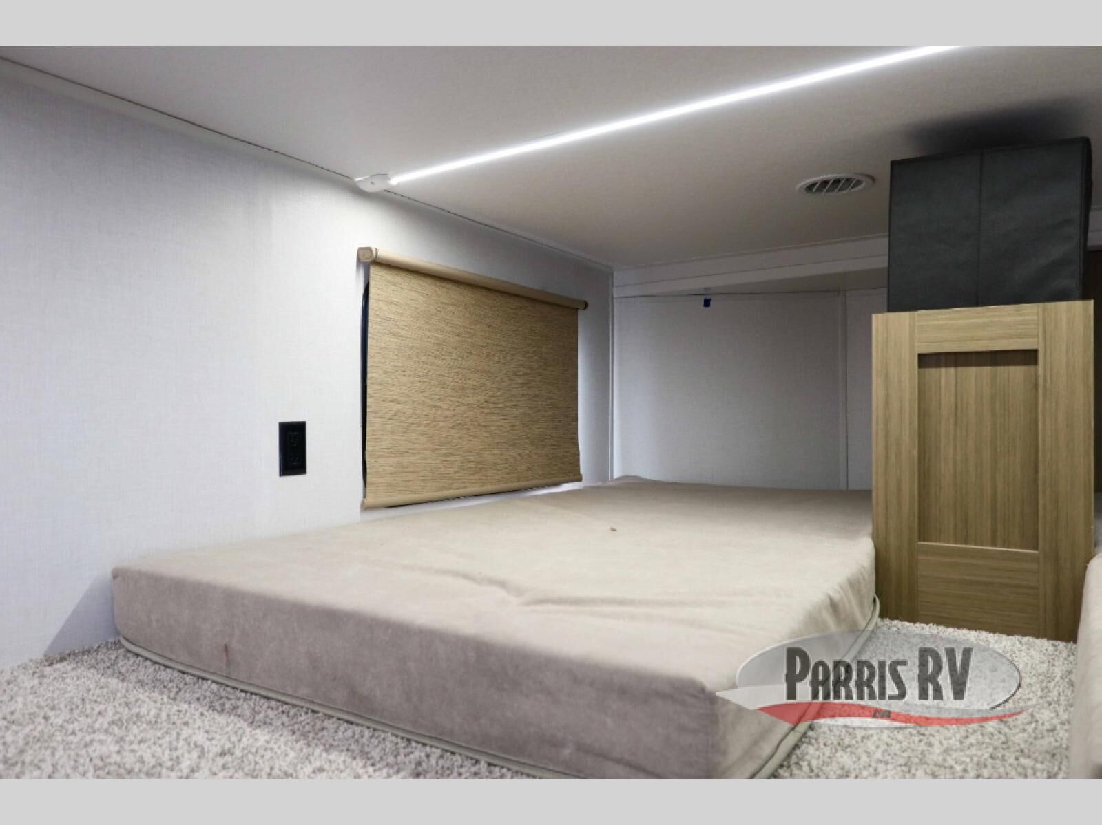 This 44ZEN trailer is designed to offer maximum comfort and space. It features two lofts that adds extra sleeping space, one includes a 62" x 74" Versa queen mattress and a dresser for personal items, while the second loft comes with a Versa queen bed, shelf and cabinet storage, and a table with recessed footing, perfect for remote work or study sessions. On the main floor, the rear full bathroom is fully equipped with a walk-in shower, linen closet, and washer/dryer prep. At the center we have a large sectional sofa invites everyone to gather, facing a fireplace and Televator TV, great for movie nights or relaxing. The kitchen island adds prep space but also doubles as a casual dining area with barstool seating. For added convenience, a half bath is tucked beside the second stairway, providing easy access if needed. Up front, the master bedroom offers a retreat with a king-size bed with Versa Tilt, a dresser for storage, and a wall of windows that provides a view of the scenery outside.