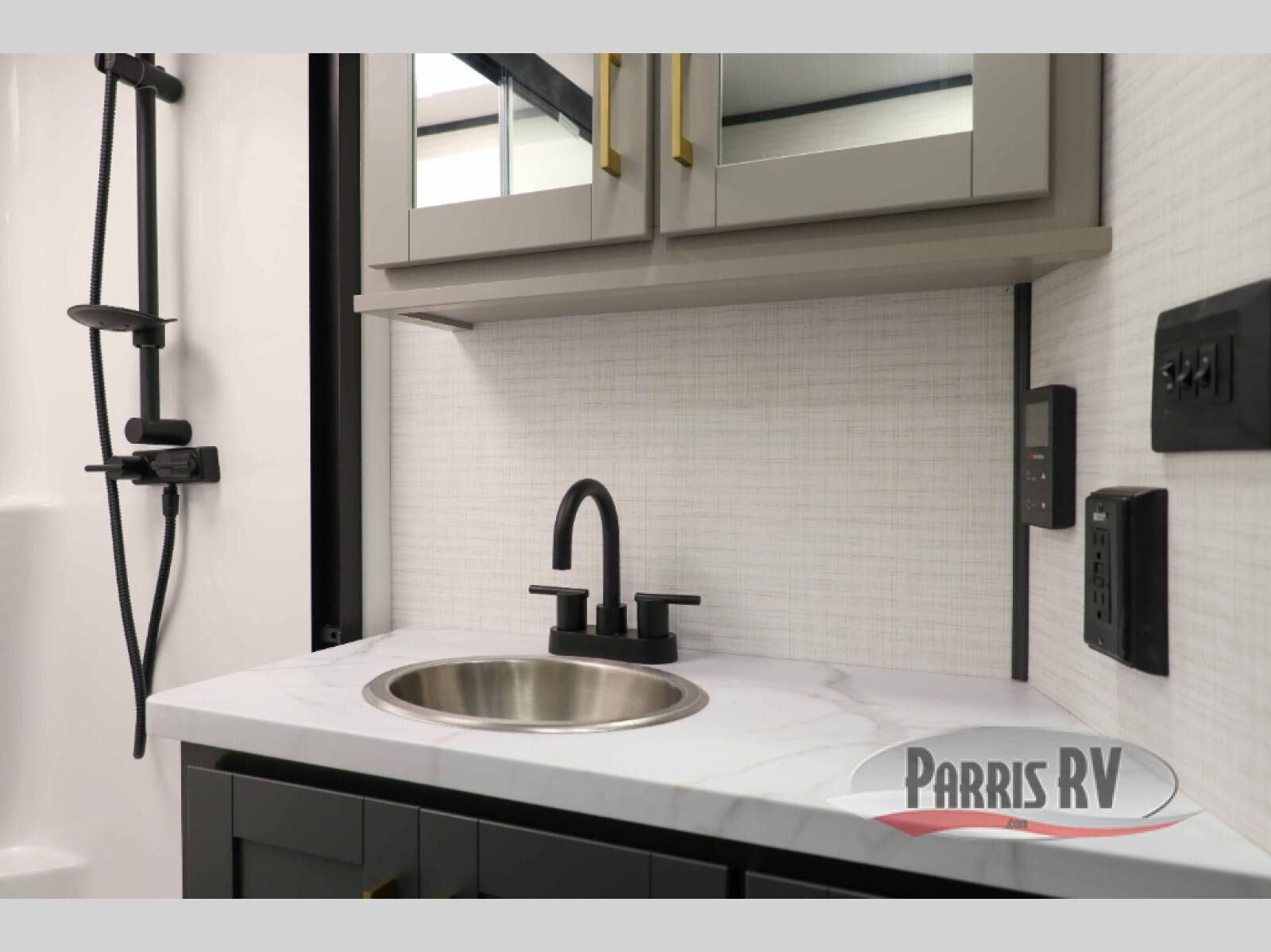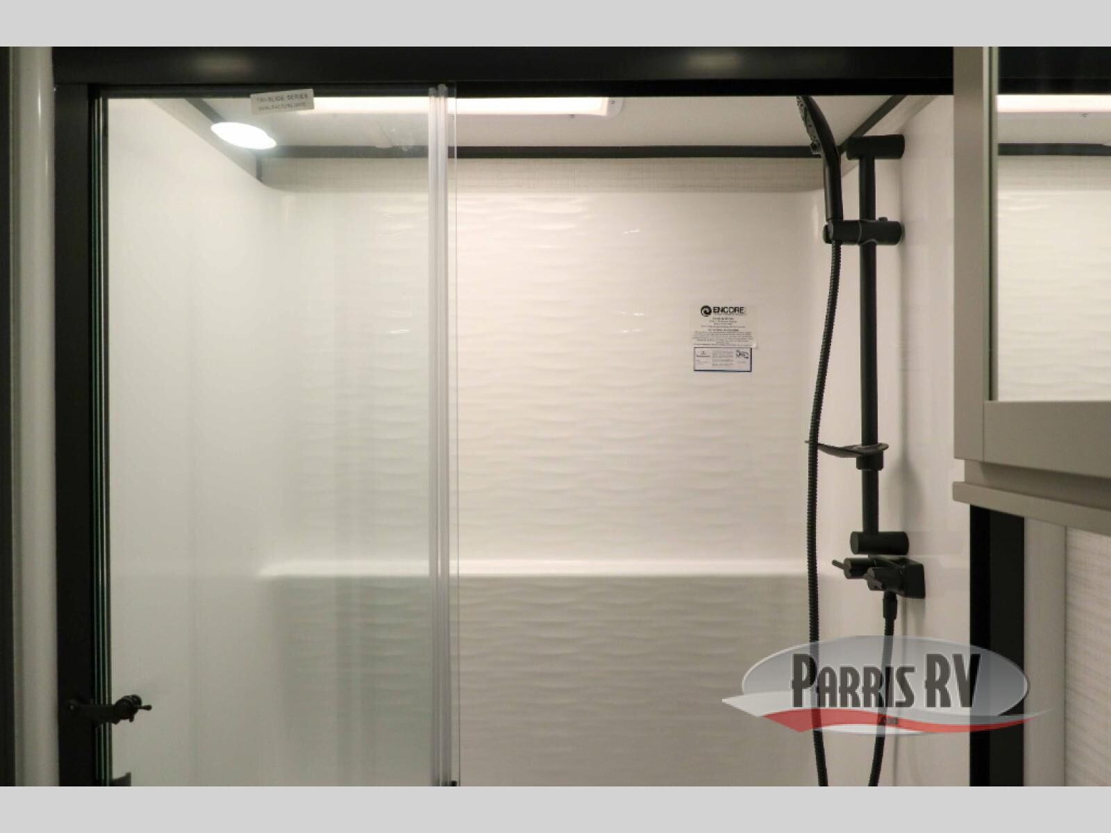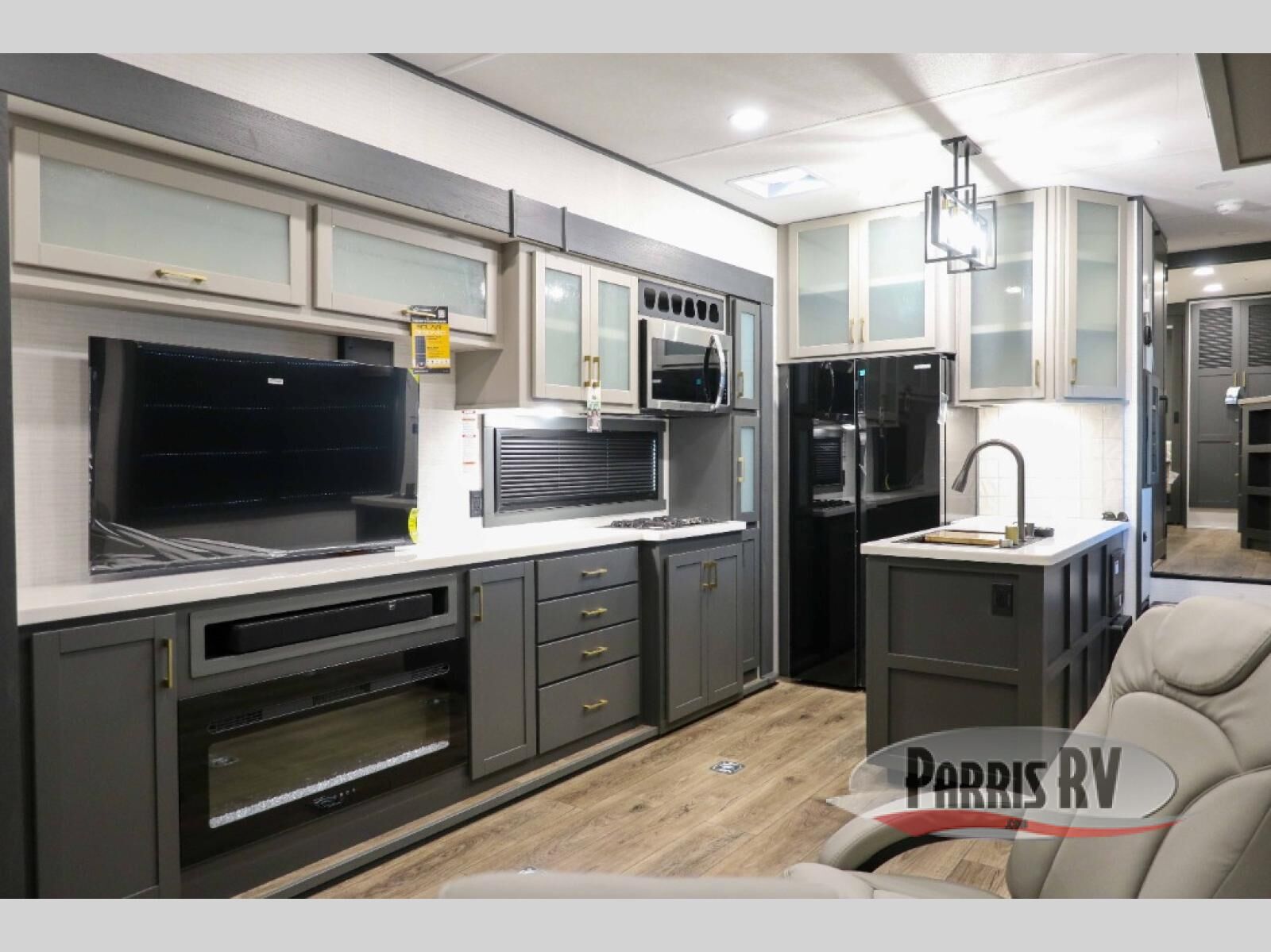 At the front of this spacious toy hauler, you'll find a cozy retreat featuring a 66" x 80" king bed, complemented by a wardrobe and dresser to keep your clothing and essentials neatly organized. Down the hall, a full bathroom awaits with a convenient shower/tub combo and linen shelves for all your toiletries. The central living and kitchen area offers a roomy feel thanks to a slide out, showcasing an entertainment center with a fireplace, overhead cabinets, and a microwave on one side, while two comfortable armchairs sit across, perfect for unwinding after a day of adventure. Nearby, a 16 cu. ft. residential-style refrigerator, sink, and ample counter space ensure you have everything you need for easy meal prep. At the rear, the versatile Happi Jack Dinette with removable tables and the Happi Jack Queen Bed System provide flexible seating and sleeping options for guests. With a generous 16' 6" garage from the rear to the kitchen counter, you'll have plenty of room to bring along all your favorite toys.