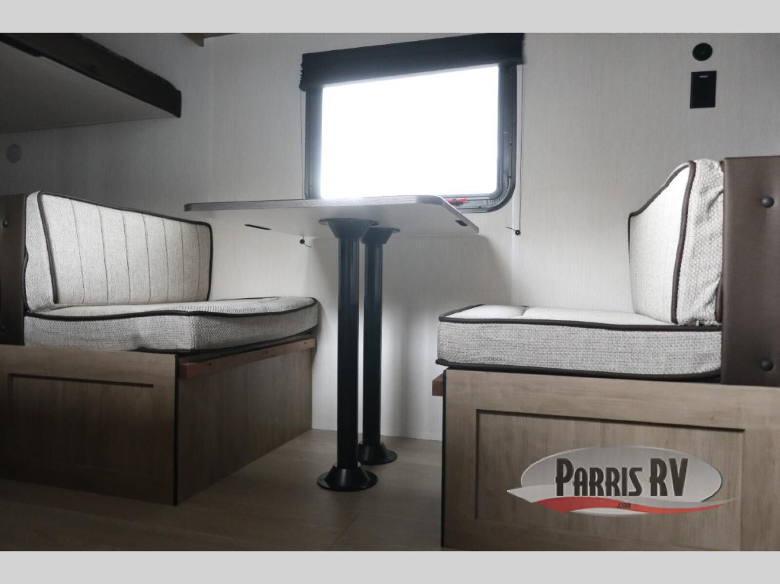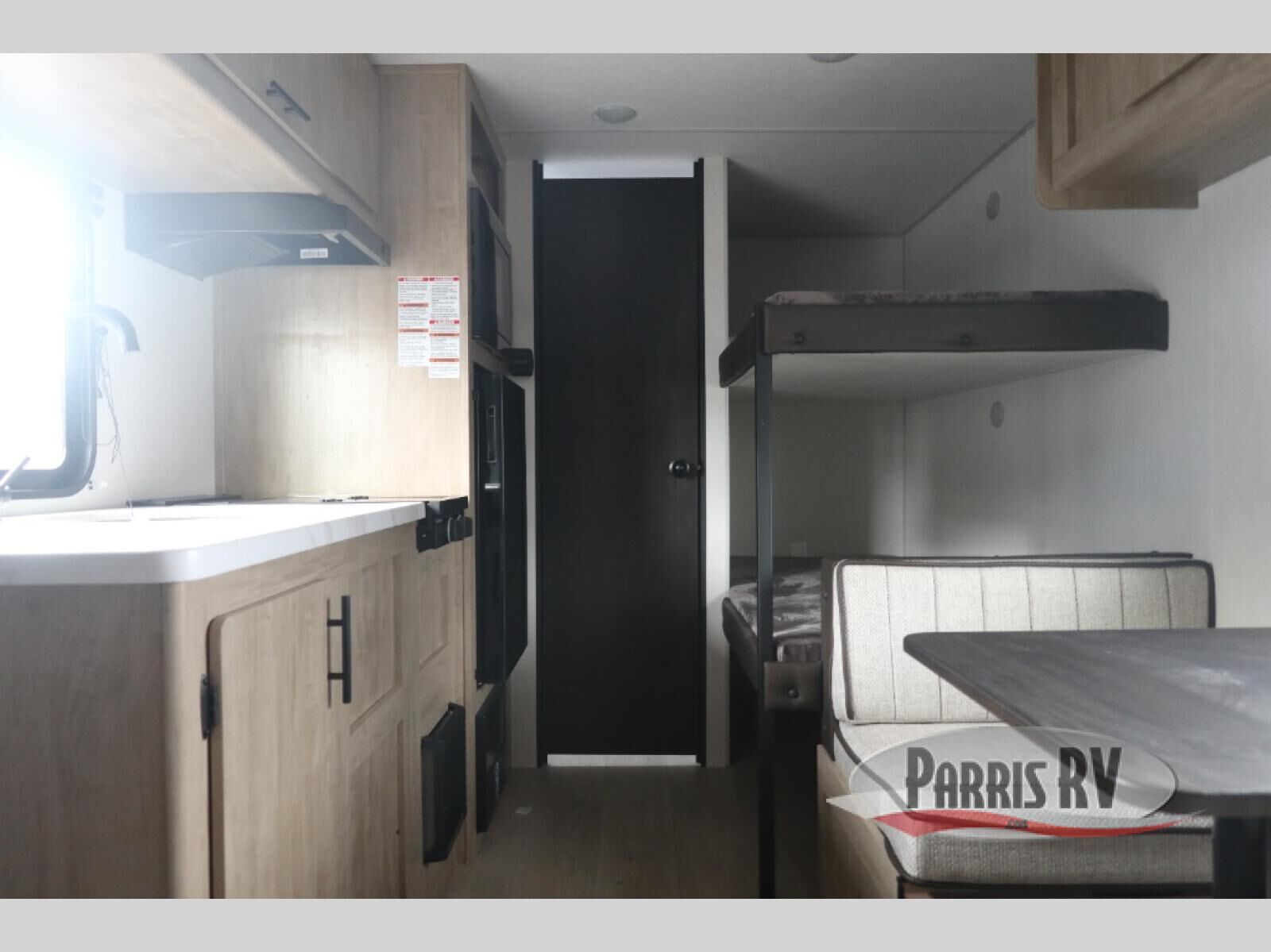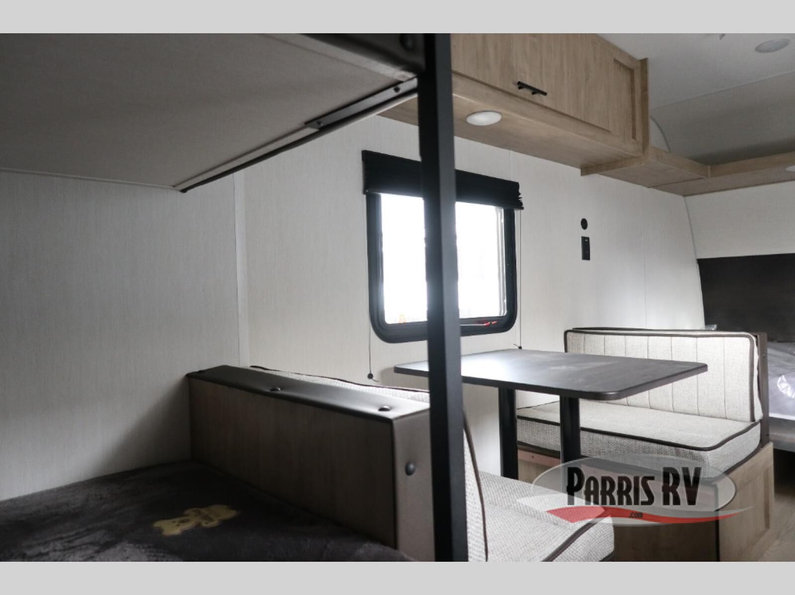 The whole family can sleep comfortably in this travel trailer! It has a set of bunk beds for the kids to sleep on, and you can sleep comfortably on the front queen bed with overhead cabinets and a shelf. The chef will enjoy preparing their best home cooked meals with the cooktop, and you can dine at the booth dinette. And the private bath onboard means you won't have to leave your camper in the middle of the night!