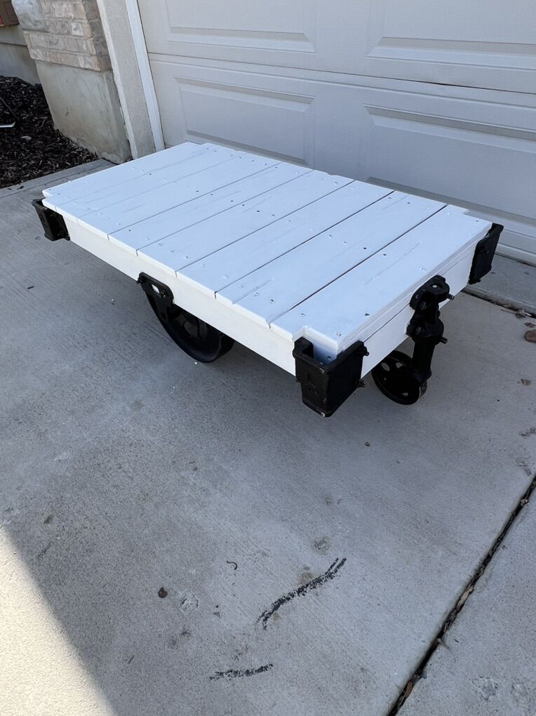 ZelleWhite coffee table with vintage style trolley wheels.