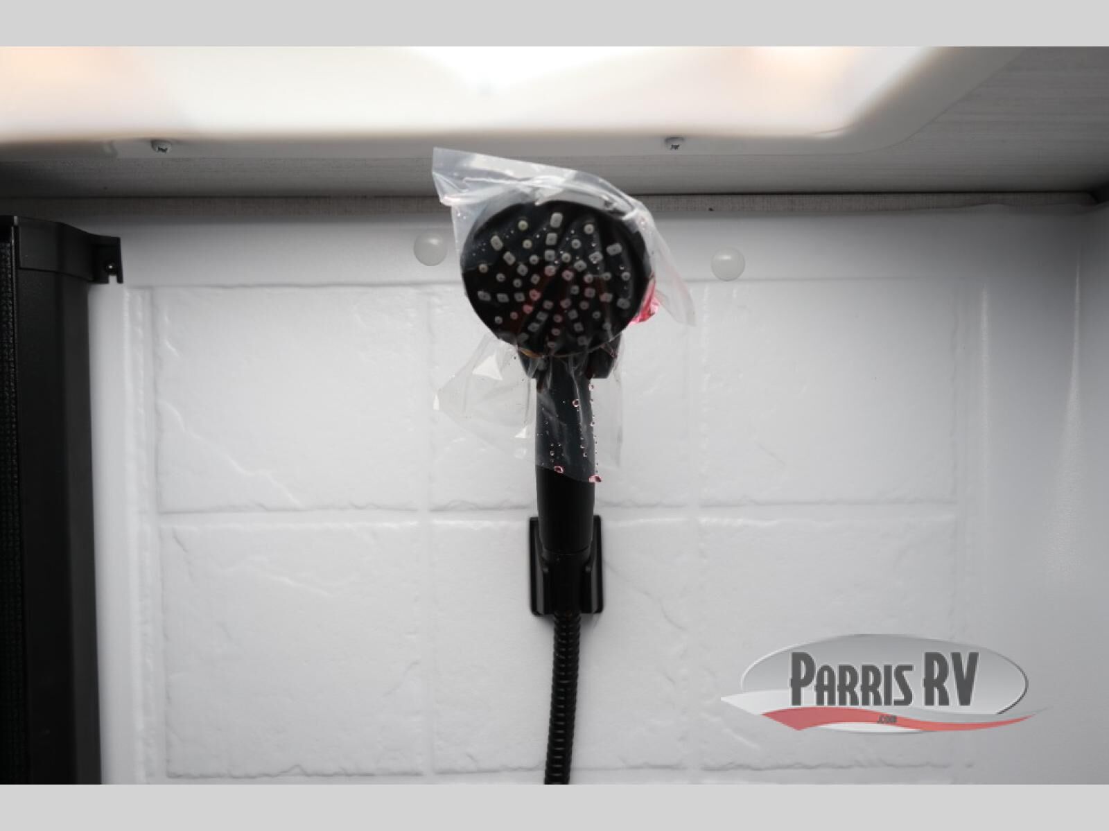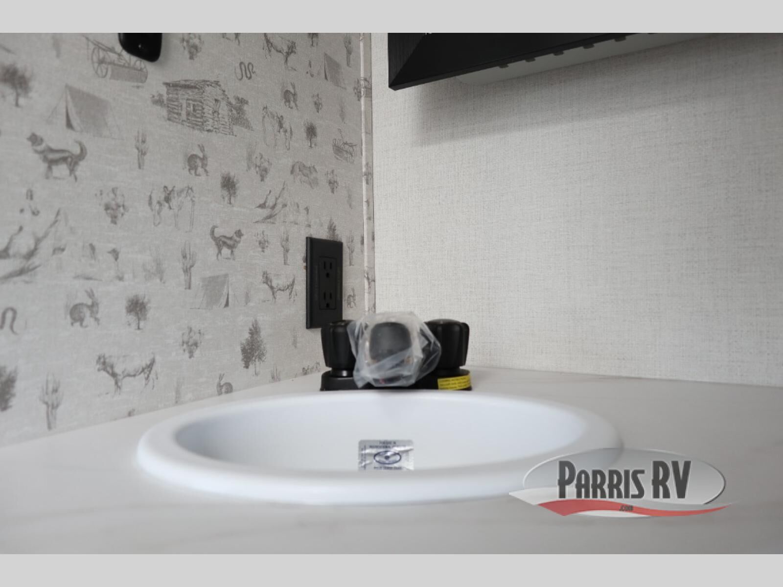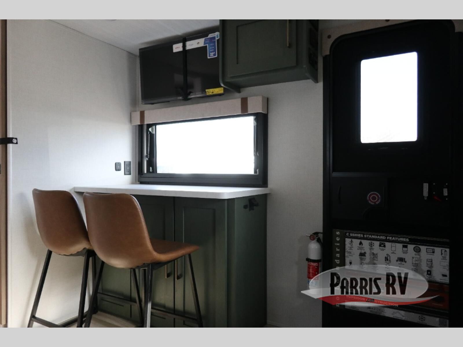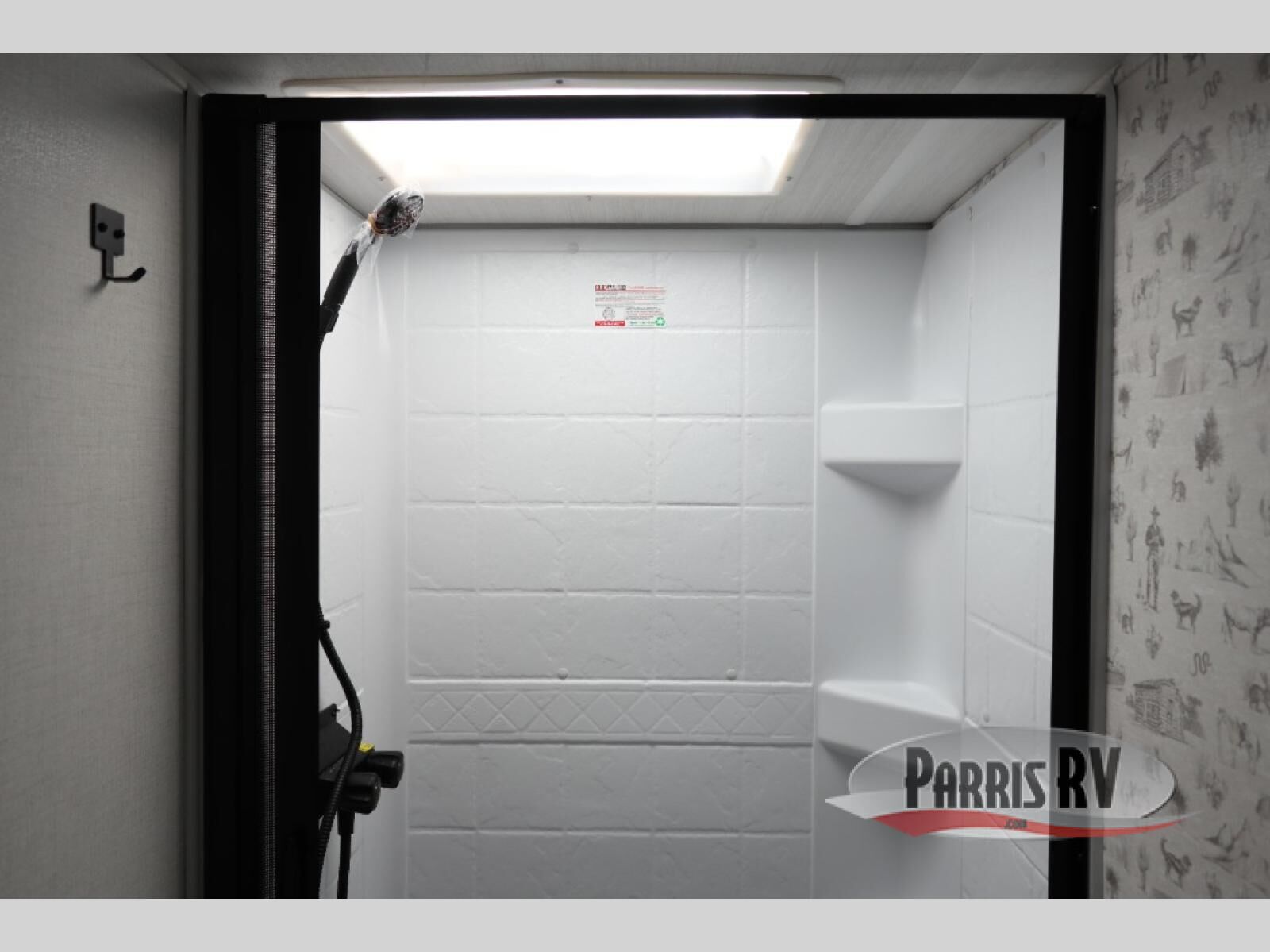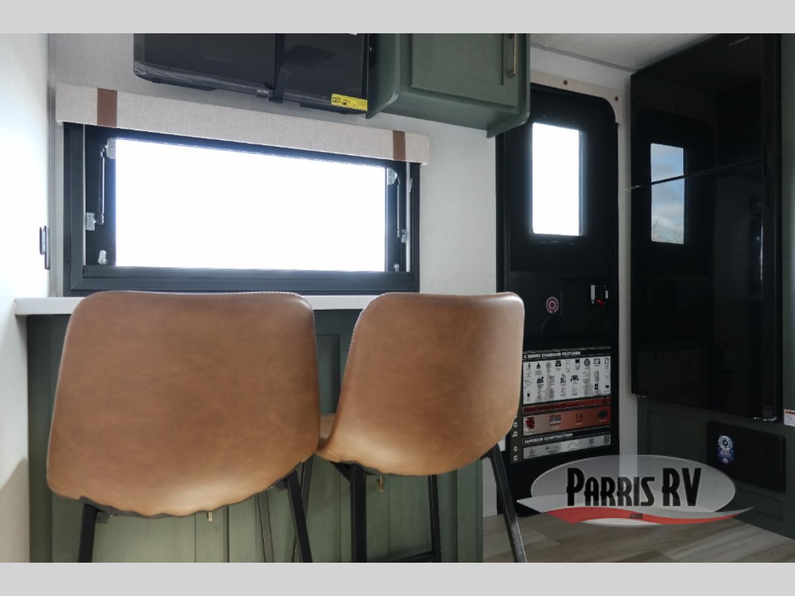 You'll love camping in this couple's trailer! There is a queen bed in the front bedroom, along with dual bedside wardrobes and overhead storage for clothes, books and more. And don't overlook the spacious walk-thru bath! Once you've made breakfast in the rear kitchen or on the outside kitchen, you can dine at the bar top with chairs and a flip-up window. There is also a Trailgate Outdoor Bar if you decide to dine outdoors!