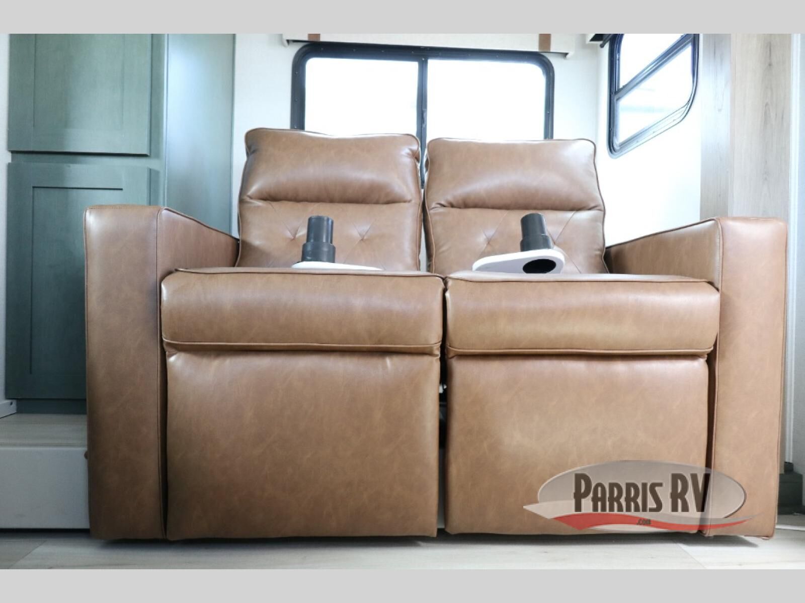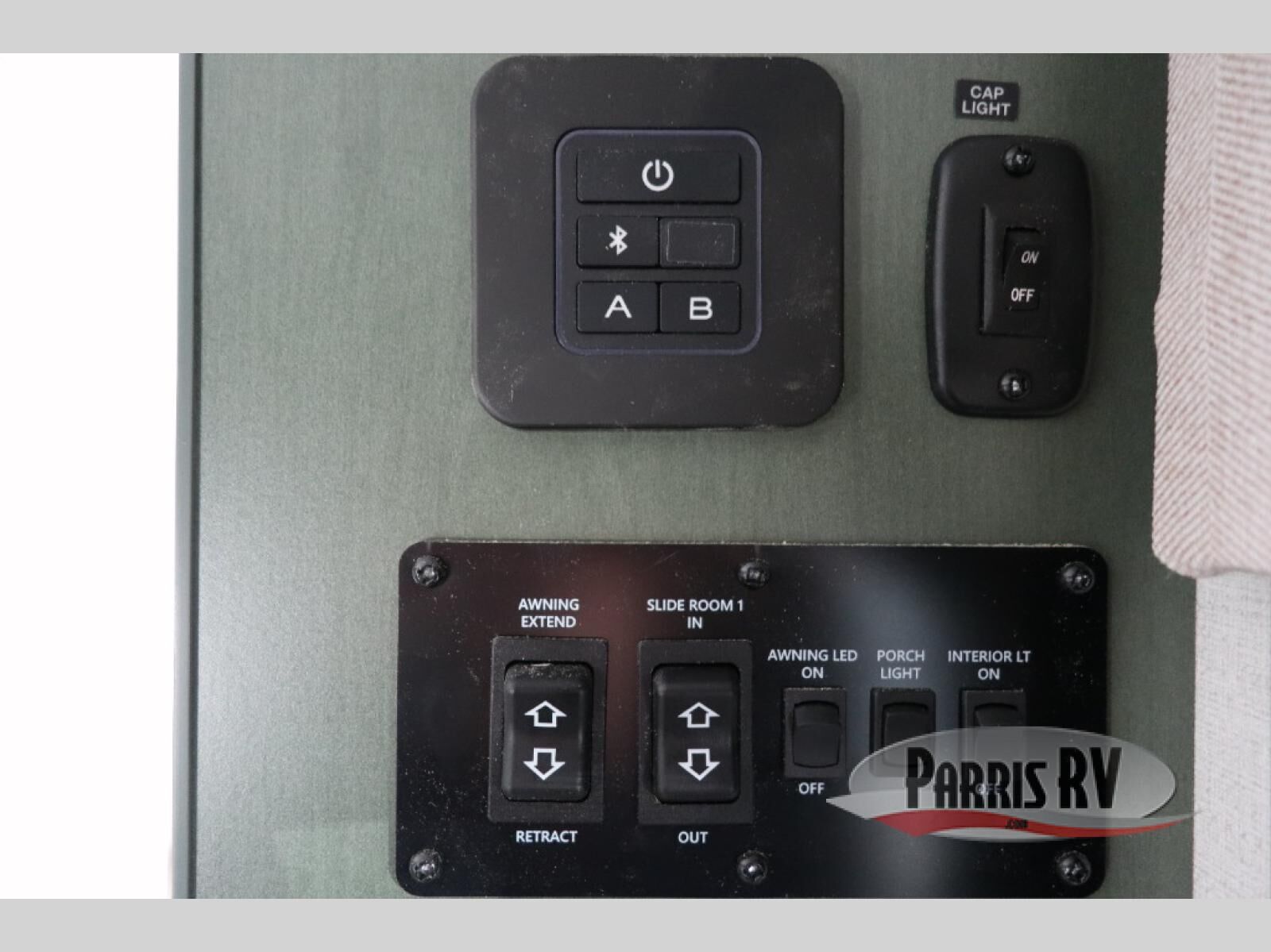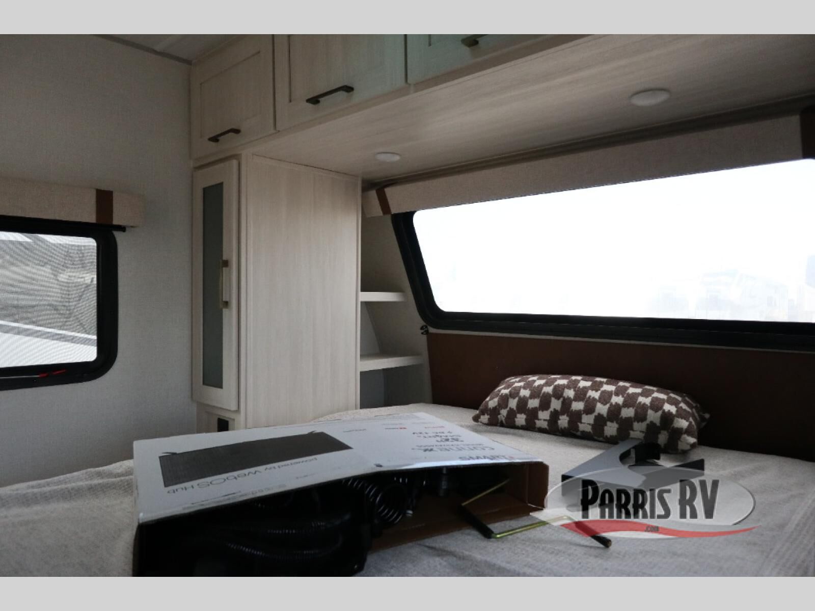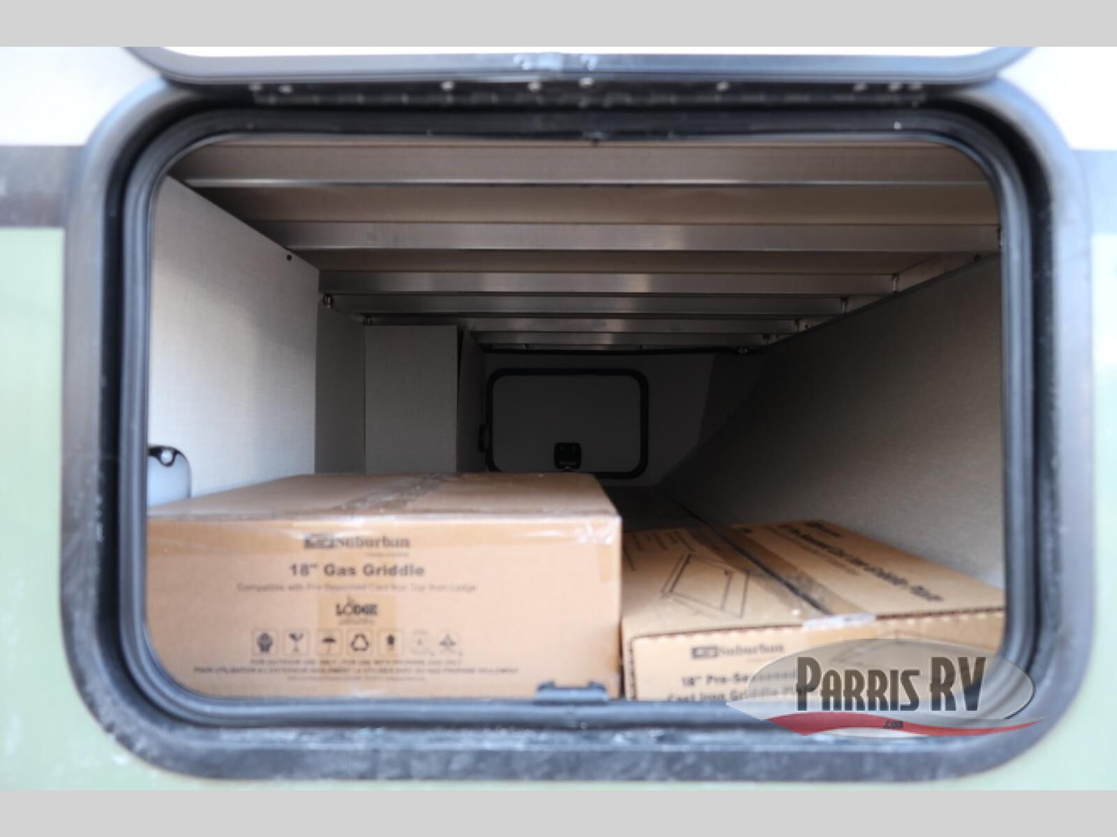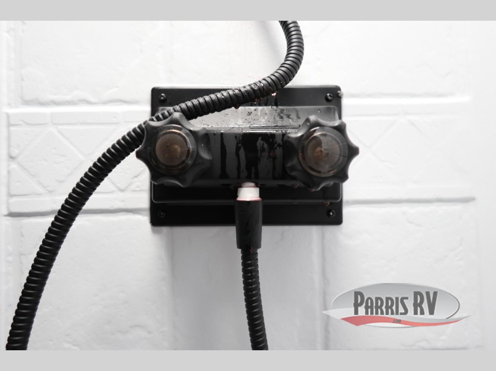 You'll love camping in this couple's trailer! There is a queen bed in the front bedroom, along with dual bedside wardrobes and overhead storage for clothes, books and more. And don't overlook the spacious walk-thru bath! Once you've made breakfast in the rear kitchen or on the outside kitchen, you can dine at the bar top with chairs and a flip-up window. There is also a Trailgate Outdoor Bar if you decide to dine outdoors!