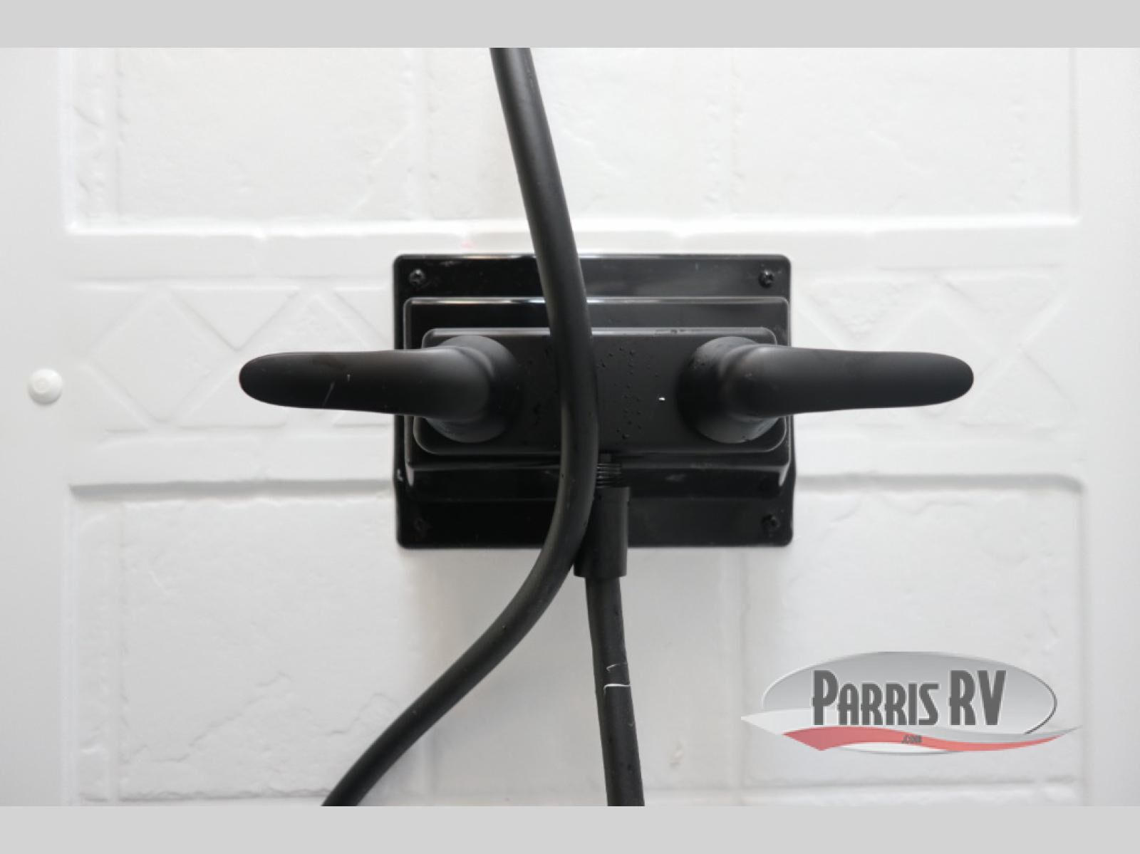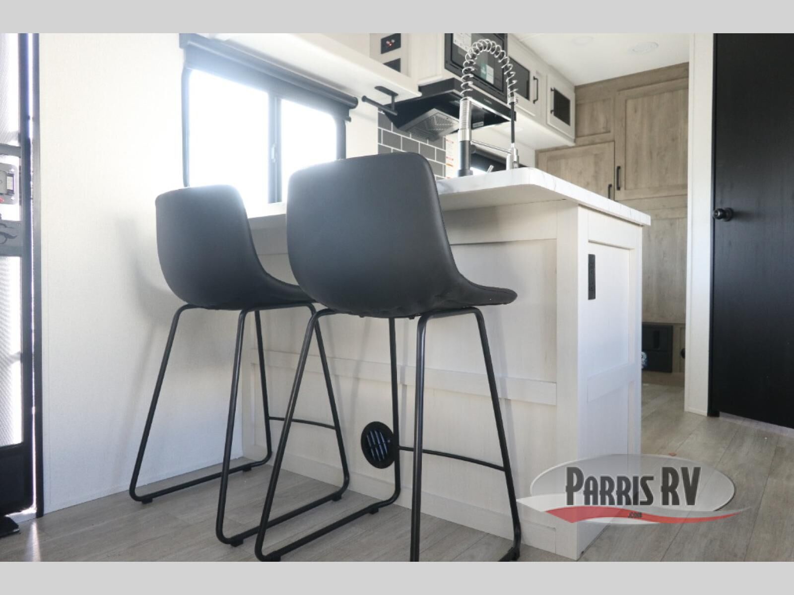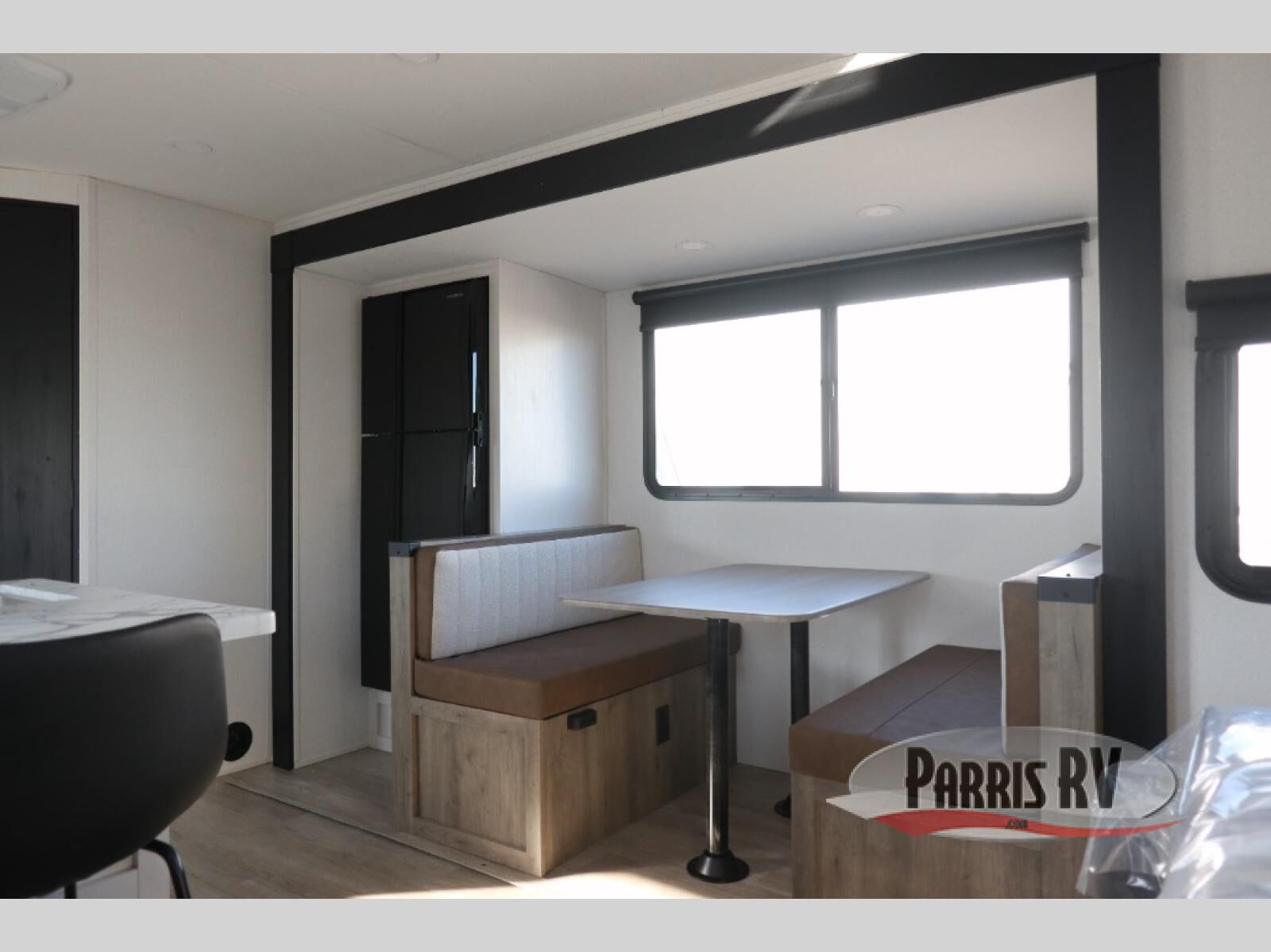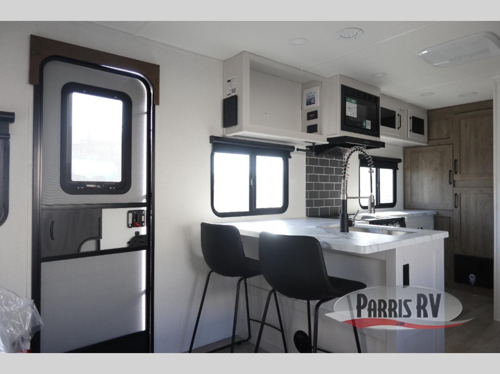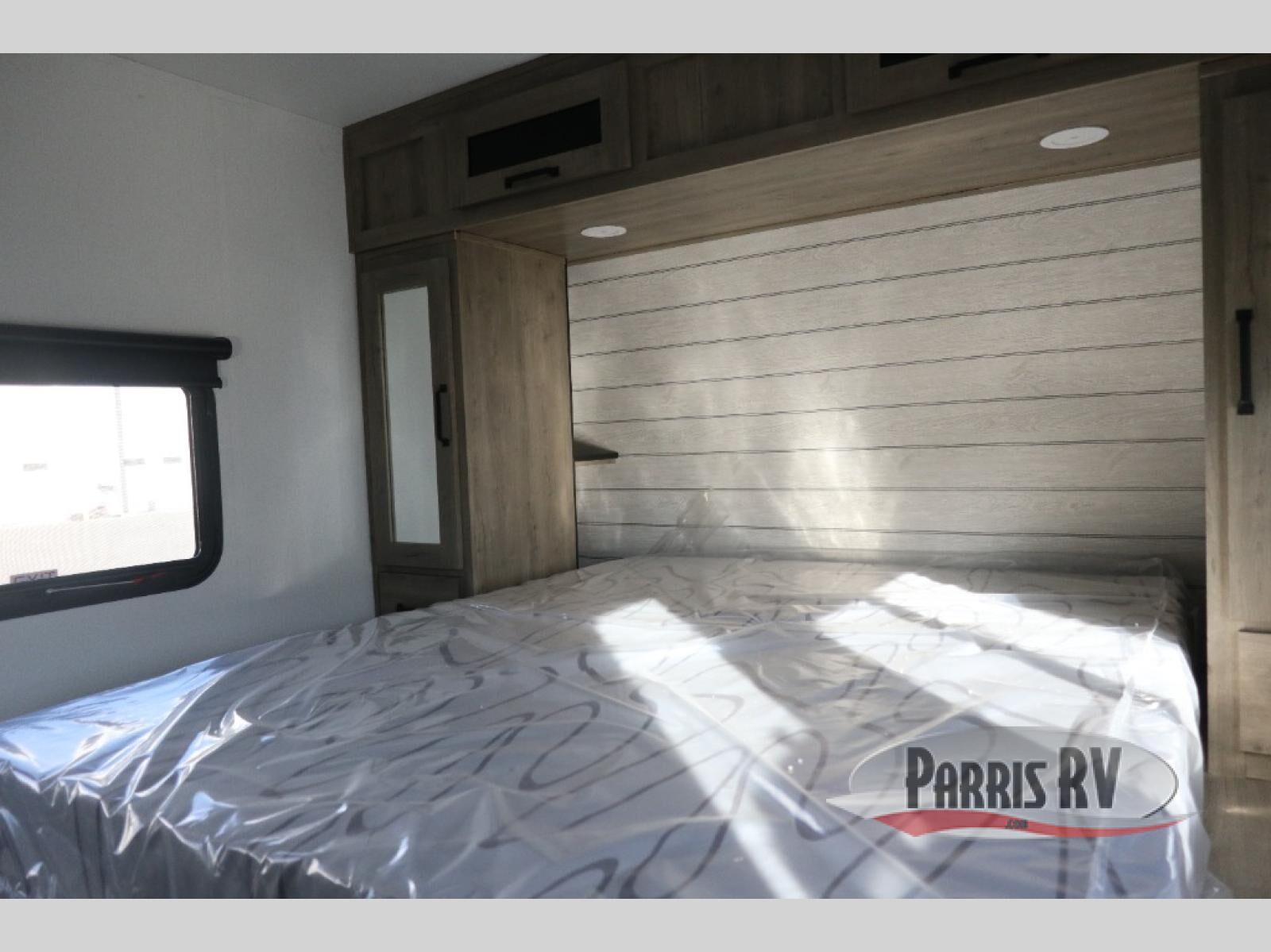 You'll love every minute spent in this travel trailer, whether at the lake or in the woods! Once you arrive at the campground, you can unload the pass-thru storage, then start lunch in the rear corner kitchen. There is a bar top with two seats where you can dine at, and an added booth dinette slide provides more seating space, as well as sleeping space for guests. You'll enjoy having the front RV queen bed to yourselves, and there are dual bedside wardrobes to keep your things tidy.