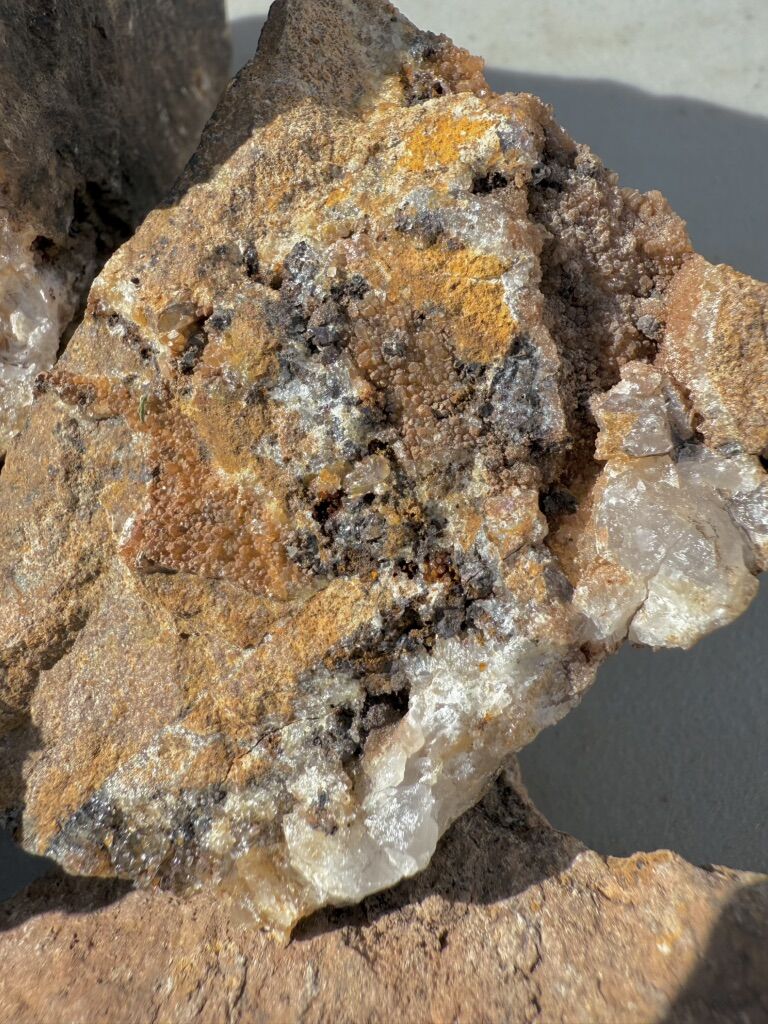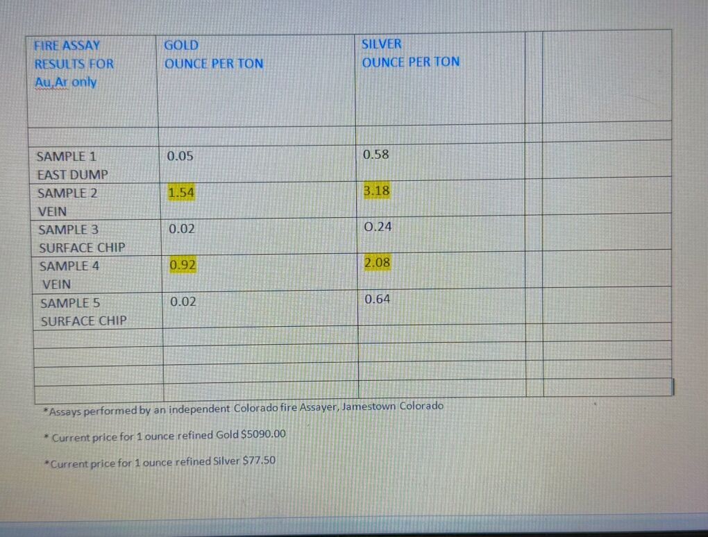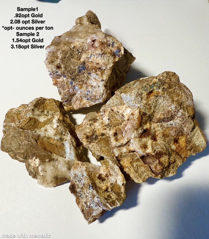 This claim is an Unpatented federal “Lode” mining claim that consists of 20.66 acres of mineral rights 1500’x 600’. Staked, Mapped and recorded with the County and State BLM office There are numerous prospecting pits on the claim, dumps and misc workings. the main is an incline shaft around 75’ deep that has several hundred feet of underground drifts and tunnels. An Old artifact seen underground dates this small mine back over 100 years . Access is about a 20 minute hike from a good road or can get to it with an atv. Initial assaying showing good Gold content and decent initial silver in vein system . the gold is really fine ,but there locked up in the oxidized vein. Samples Showing .92 to 1.54 ounces per ton of gold from one of the veins The gold is associated with small oxidized pyrite nodules running with the quartz and country rock (see in photos). In hydrothermal deposits, gold and electrum (Ag,Au) will precipitate from hydrothermal fluids from surface oxidation of carrier minerals (like pyrites) contributing to the formation of gold and silver inclusions in the oxidized mass.