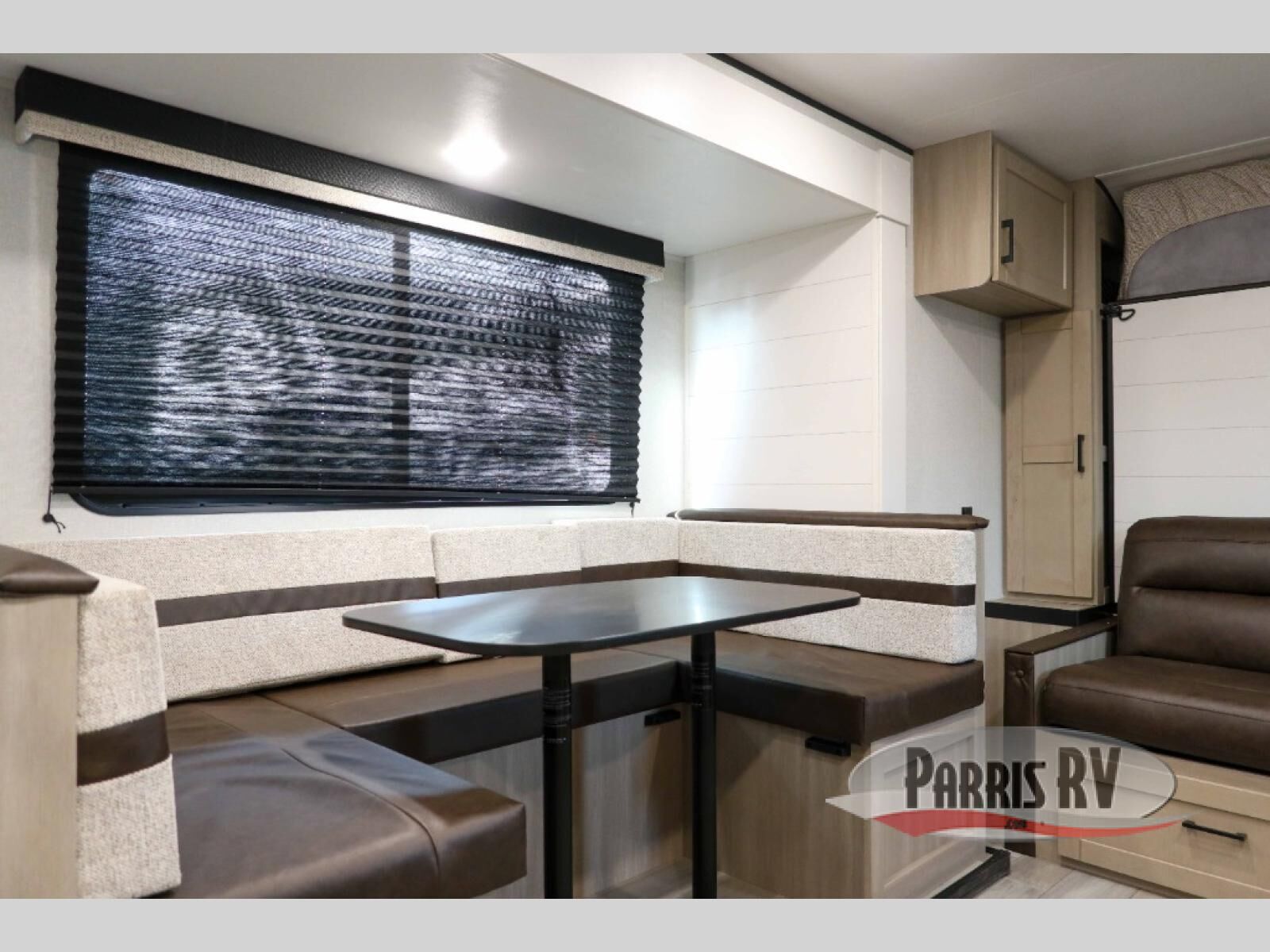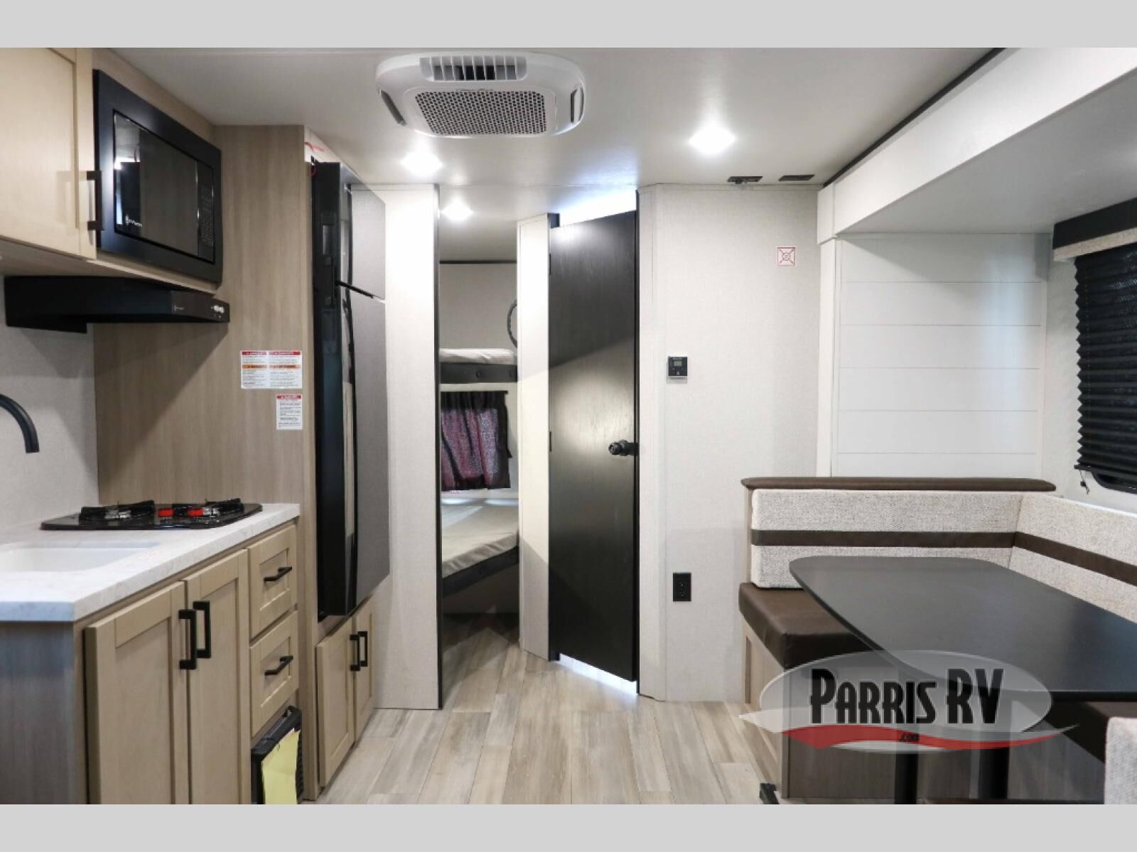 Camping trips are made easy in this travel trailer with double-size bunk beds for guests or little ones. There is a front Murphy bed that will provide you with more space during the day when you put it away to reveal the jack knife sofa. The rear corner full bath includes a foot-flush toilet, a 30" x 36" shower and a sink, so you won't have to leave the camper in the middle of the night. A two-burner cooktop and microwave oven will let you make meals each day, and you can dine around the U-shaped dinette, which is also within a slide out for more space!