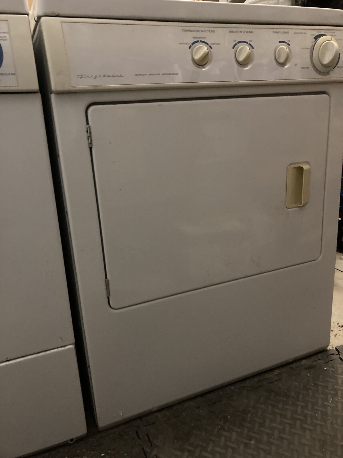 Apartment size stacking washer and dryer set Size for each is 27inches wide, 25 inches deep and 36 inches tall. Dryer works fine but washer needs some repair. Must take both.Frigidaire brand