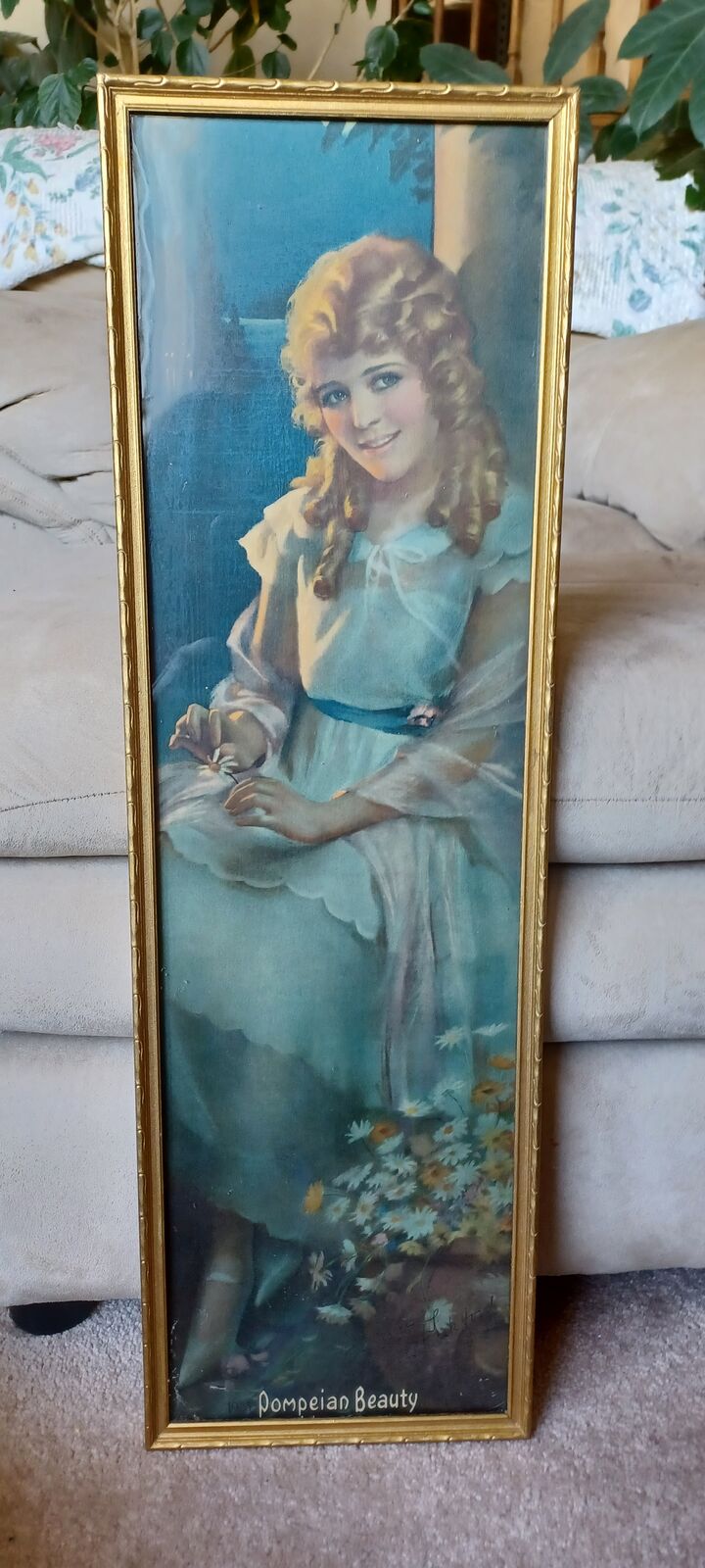 Set of 3 Vintage Victorian "Pompeian Beauty" Mary Pickford gold framed art panels. 1) 1923 "Pompeian Beauty" signed, "Sincerely Mary Pickford" (girl with wringlets).