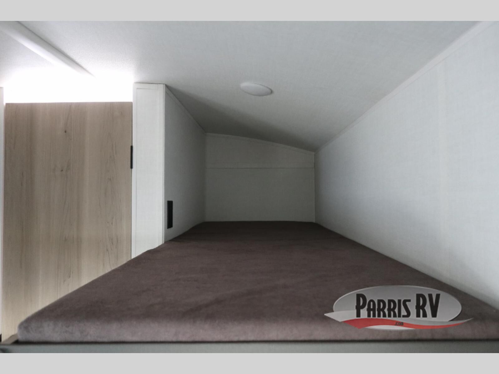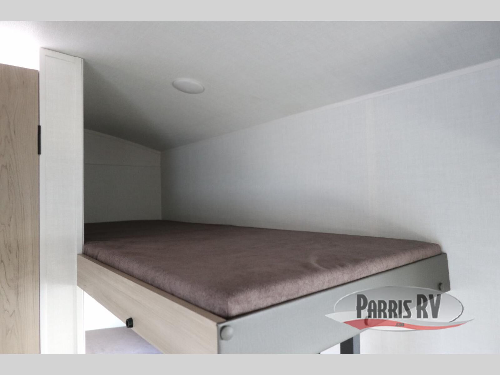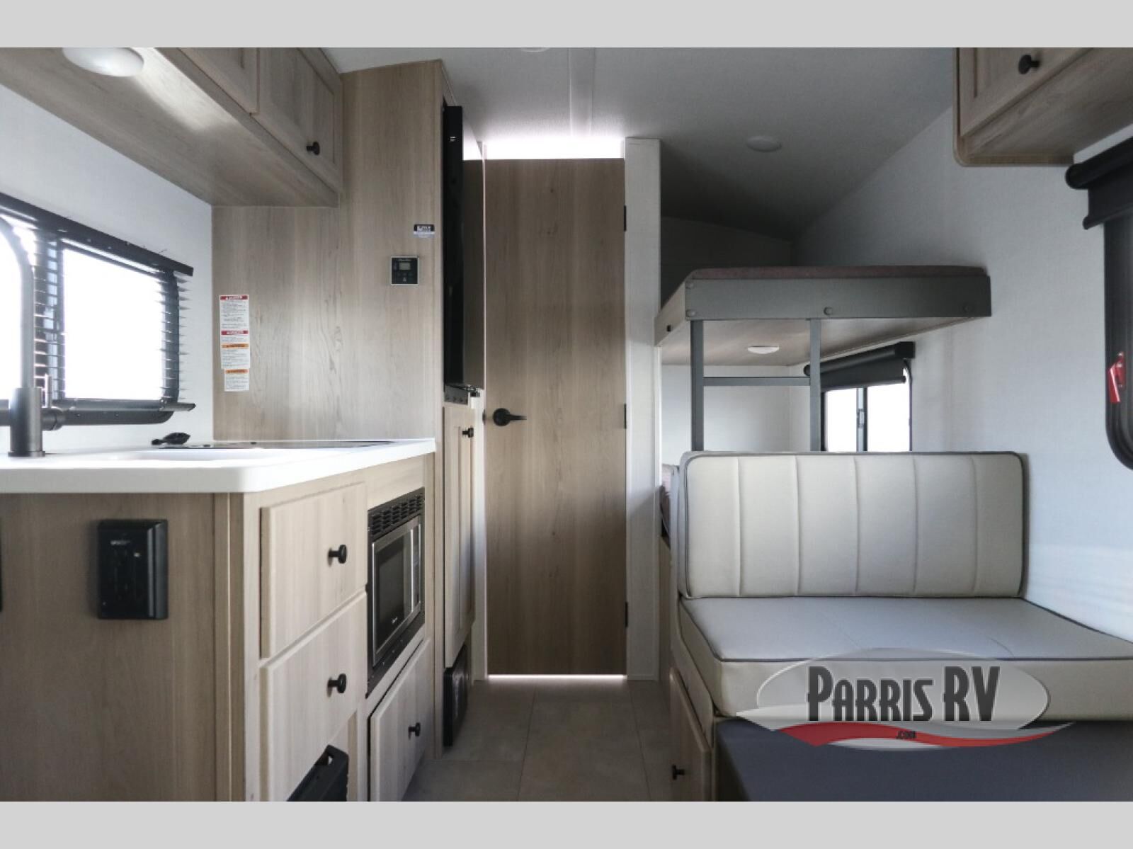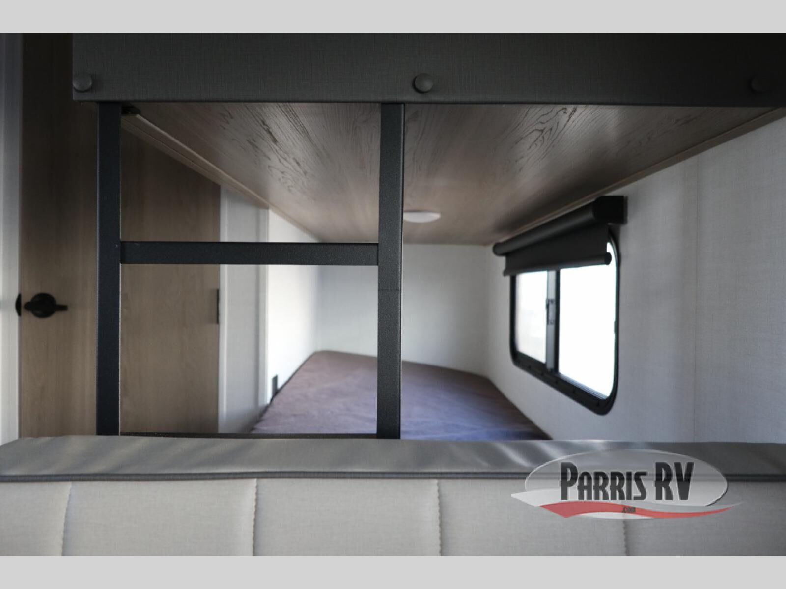 When you enter this compact but mighty trailer, you're greeted by a comfortable 54" x 80" full bed at the front, complete with a shelf and wardrobe to keep your clothing and essentials neatly organized. To one side sits a cozy 32" dinette, perfect for enjoying a meal or playing a board game after a day of exploring. Across from it, the well-equipped kitchen includes a sink, microwave, and refrigerator everything you need to quickly whip up a meal. One rear corner houses a convenient bathroom with a shower and toilet, giving you the comfort of home without relying on campsite facilities. In the opposite corner, 30" x 74" double bunks provide extra sleeping space so more guests can join the adventure.