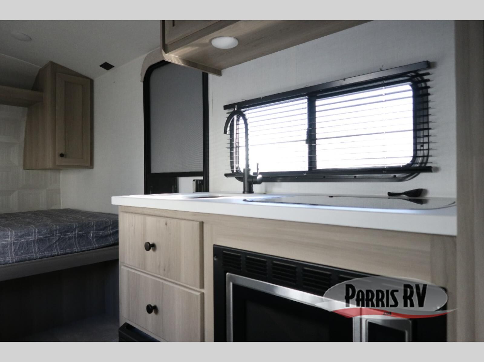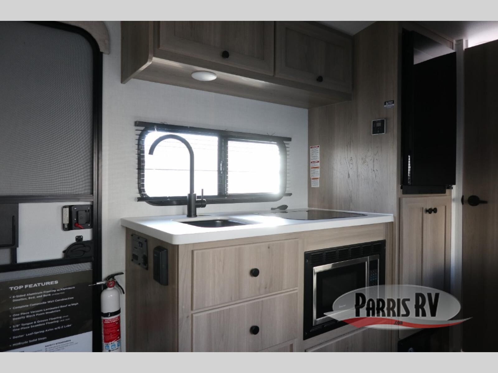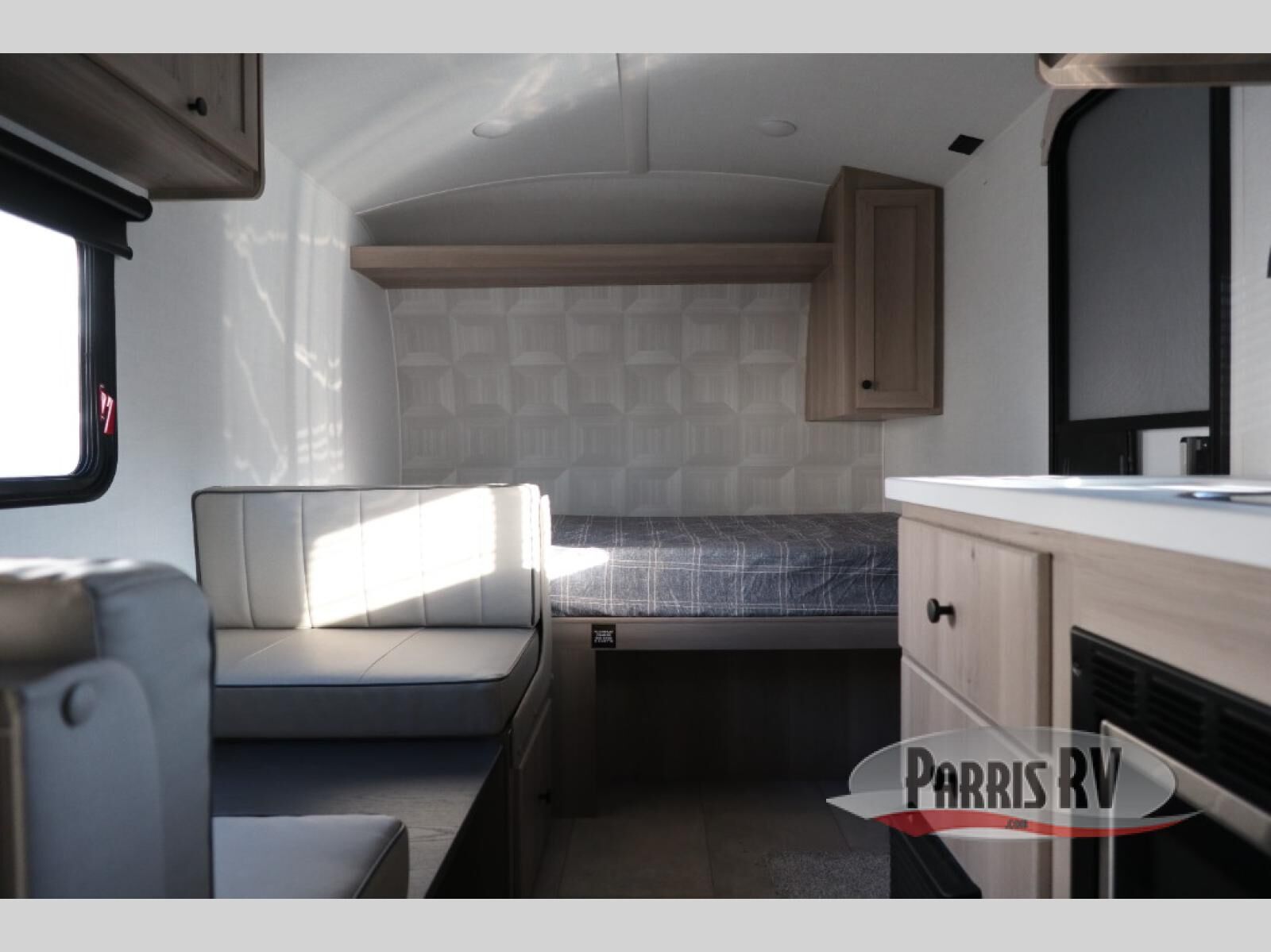 When you enter this compact but mighty trailer, you're greeted by a comfortable 54" x 80" full bed at the front, complete with a shelf and wardrobe to keep your clothing and essentials neatly organized. To one side sits a cozy 32" dinette, perfect for enjoying a meal or playing a board game after a day of exploring. Across from it, the well-equipped kitchen includes a sink, microwave, and refrigerator everything you need to quickly whip up a meal. One rear corner houses a convenient bathroom with a shower and toilet, giving you the comfort of home without relying on campsite facilities. In the opposite corner, 30" x 74" double bunks provide extra sleeping space so more guests can join the adventure.