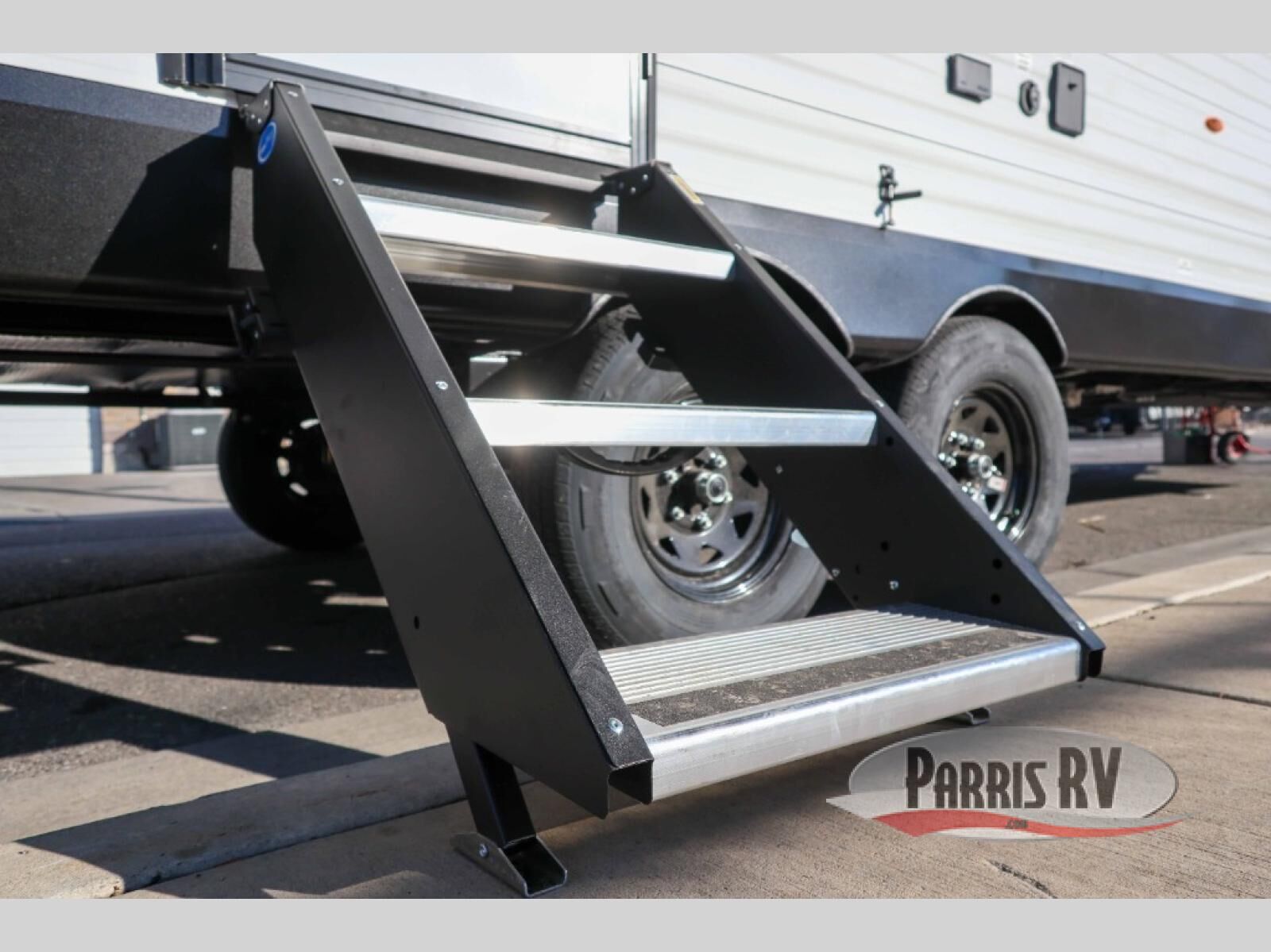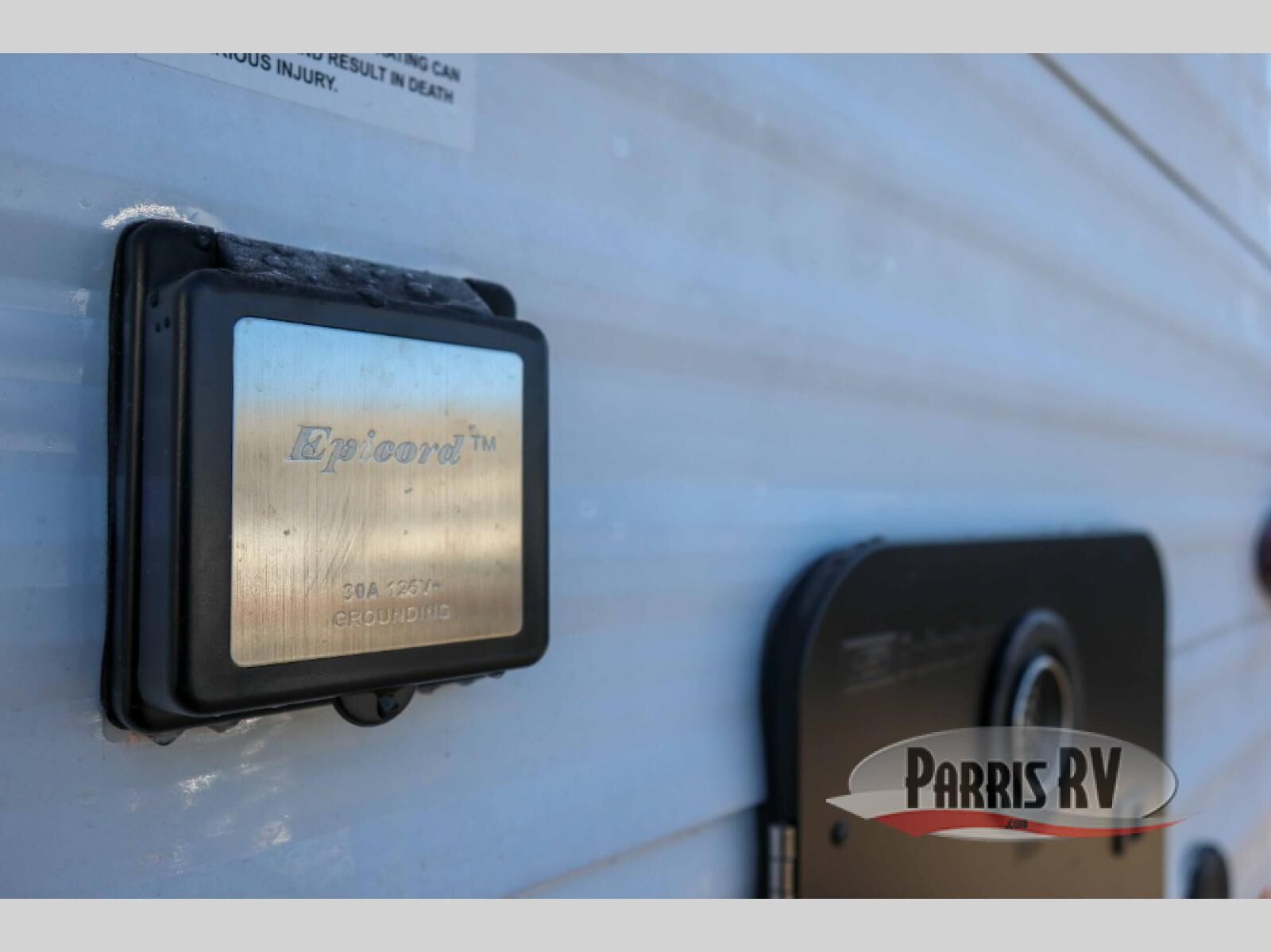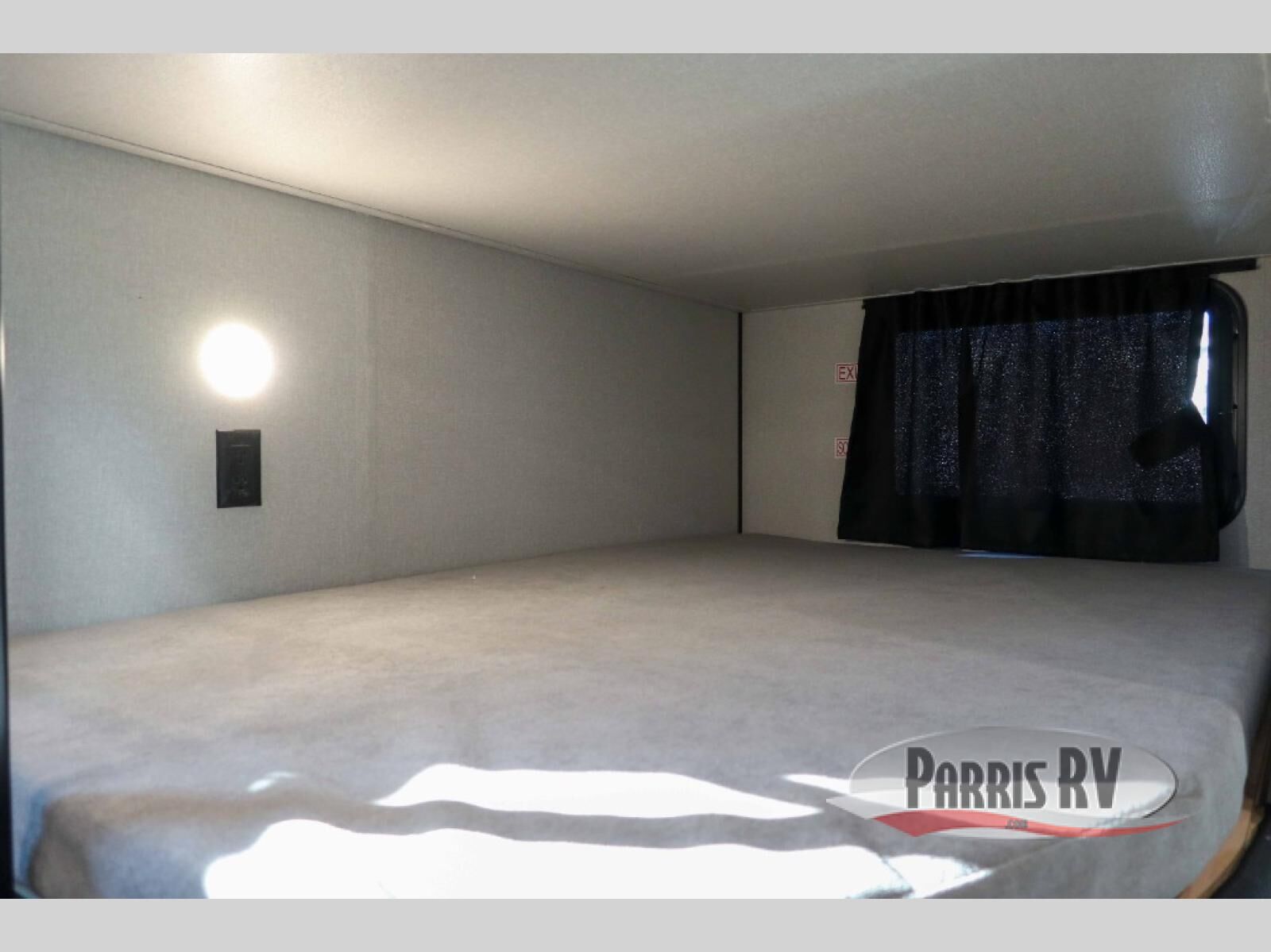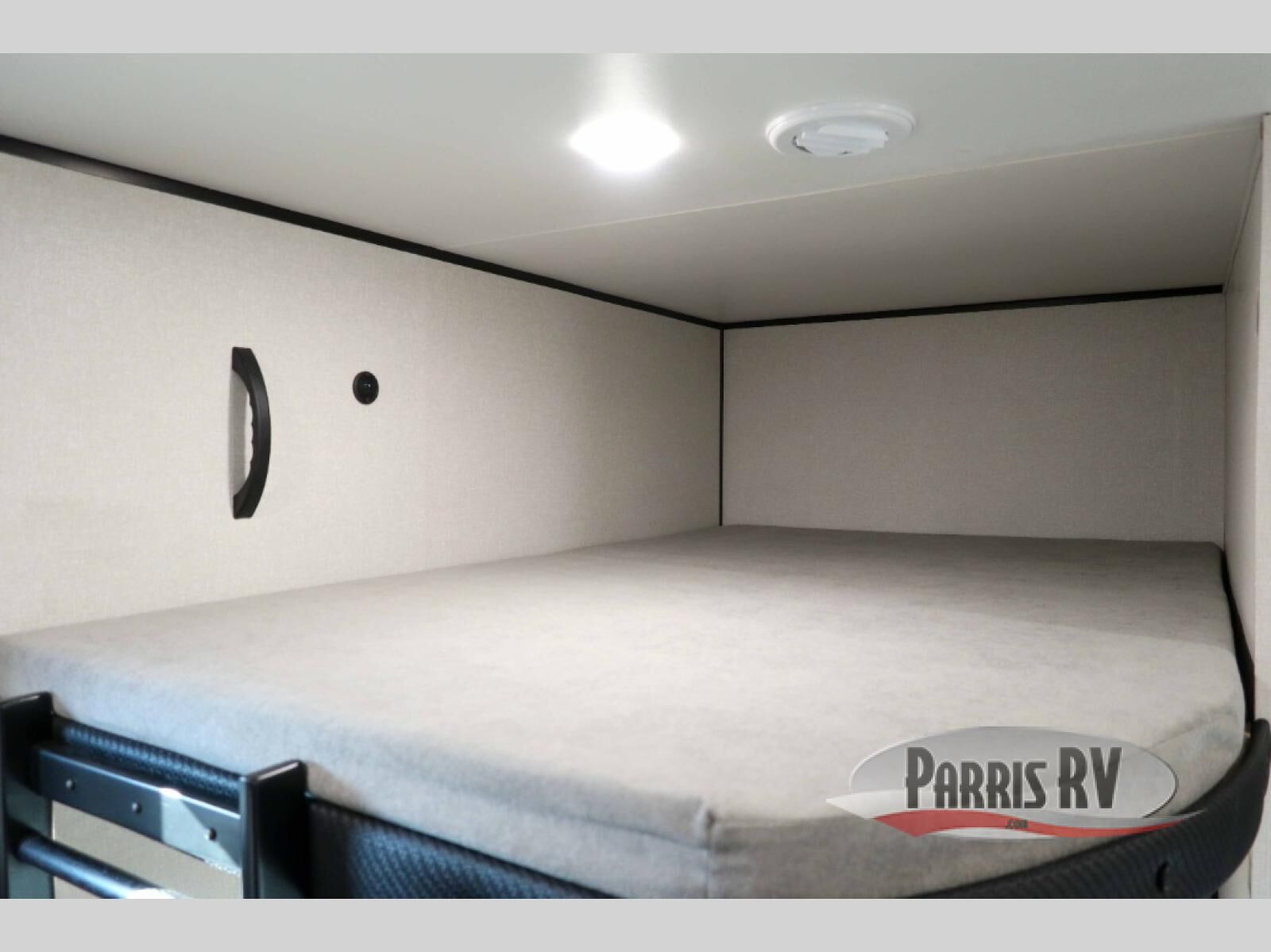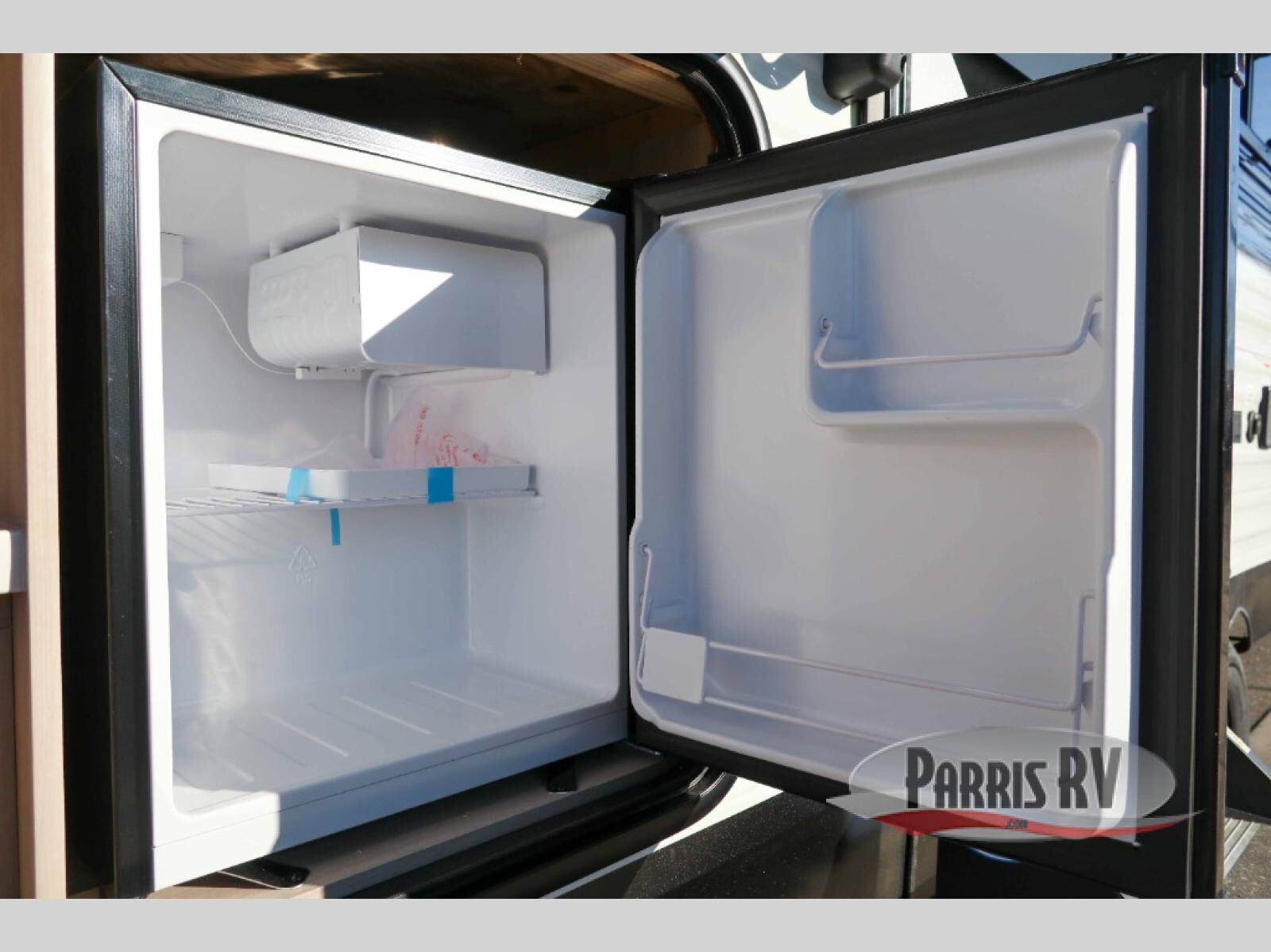 The whole gang will love weekends in the woods with this travel trailer in tow! There is a large slide out for added space, and here you'll find the jack-knife sofa and booth dinette. There is also an entertainment center with a fireplace with a hidden pantry behind, along with storage shelves for snacks, board games and more! You can claim the front private bedroom to yourselves, while your guests or little ones take the double-size bunks. A full kitchen is complete with a three-burner cooktop and microwave oven to make meals each day, plus a 12V refrigerator and pantry for food storage. This unit also includes an outdoor kitchen with a refrigerator to keep cold drinks ready to enjoy!