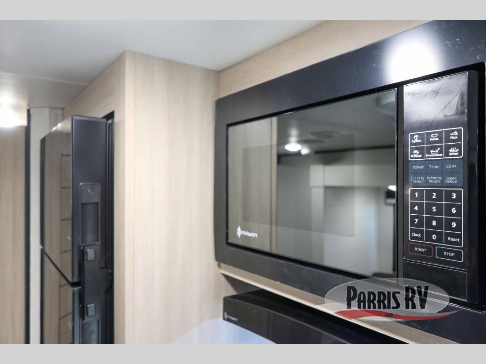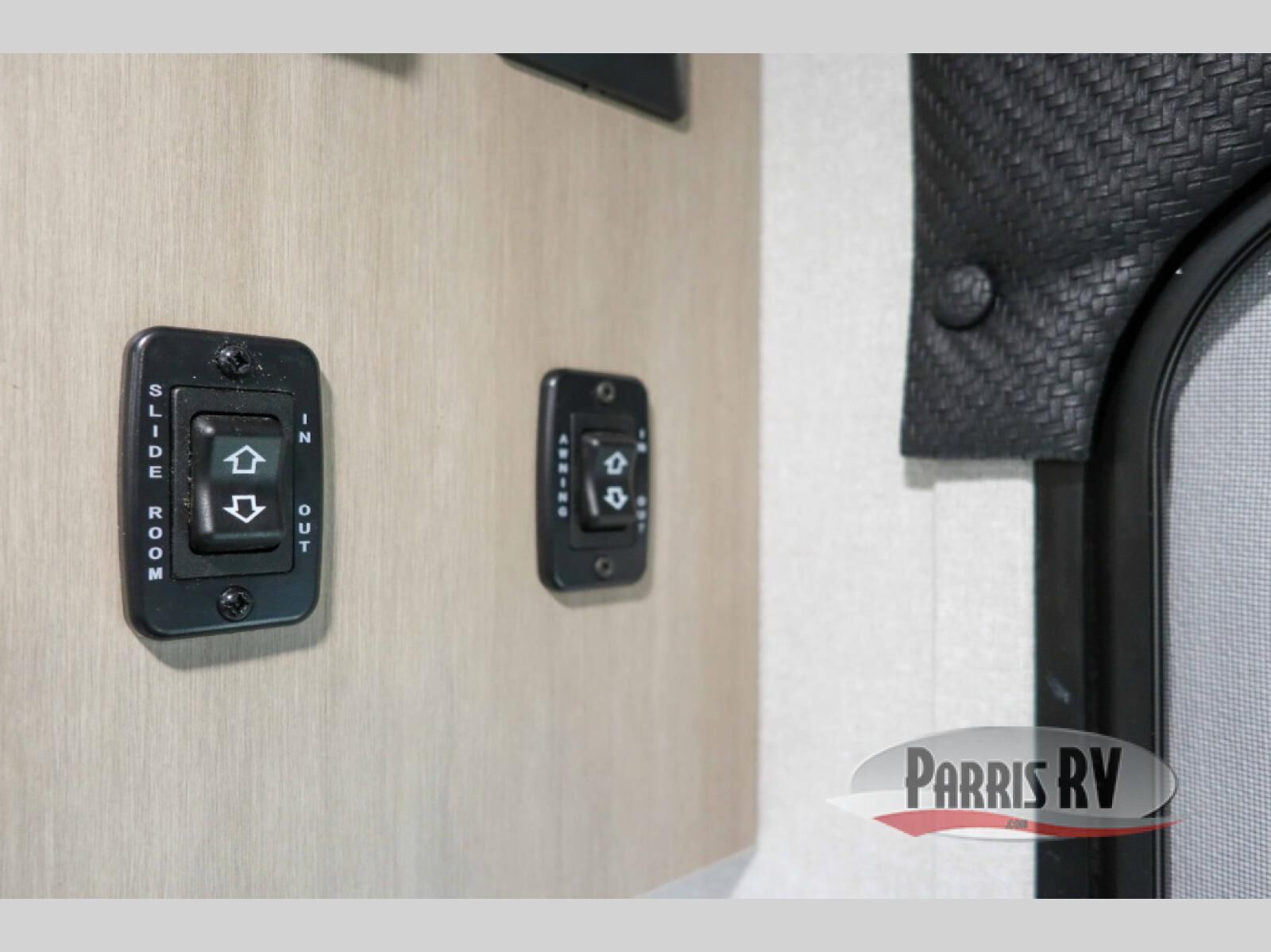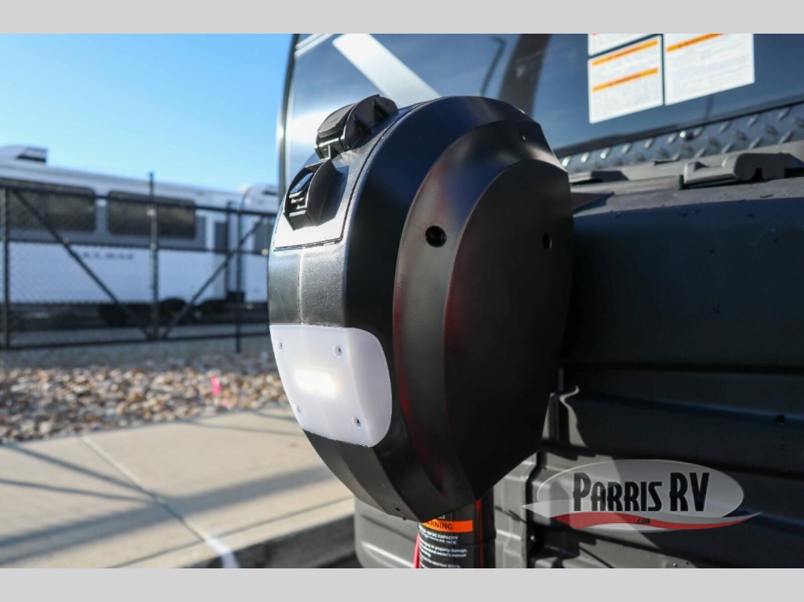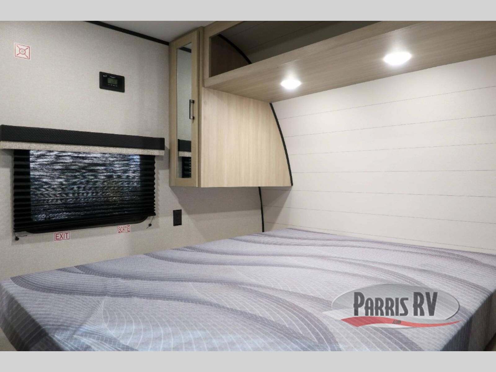 The whole gang will love weekends in the woods with this travel trailer in tow! There is a large slide out for added space, and here you'll find the jack-knife sofa and booth dinette. There is also an entertainment center with a fireplace with a hidden pantry behind, along with storage shelves for snacks, board games and more! You can claim the front private bedroom to yourselves, while your guests or little ones take the double-size bunks. A full kitchen is complete with a three-burner cooktop and microwave oven to make meals each day, plus a 12V refrigerator and pantry for food storage. This unit also includes an outdoor kitchen with a refrigerator to keep cold drinks ready to enjoy!