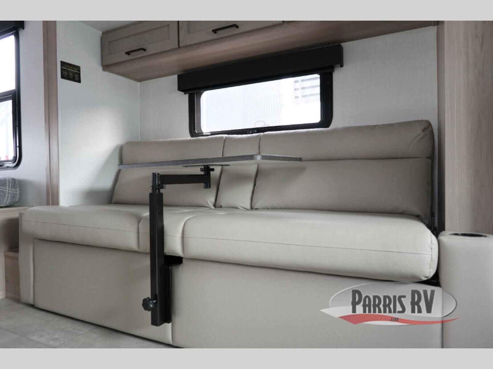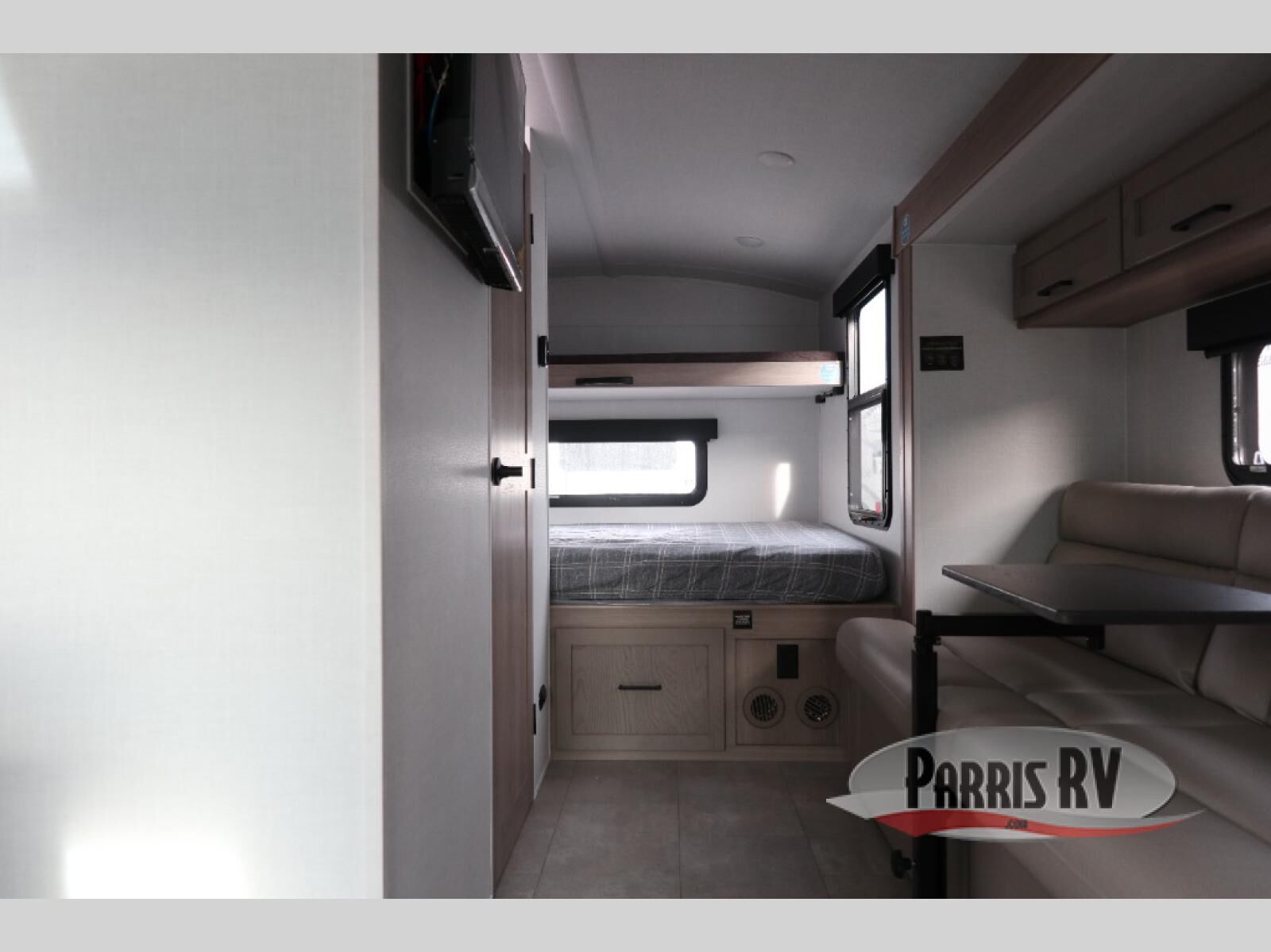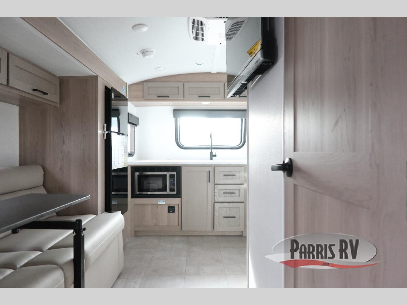 Are you looking for a lightweight trailer with at-home comforts? Take a look at this single slide out unit that can sleep three to four each night. There is a queen-size bed in the back with a 26" x 80" flip-up bunk for cozy sleeping space, a 72" sofa with cupholders to relax on, plus a 12V TV for movie nights! The front kitchen includes a 12V refrigerator to store food, plus a microwave oven and a gas oven to cook meals each day.