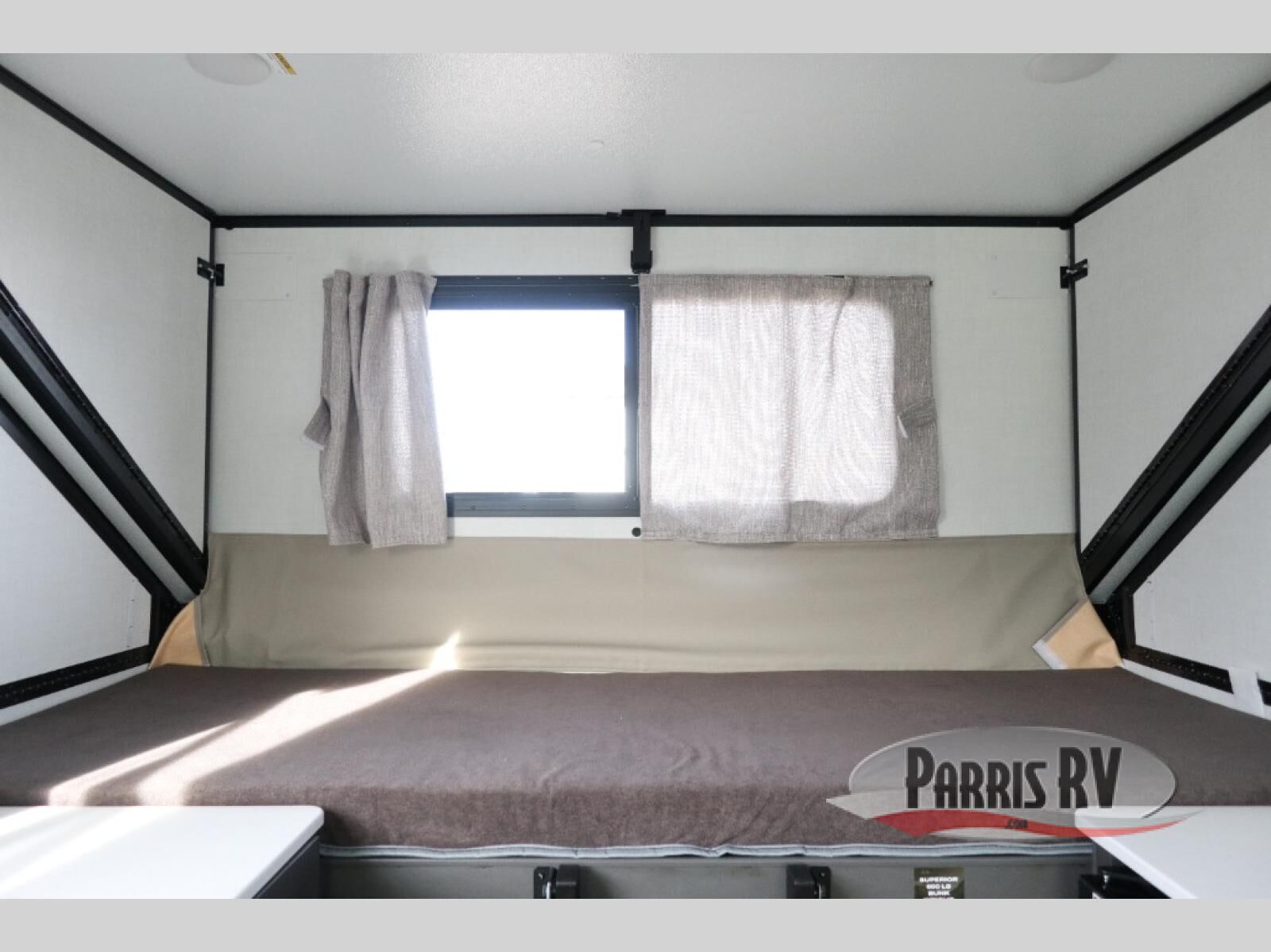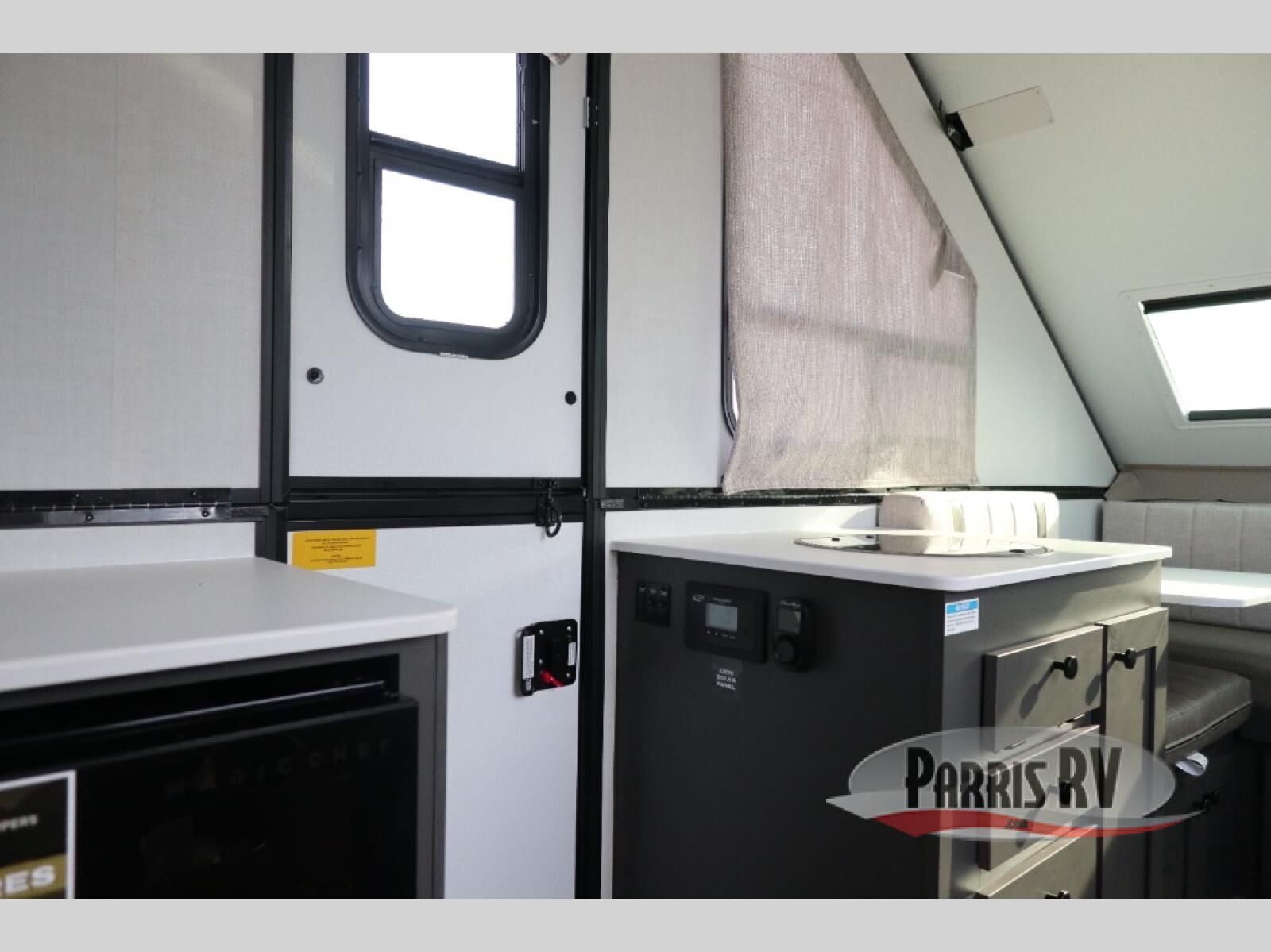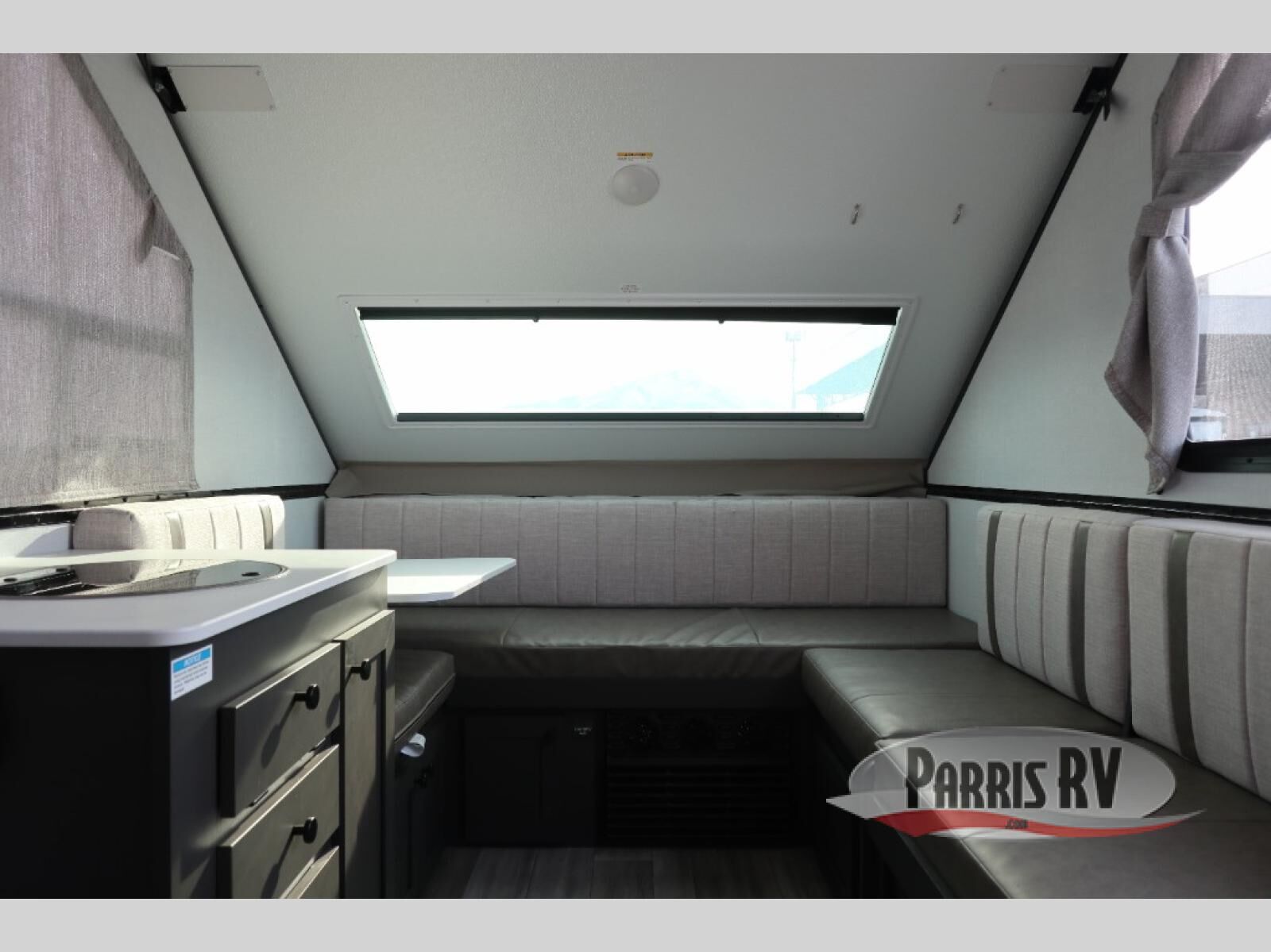 The gaucho bed is a comfy retreat, perfect for lounging or snoozing. The table transforms into a workspace or dining area, making it a great spot for meals or games. Beat the heat with the under-bunk air conditioner, keeping you chill even on the warmest days. The toilet is a welcome convenience, and the dormer adds a touch of extra headroom and natural light. The fridge keeps your snacks and drinks fresh, while the bunk bed provides additional sleeping space for kids or friends. And in the exterior, the pass-thru storage is perfect for stashing your outdoor gear, toys, and essentials, so you can bring everything you need for a blast.