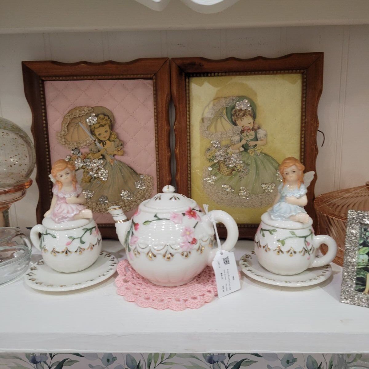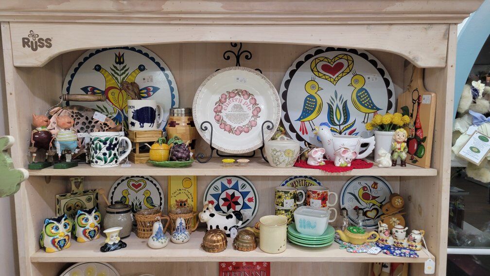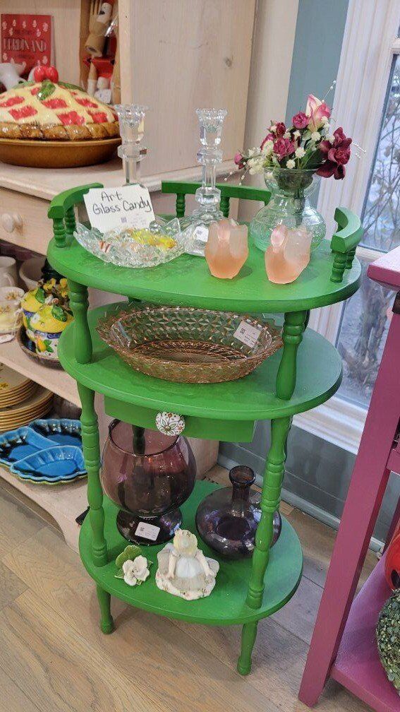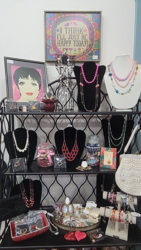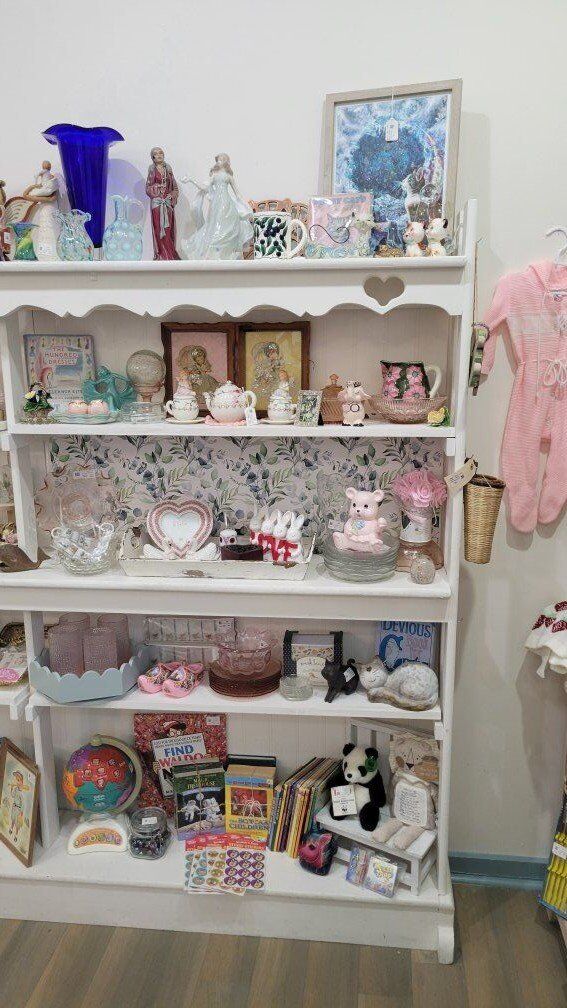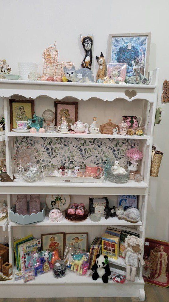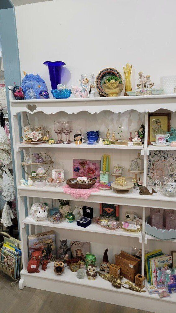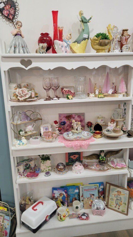 Think pink glass, charming figurines, vintage books, jewelry, cottagecore, woodland whimsy, and those special finds you don’t see every day.