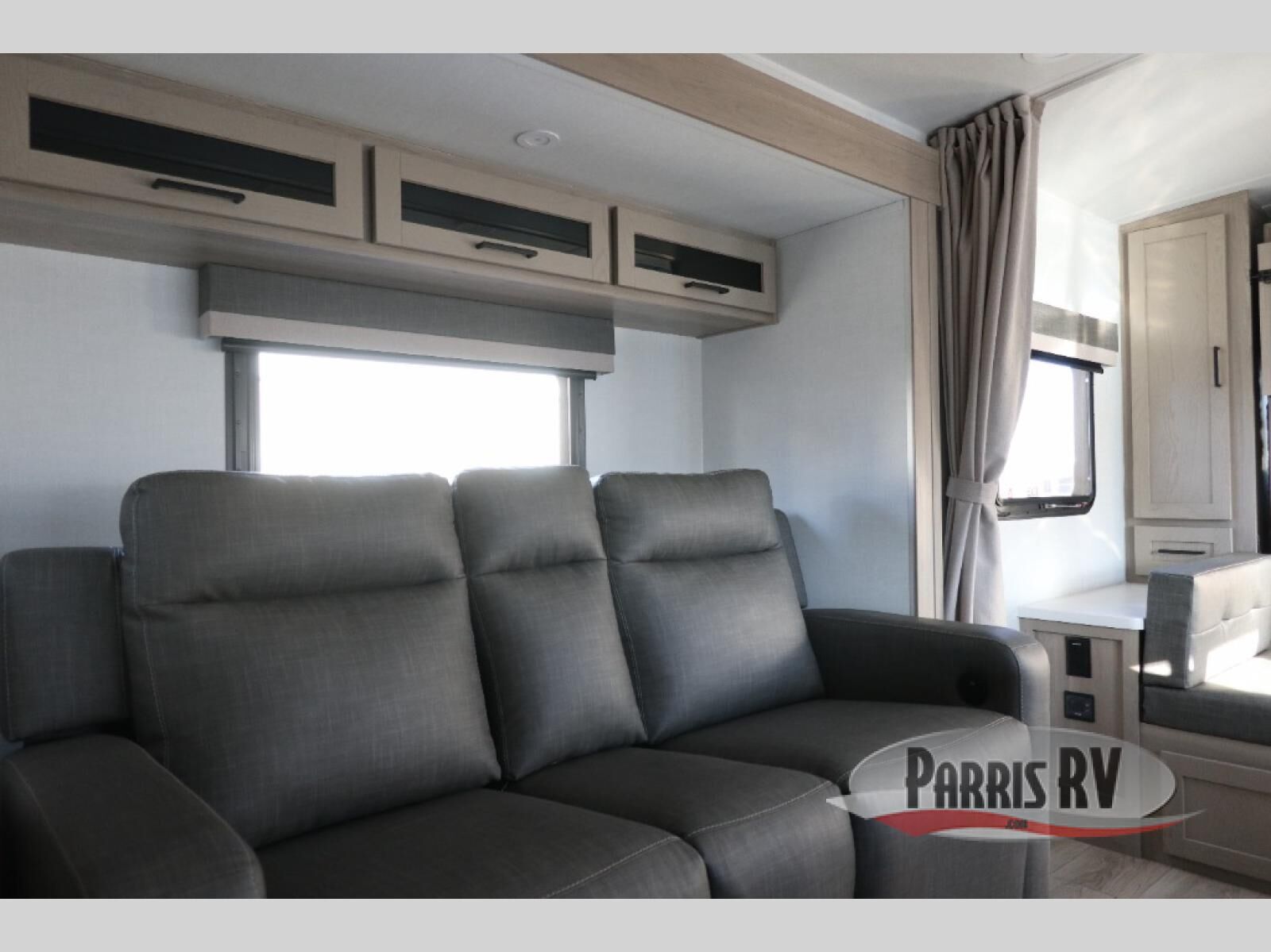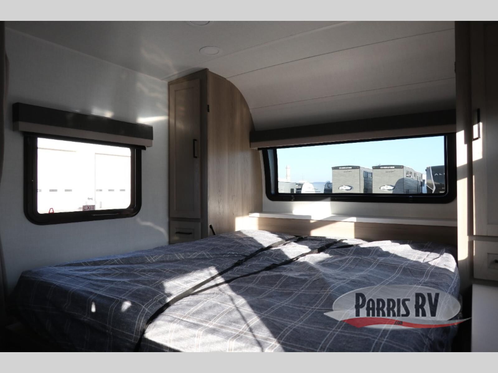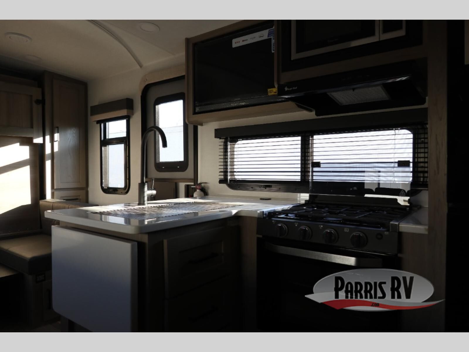 This versatile travel trailer is perfect for weekend camping trips to your favorite park! Once you arrive at your site, you can unload the pass-thru storage, then put out the 15' power awning and relax in your camp chairs. The cooktop and microwave inside will let you make lunch when you get hungry, and there is a theater seat slide out if you want a comfy place to relax. There is also a 30" x 80" booth dinette up front where you can dine together and play games in the evenings, and when you're ready for bed, the 60" x 74" Murphy bed can be folded down over the dinette. This unit includes plenty of storage spaces, including dual bedside wardrobes, a kitchen pantry, and a linen closet in the full rear bath!