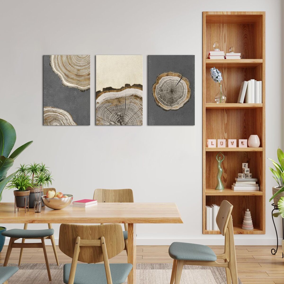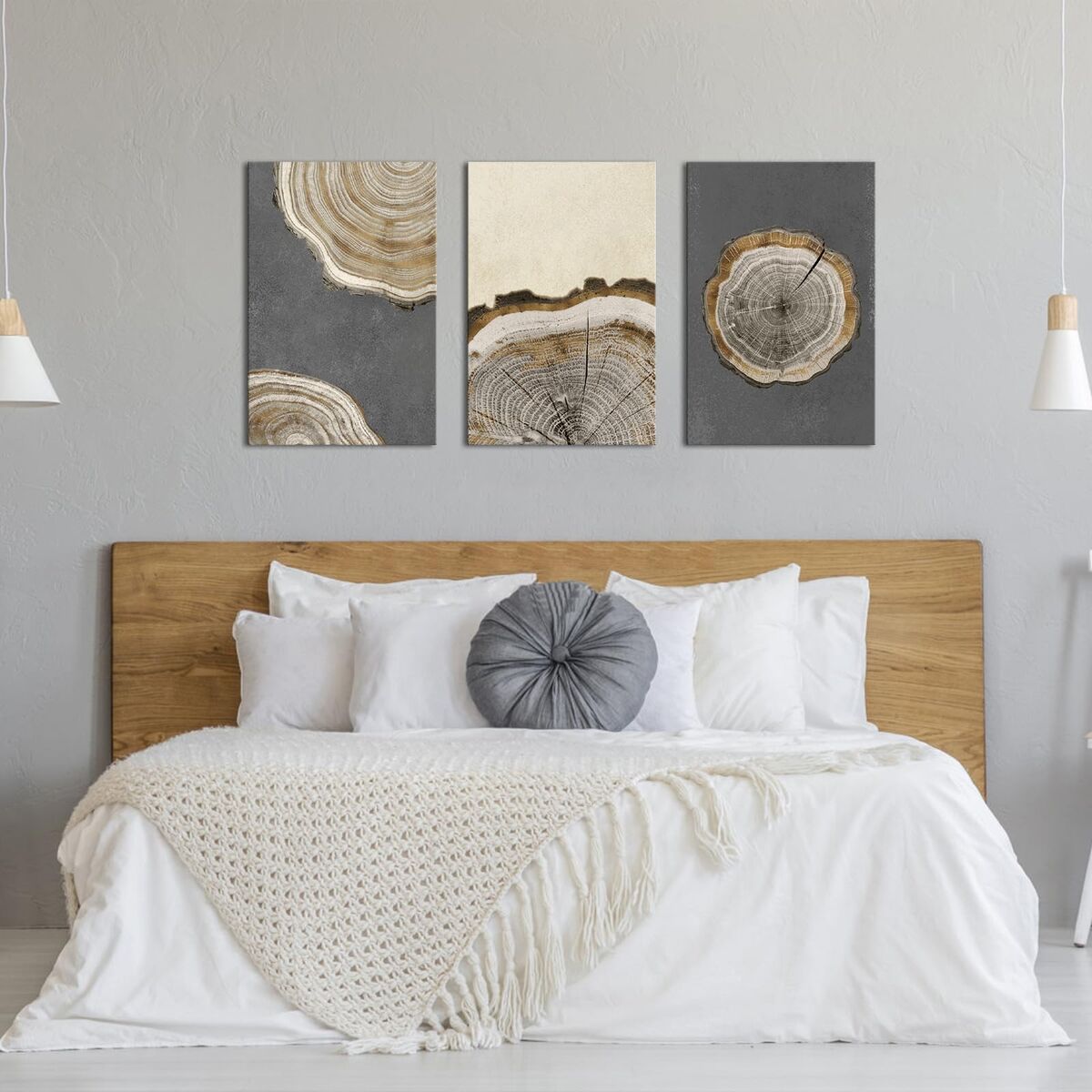 Crafted with meticulous attention to detail, each canvas showcases the intricate and mesmerizing concentric circles found within the cross-sections of trees. The neutral color palette, ranging from warm beiges to cool grays, allows these artworks to seamlessly blend into any decor style Measuring 16" x 24" each, these gallery-wrapped canvases create a striking focal point when hung together as a triptych or individually as statement pieces. Embrace the timeless beauty of nature's organic designs and transform your walls into a serene Ready to Hang: Gallery Wrapped on Solid Wood Bars Package: Comes with 4 Corner Protection, Shrink Wrap, Well Packed in Carton Box Good Wall Decor Idea: Each Canvas is Suitable for your living room, dining room, bedroom, bathroom, office and so on