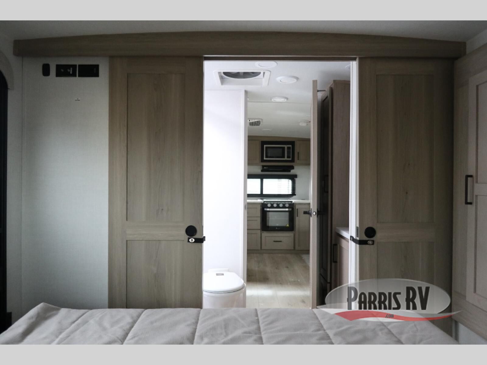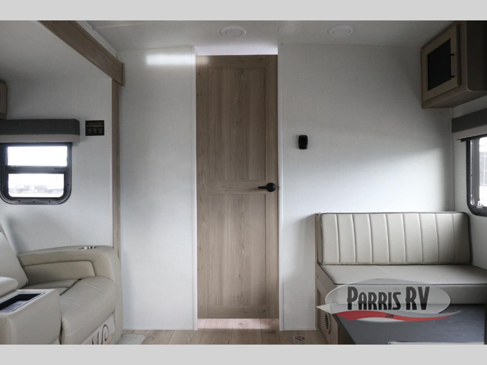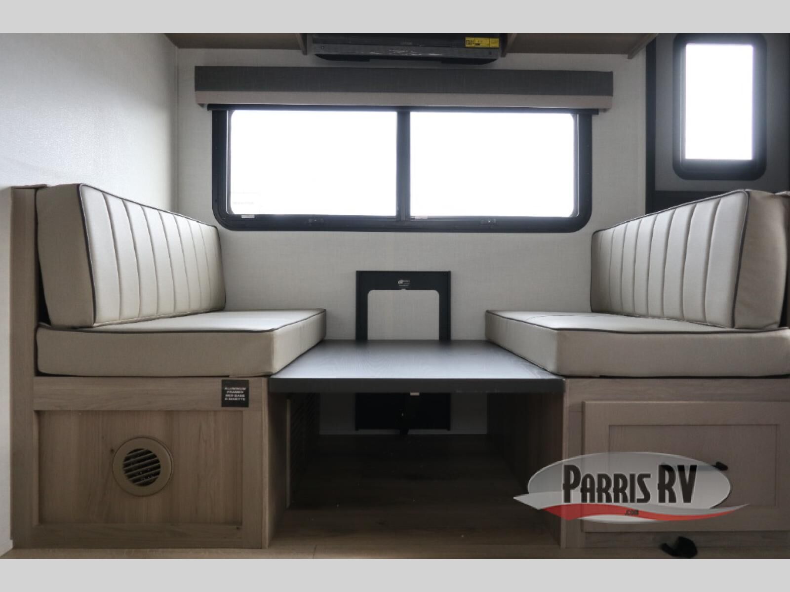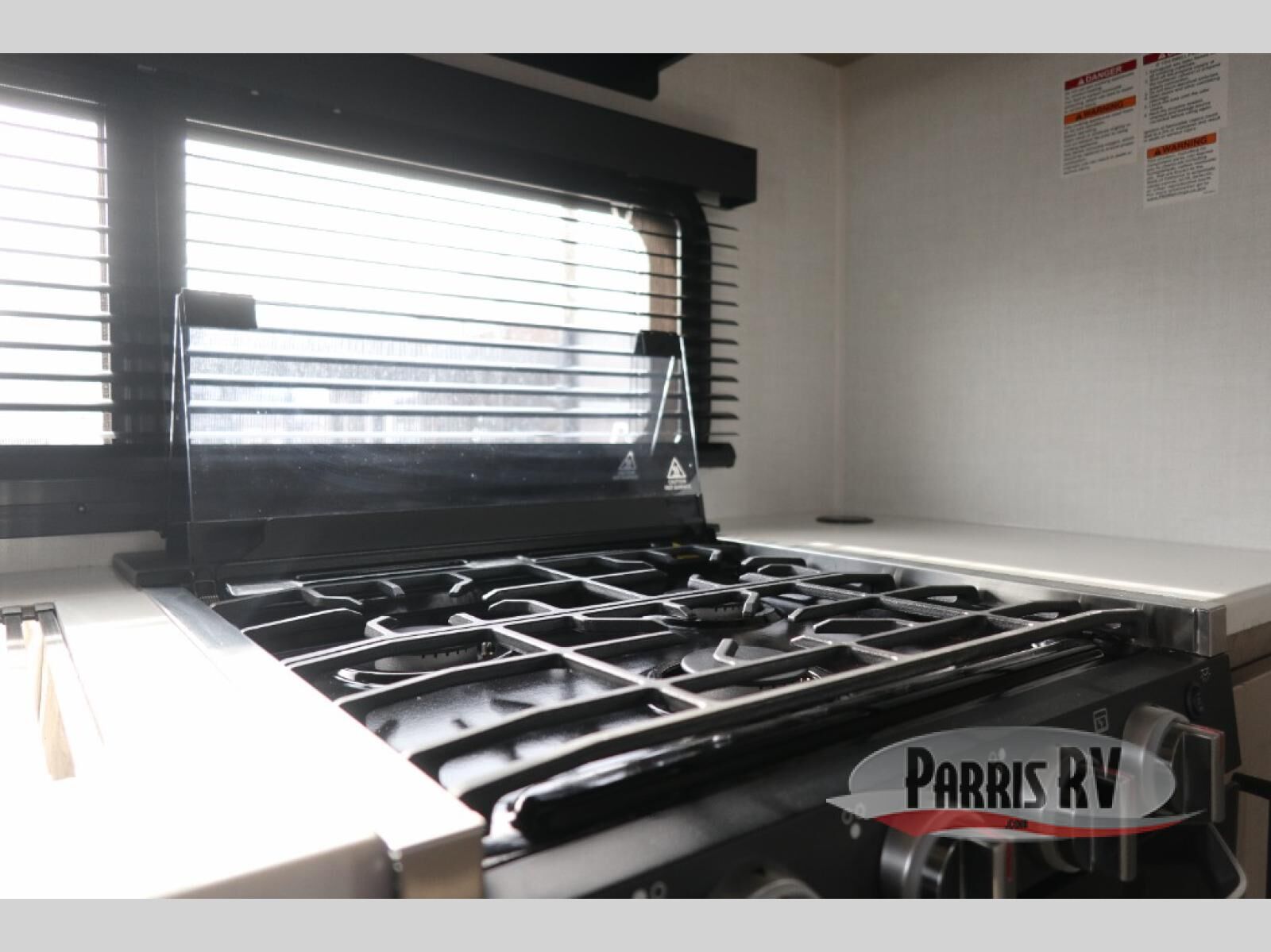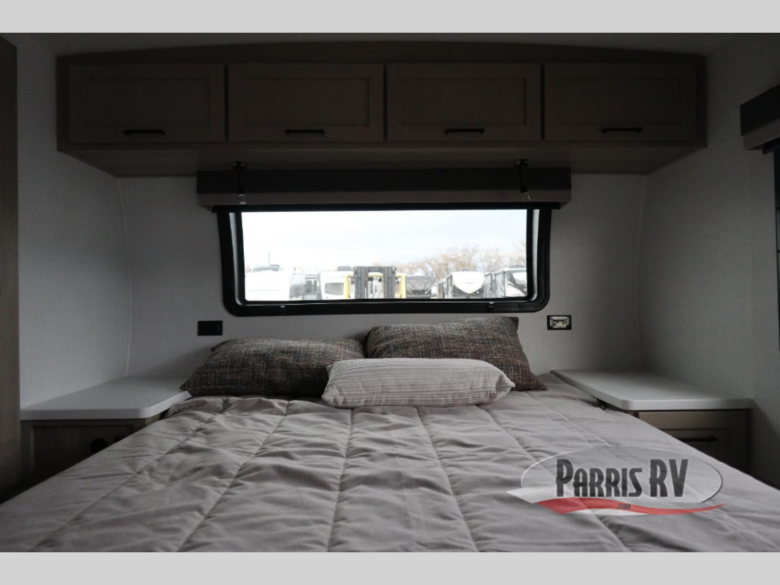 You and your spouse will have a great time camping in this travel trailer! You will have your own RV queen bed to sleep on in the front private bedroom, and an optional TV can be added if you enjoy the morning news in bed. Breakfast can be made on the three burner cooktop in the rear kitchen, or head outdoors to cook on the outside griddle. The 67" theater seating with cupholders will provide a place to relax and dine together, and the spacious walk-through bath will allow you to clean up before you head out for the day. This model includes plenty of storage space, including a pantry for your snacks, a wardrobe slide out in the bedroom, plus a drop-frame pass-through storage for larger camp gear!