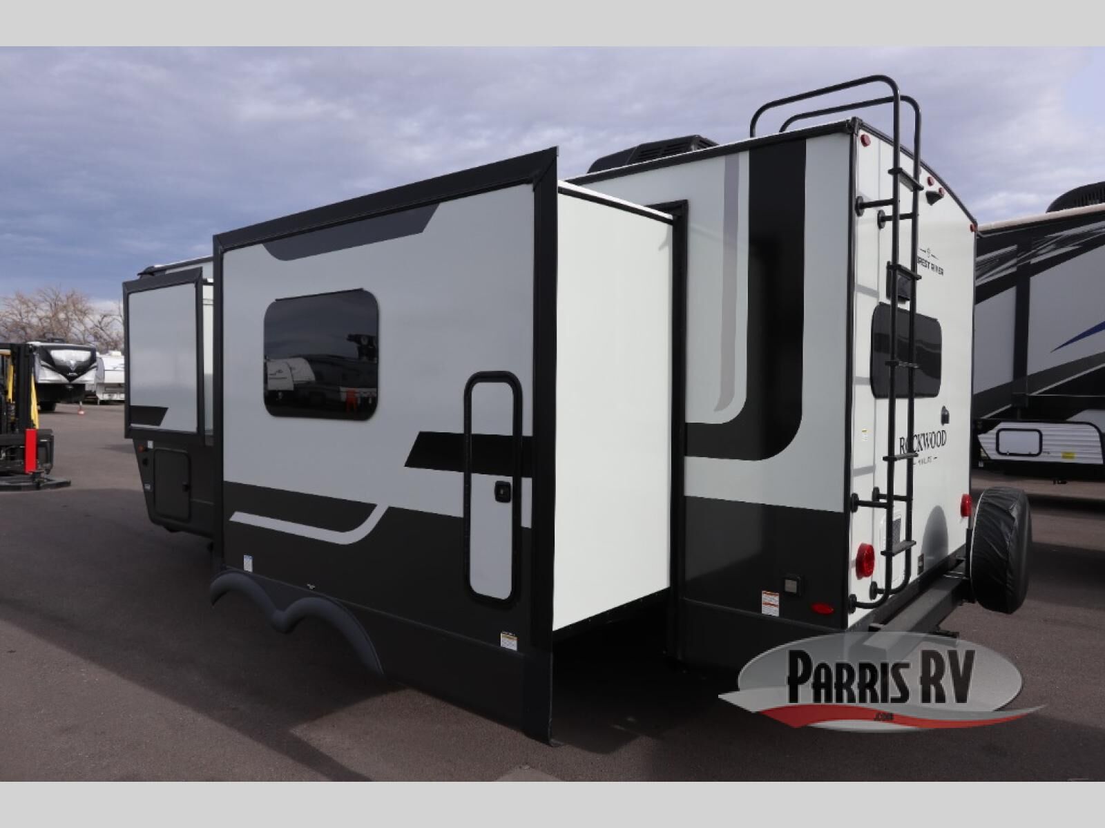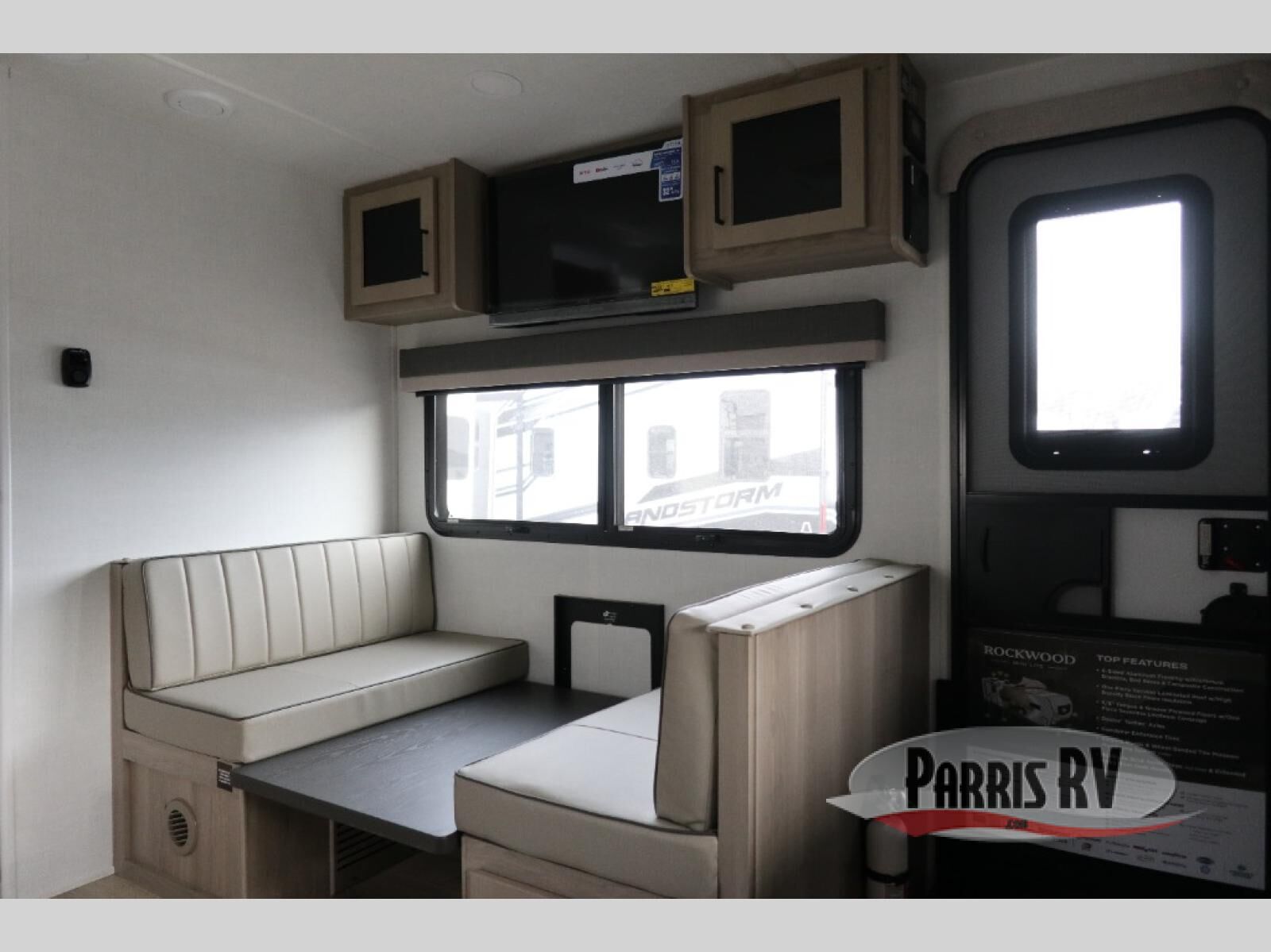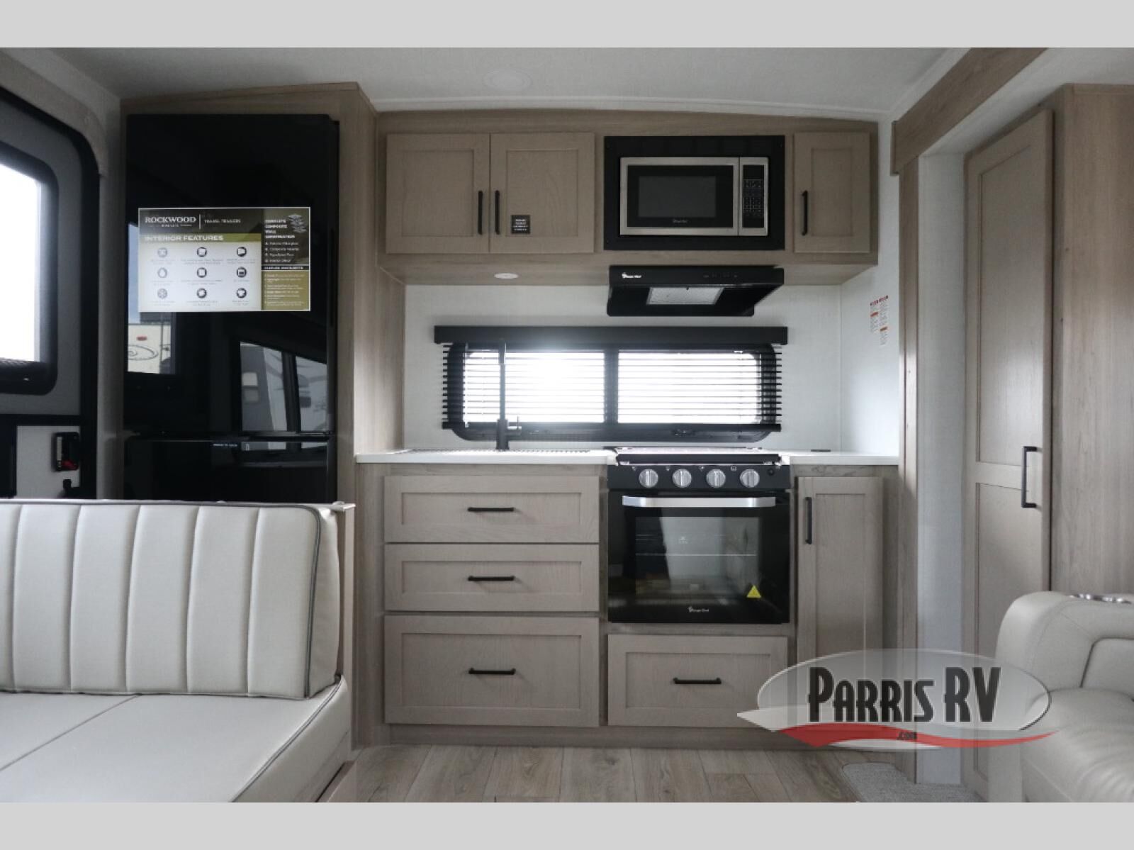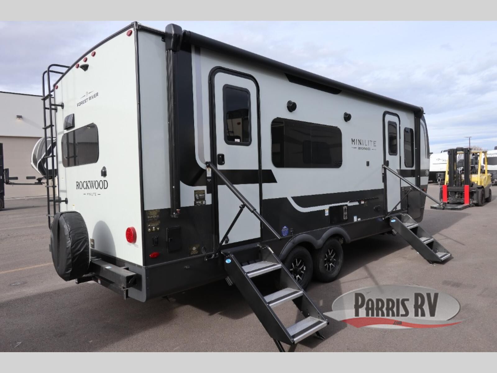 Each Rockwood Mini Lite travel trailer by Forest River is constructed with a fully laminated one-piece walkable roof, sleek frameless windows, and a six-sided full aluminum frame for strength and durability. The 12V thermostatically controlled heated tanks, plus radiant foil in the underbelly will allow you to camp well into the colder months, and the 200W roof solar panel will be perfect for a little off-gridding. Each model includes solid surface kitchen countertops, hidden hinge cabinet doors, roller shades, plus many more interior features. Having an AIR 360+ omnidirectional antenna with WiFi prep on board gives you the option to get some work done if it's needed, and the power tongue jack provides hassle-free set up, so you can enjoy more time relaxing!