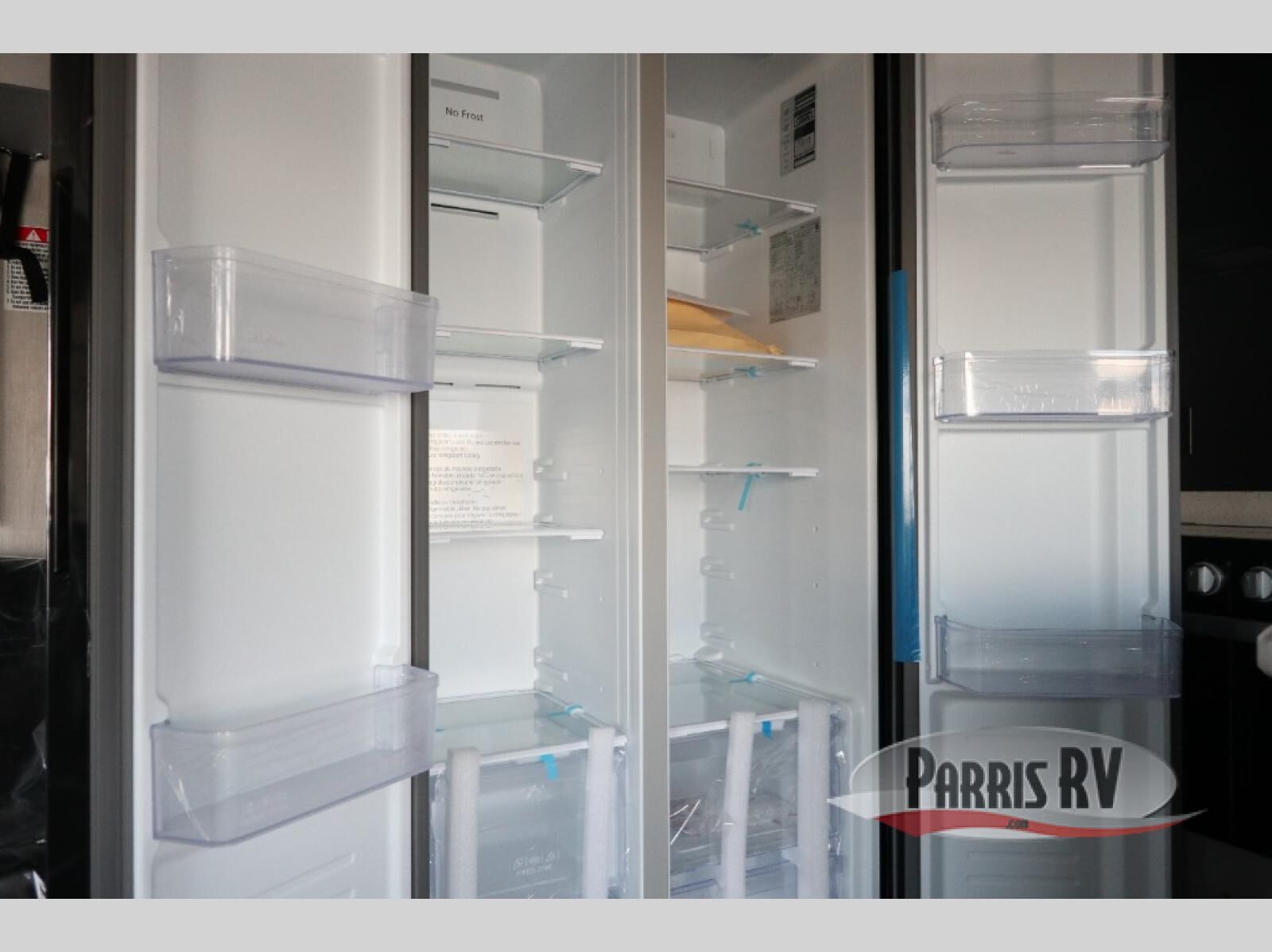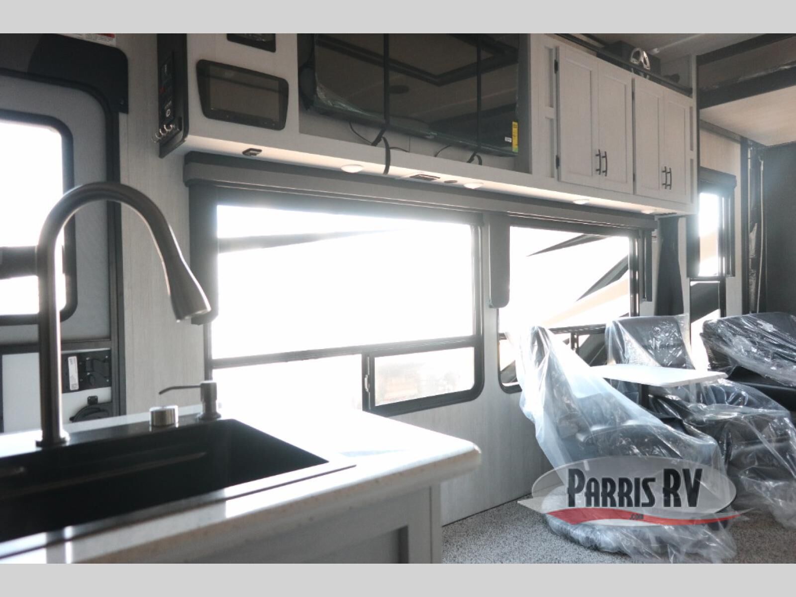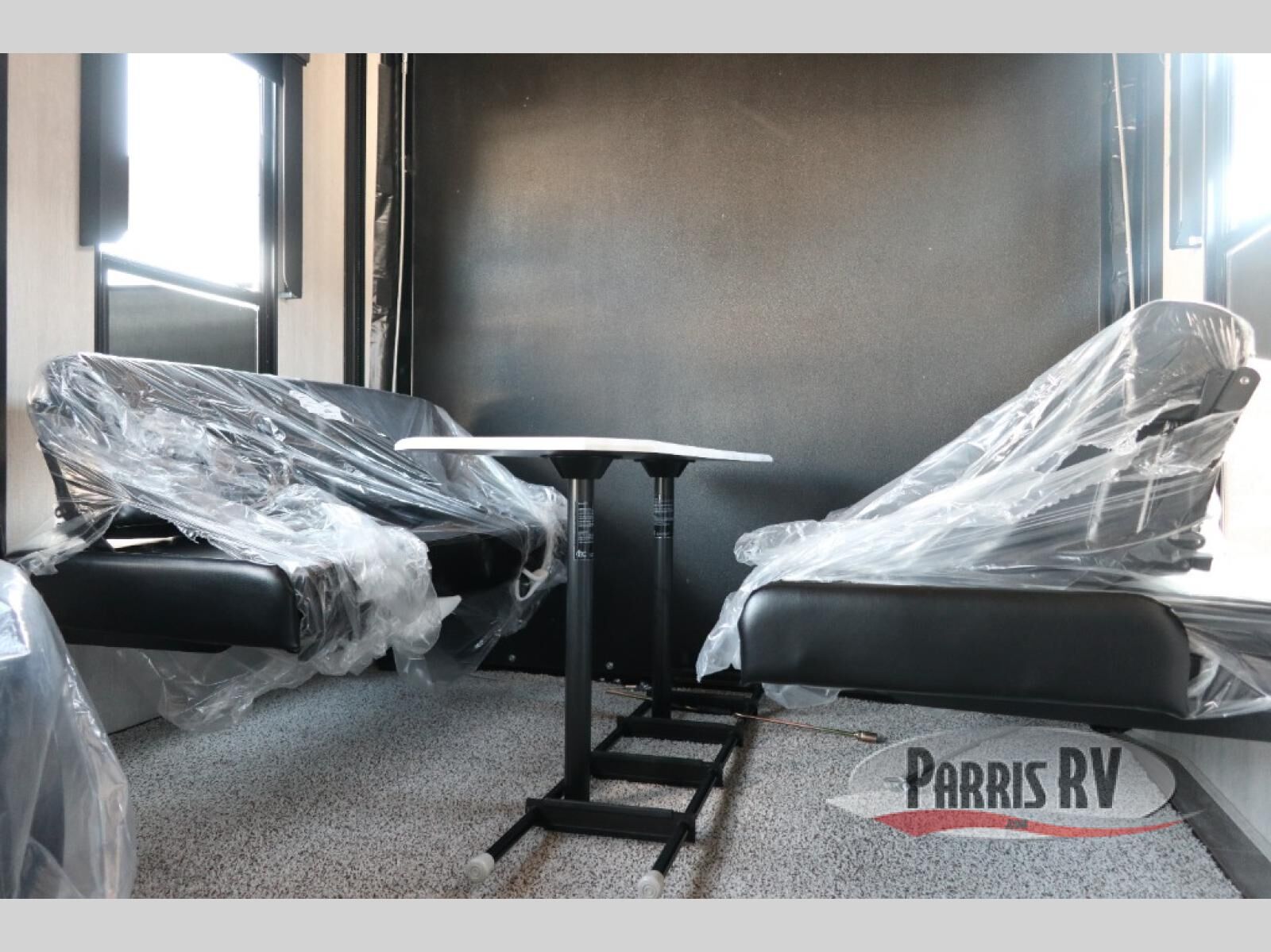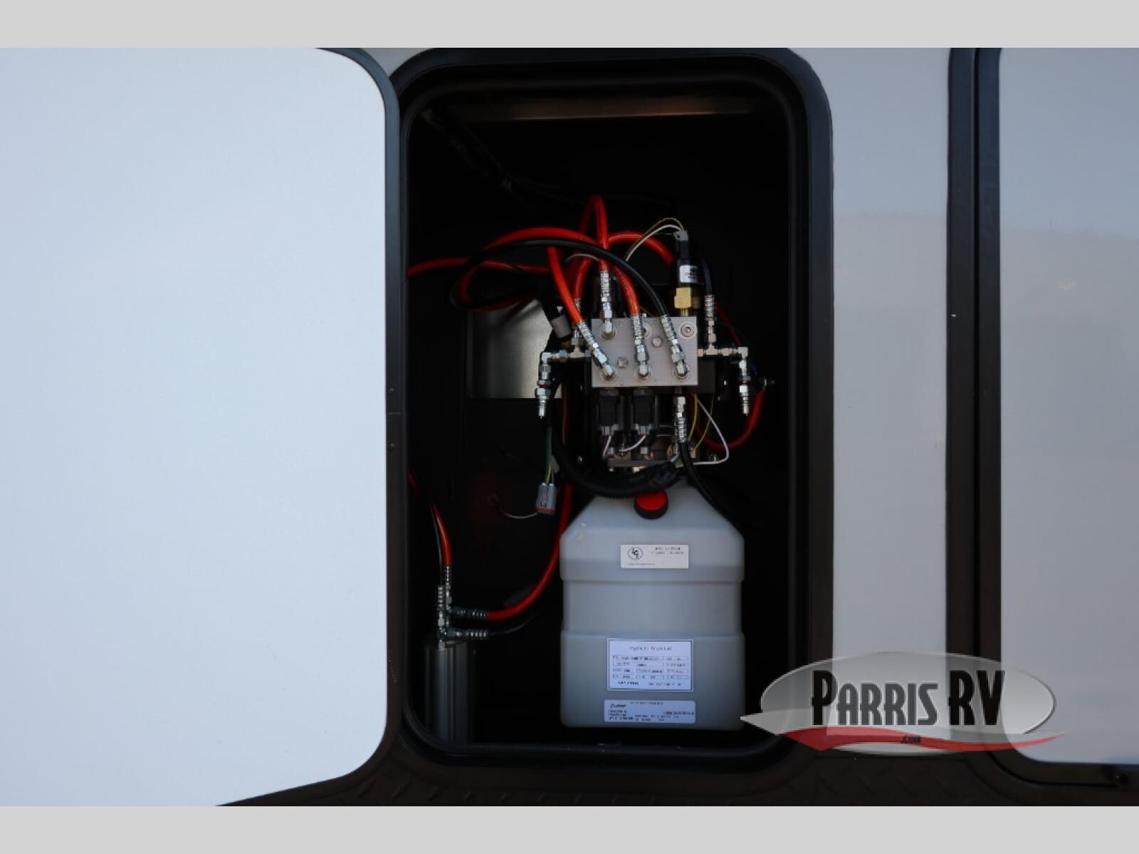 Wherever you decide to camp, this toy hauler is sure to bring fun. There is a front master bedroom with an RV king bed and a nightstand, plus a vanity/wardrobe slide that will provide more space. Your guests can sleep on the power queen bed after the toys are unloaded from the 16' 4" garage, and in the morning, they can relax on the power sofa bed under the top bed. The kitchen includes everything you need each day to prepare meals; a three burner cooktop, microwave oven, and an extra large double door refrigerator. You'll also appreciate the slam-door luggage compartments to store your larger camp gear, the 40 gallon fuel station to keep your toys ready to go, and the power awning with LED lights for an outdoor living space!