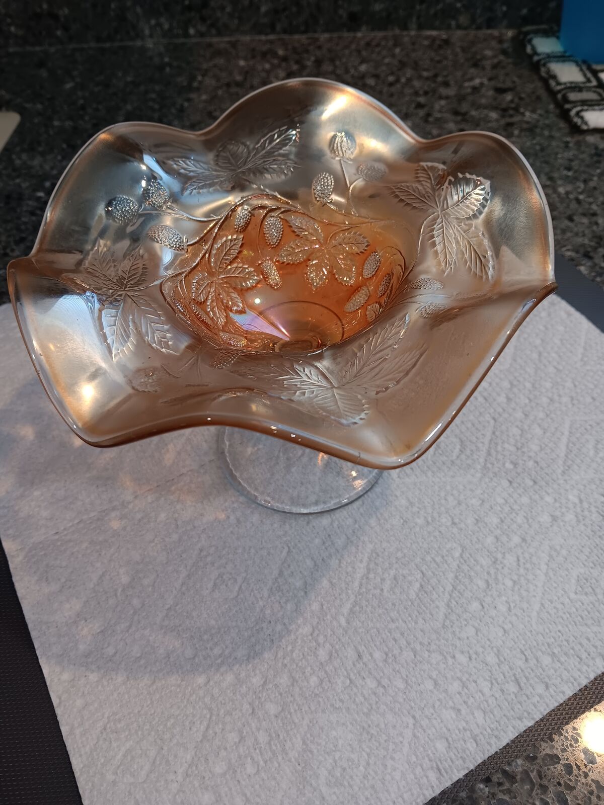 VenmoThis is a Fenton Marigold Carnival glass candy dish with a clear glass stem and foot.