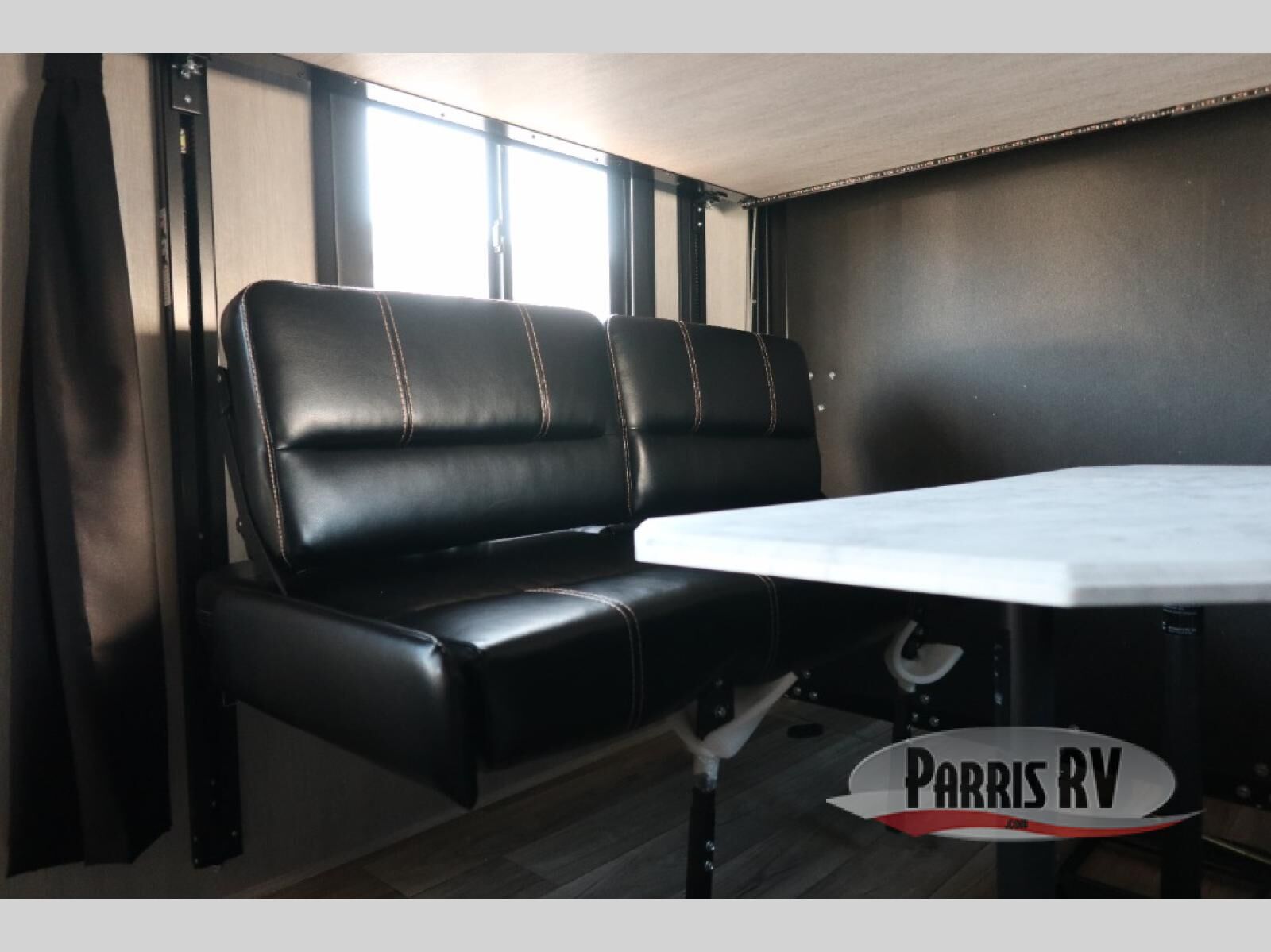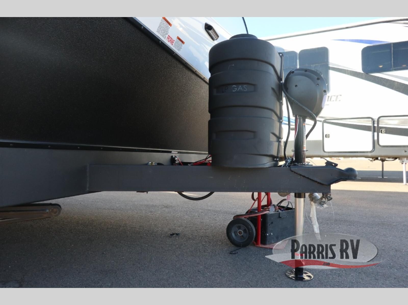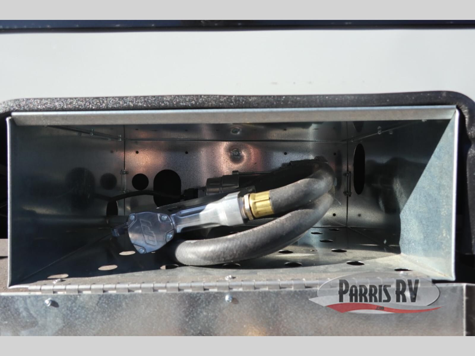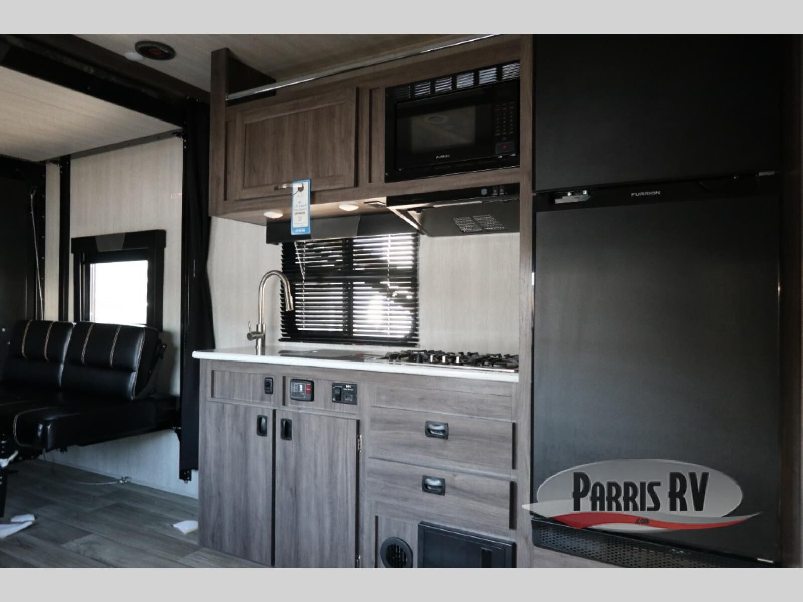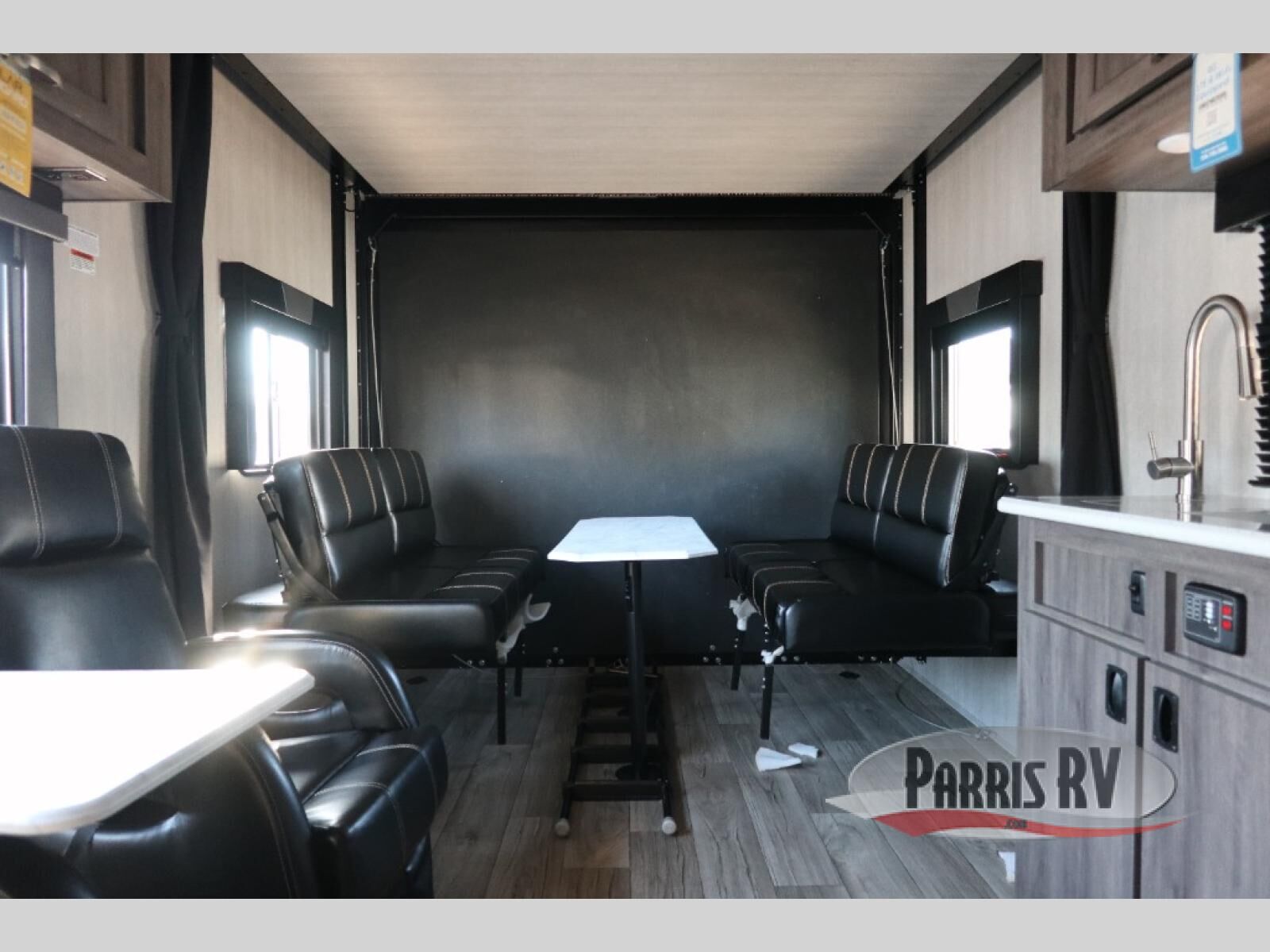 Head to your favorite trails and camp out with this toy hauler! In the rear, there are two swivel rockers to relax on, along with an opposing rear power dinette with a single bed for your guests. Keep your electronics charged with the 12V USB charger and stay connected while off grid with the 200W solar panel. Prepare your best home cooked meals with the three burner cooktop and 10 cu. ft. 12V refrigerator then lay down on the RV queen bed in the front private bedroom after dinner. You can also stay clean with the radius shower in the full bathroom!