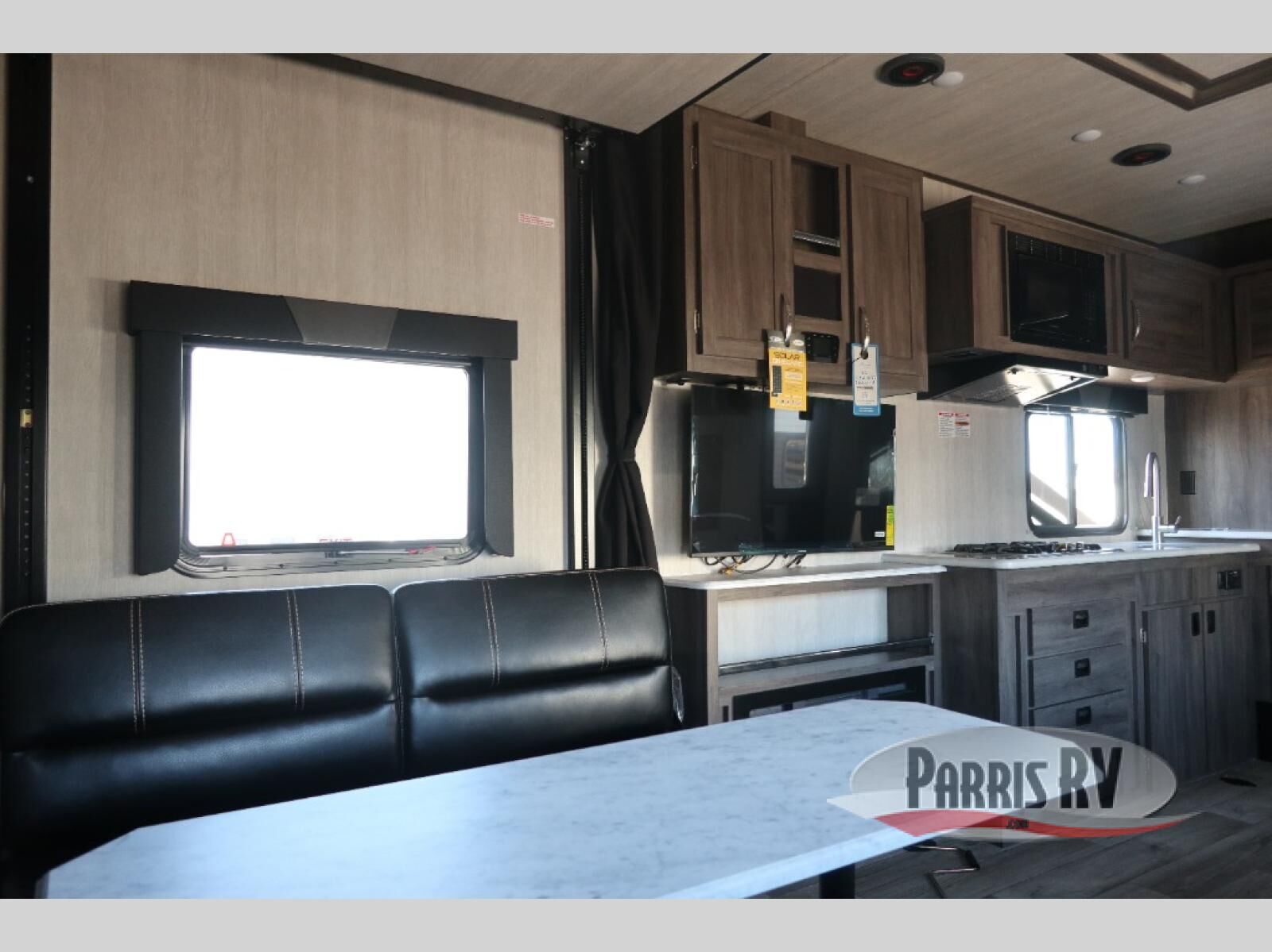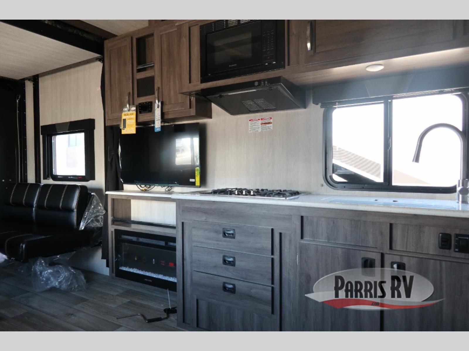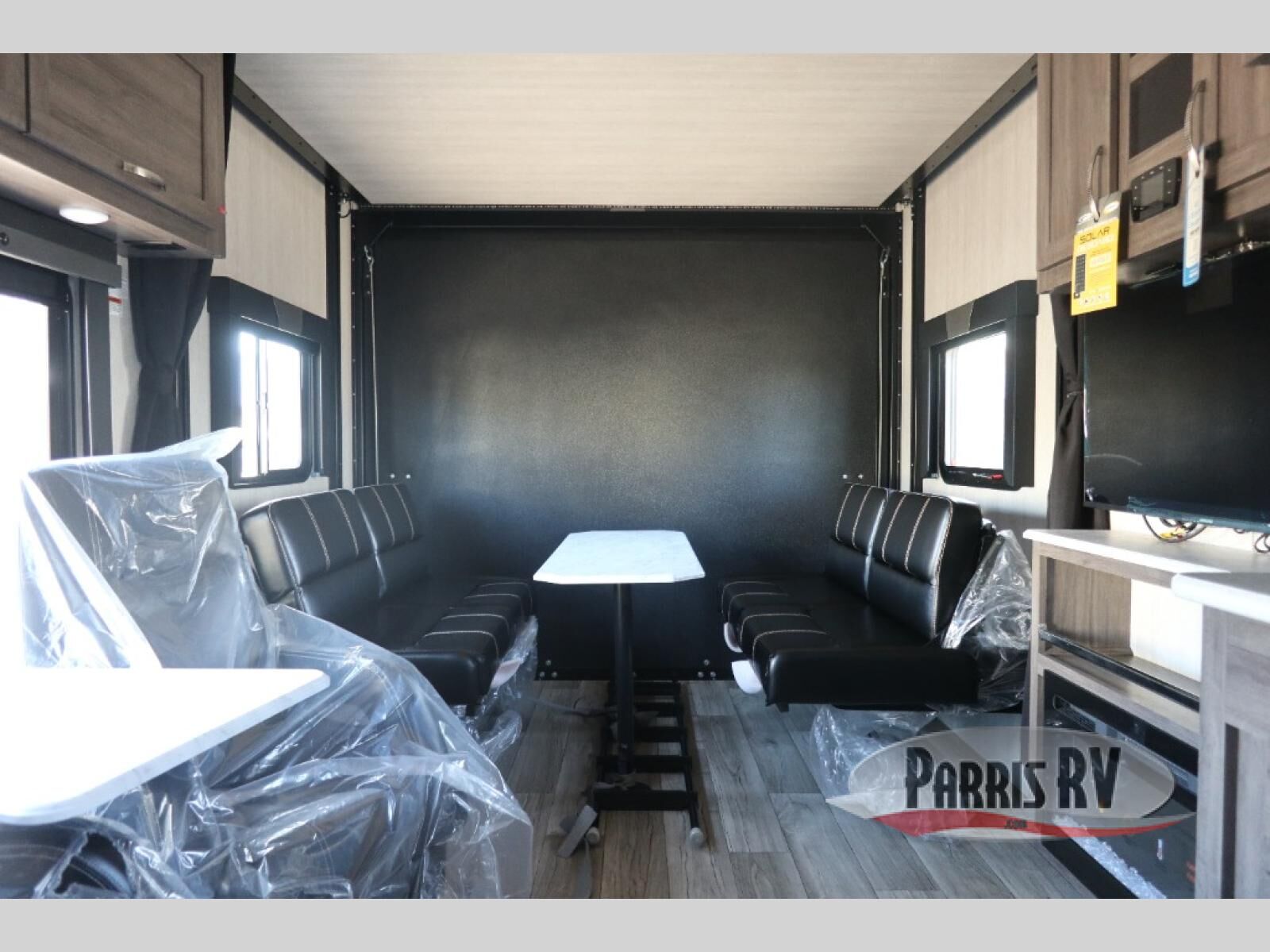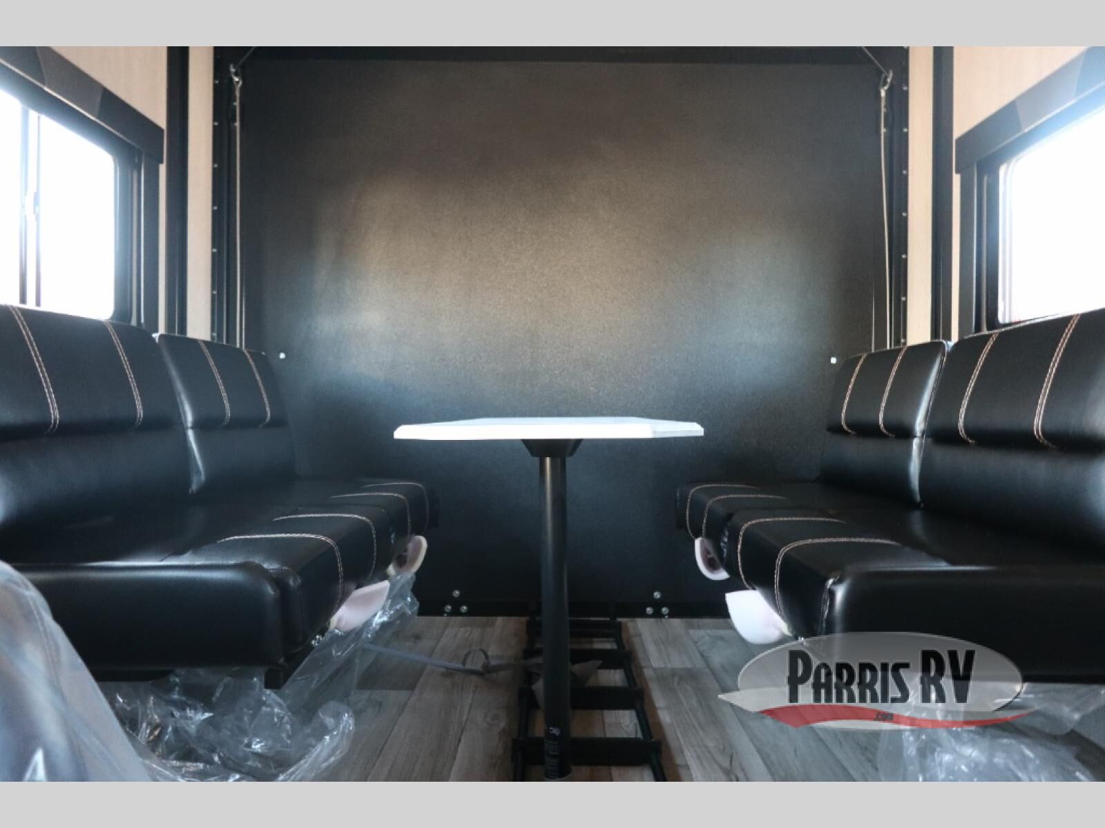 Head for the hills in this toy hauler that can sleep six each night. You'll enjoy the front master bedroom with a RV T-king bed and dual wardrobes, and your guests can sleep on the opposing rear power dinette with a single bed above. There is a full kitchen, complete with a three burner cooktop, a microwave oven, plus a 10 cu. ft. 12V refrigerator to store cold items. You'll also find a 40 gallon fuel station, new modern graphics, and a 102" wide body design to fit your favorite toys!