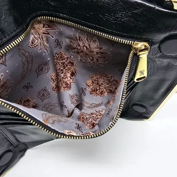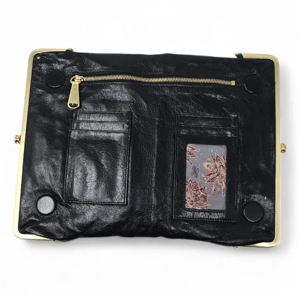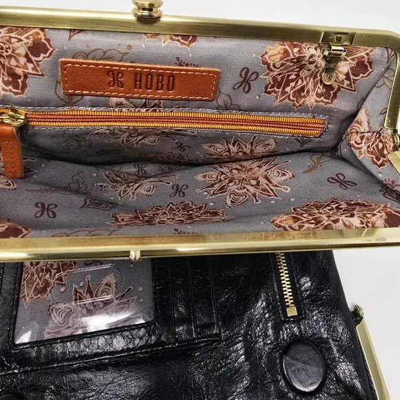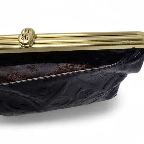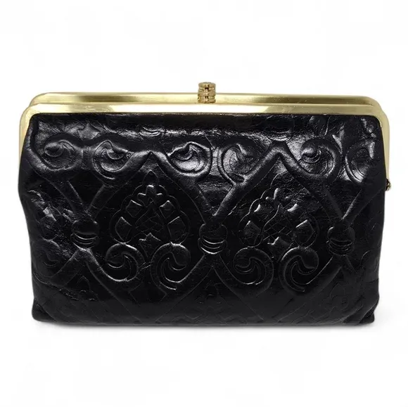 VenmoHOBO Leanne embossed leather crossbody clutch wallet in black with botanical tooled motif.