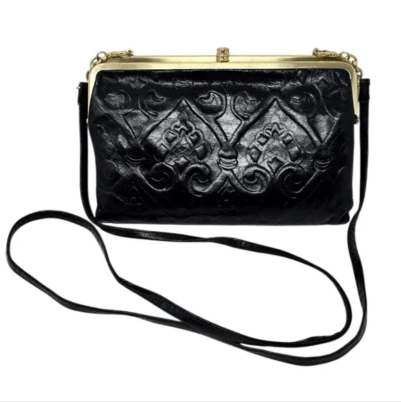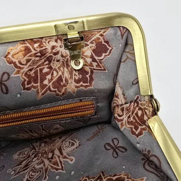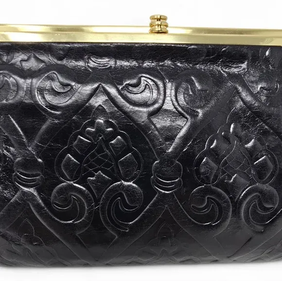 Embossed Tooled leather in botanical motif Removable crossbody strap - leather with gold tone chain Can be worn as a crossbody or clutch - magnets keep strap clasps tucked inside Magnet closure Kiss lock closures Large exterior back slot pocket Gold tone hardware Floral textile lining