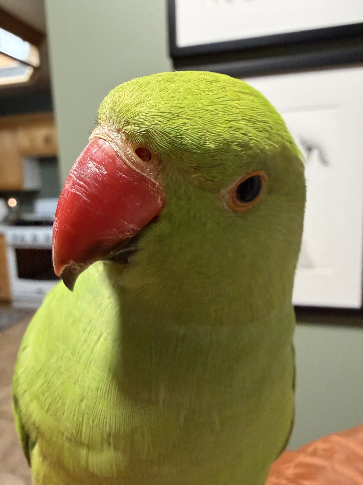 Her diet: she eats quality pellets made specifically for parrots, along with fresh greens, veggies, and occasional fruit. She only gets seeds and nuts as a treat/reward.