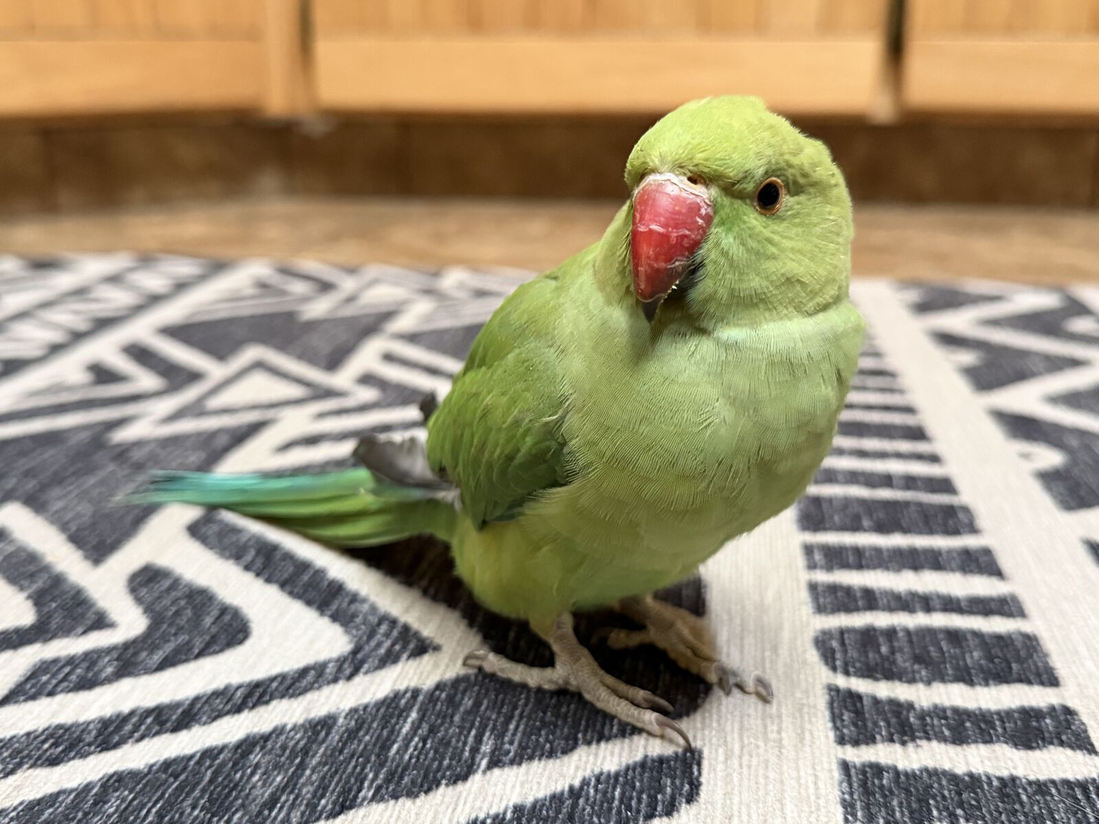 Her wings are currently trimmed for window safety and training purposes. We trim her nails so they aren’t daggers. Juno is very active with a curious personality. When she’s comfortable, she loves to be close to you. She does this cute “hop” from object to object. She’s also quite the chatterbox with different calls, whistles, and chirps.